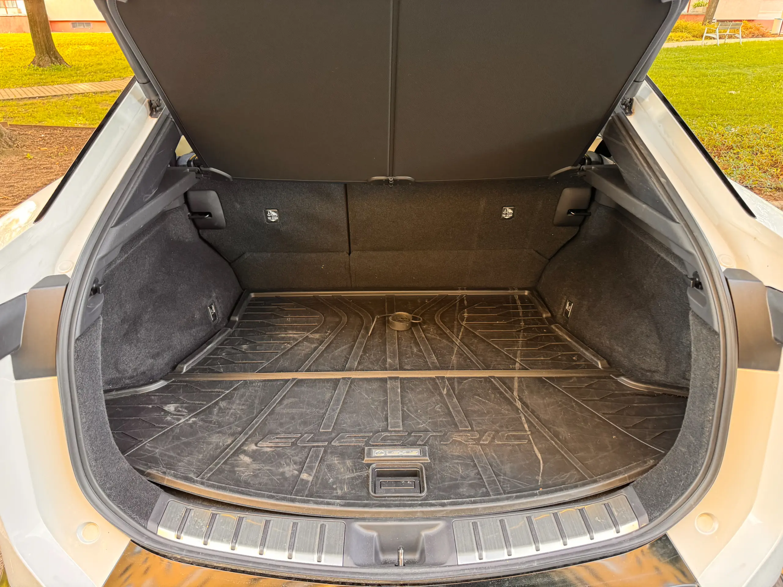 Hátul még ott díszeleg a 300e felirat is, ami arról árulkodik, hogy miért tudták ennek az RZ-nek az árát kedvezőbbre szabni. Ez a jelölés ugyanis azt jelenti, hogy egyetlen villanymotor gondoskodik az autó hajtásáról, és ez csak az első kerekeket hajtja. Cserébe az autó fogyasztása kisebb, hatótávolsága nagyobb. Ereje 204 ló, maximális nyomatéka 266 Nm, és a villany-SUV-ok között a könnyebbek közé tartozik az 1,94 tonnás üres tömegével. Ez természetesen jó hatással van a fogyasztásra, ami a teszt során kerek 18 kWh/100 km-re jött ki városi használatban. Mivel 71,4 kWh kapacitású akkumulátor van benne, hatótávolságban 390 kilométert tudott, ami a gyári kb. 420 km értékhez képest egyáltalán nem rossz, bár ismét hozzá kell tennem, hogy városi használatban. Oszlopról 11 kilowattal töltött, 7 óra alatt csordult tele árammal, de tud 150 kilowattos villámtöltést is.