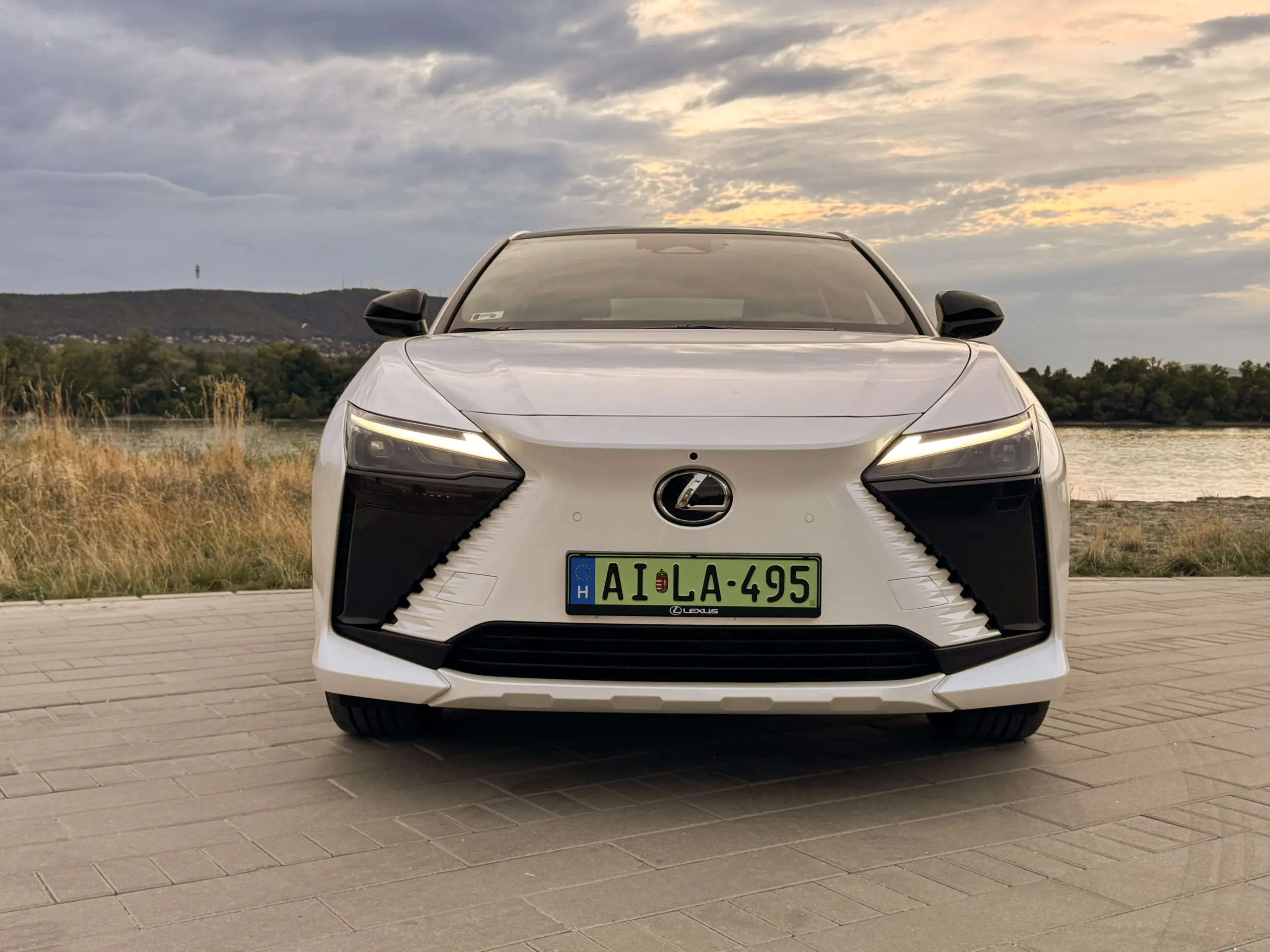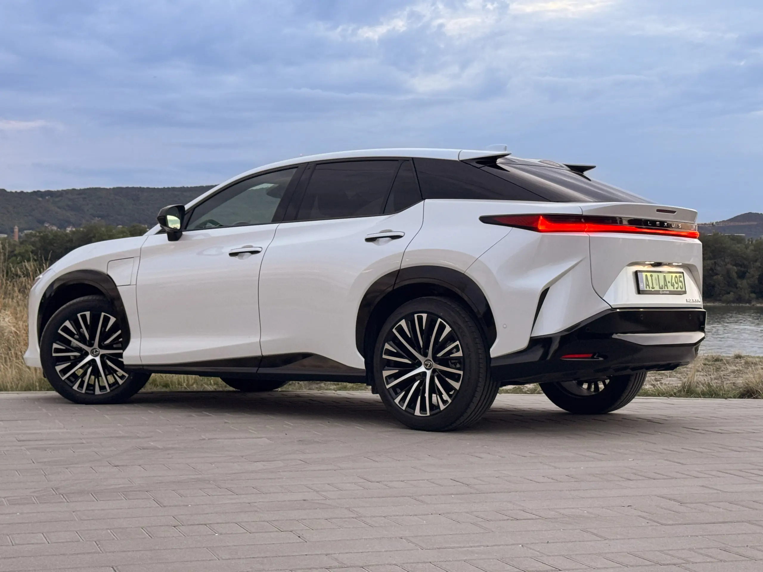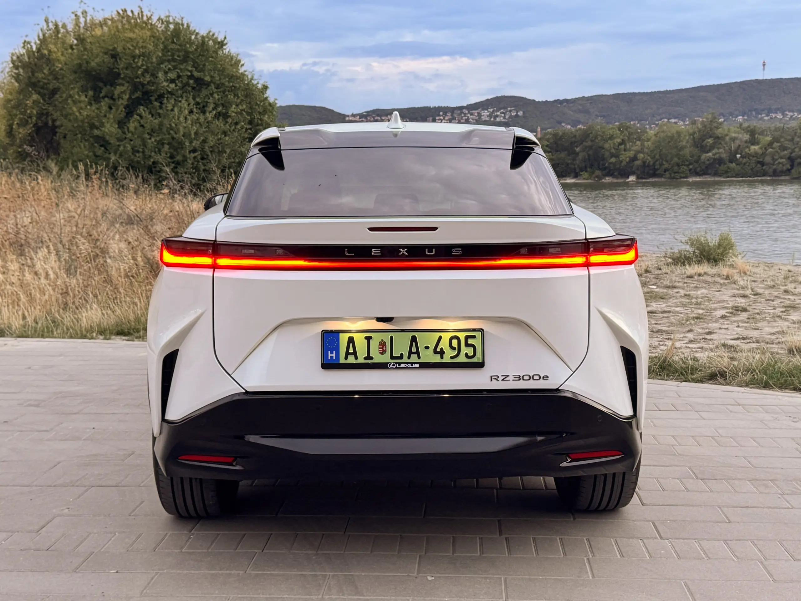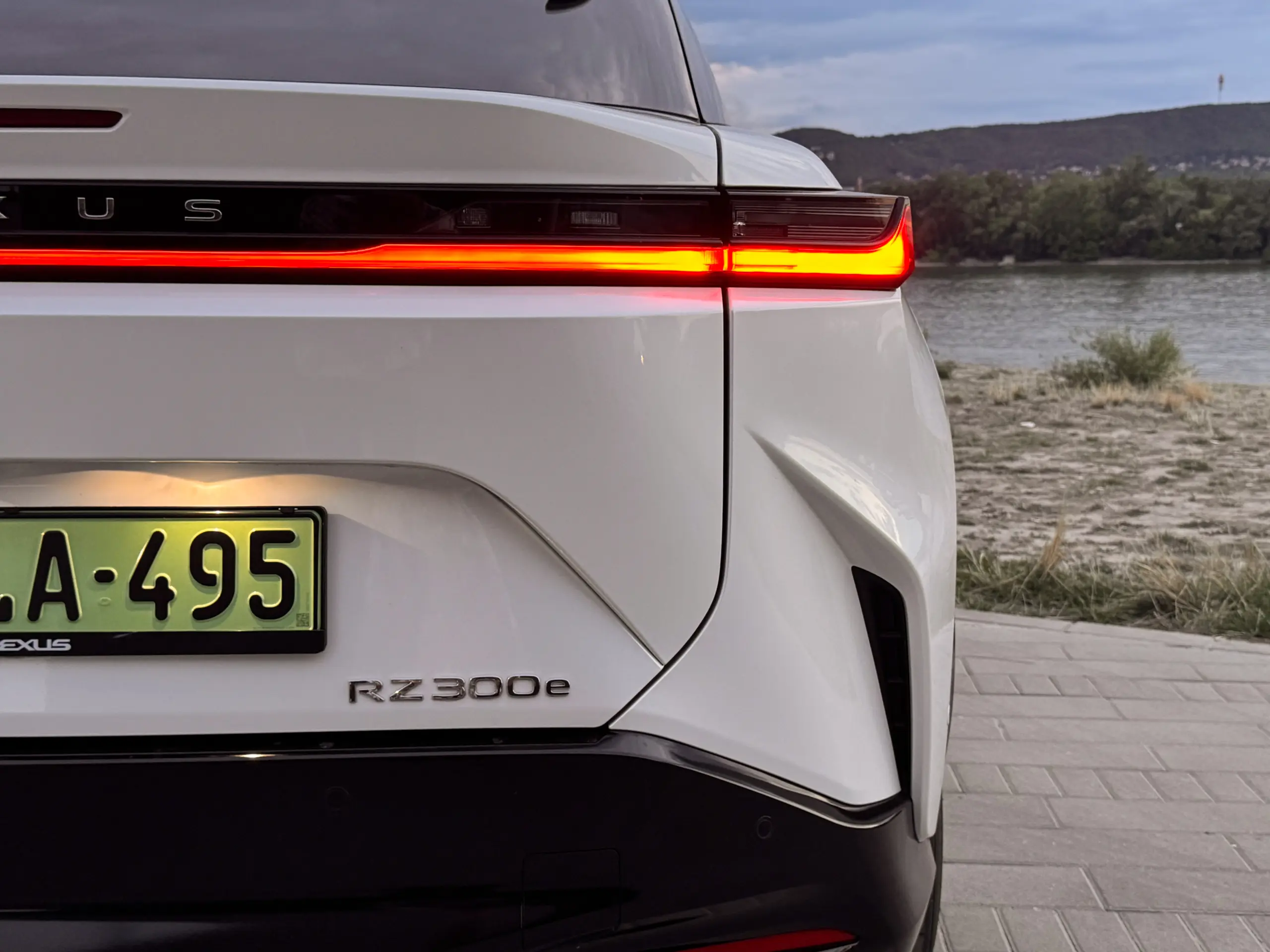 Továbbá ez a modell hozta el azt a leburkolt frontrészt, amely aero-hatékony, de mégis megpróbálja az egykori orsó formát idézni. Kicsit több rácsozással, de a márka jelenlegi formanyelvében ez a megoldás terjed, a tisztán elektromos modelleken pedig nagyon hasonló lesz a látvány, például az új ES-en is. Többeknek egyébként az LFA hátsója jutott eszébe az RZ orráról, ami nem rossz képzettársítás, és ha ilyen legendákra emlékeztet az nem árthat neki. Sajnos a fehér fényezés kissé elrejti a vonalait, de oldalról is nagyon érdekes látvány, szóval szerencsére nem kapkodták el a tervezők, hiába került nagy nyomás alá néhány éve az egész Toyota konszern az egyesek szerint lassú villanyosítás miatt. Ezeknek az "egyeseknek" nem lett igazuk,, halomban állnak az eladhatatlan elektromos autók világszerte. Ugyanakkor ezért létezhet ez a kedvező árú RZ verzió is, amelynek hátsója is tipikus Lexus a teljes szélességben végigfutó fényhíddal. Feltűnő, de ízléses. Elég nagy SUV - az NX és az RX közé ékelődik - de nem érezni olyan tolakodóan nagynak, mint mondjuk néhány német prémium SUV-ot.