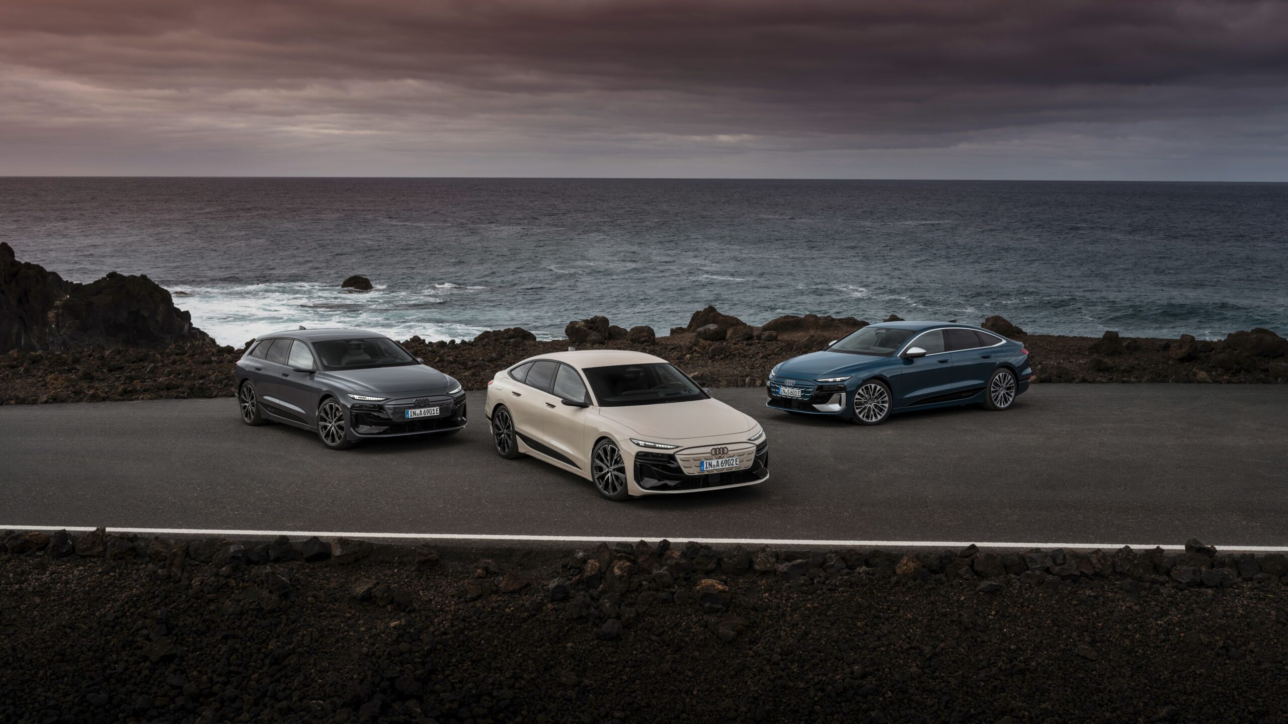 Egymás mellett az S6 és az A6 Sportback, valamint középen az A6 Avant. Nem véletlen a töltőoszlop mindegyik mellett, hiszen egyikben sem dolgozik belsőégésű motor