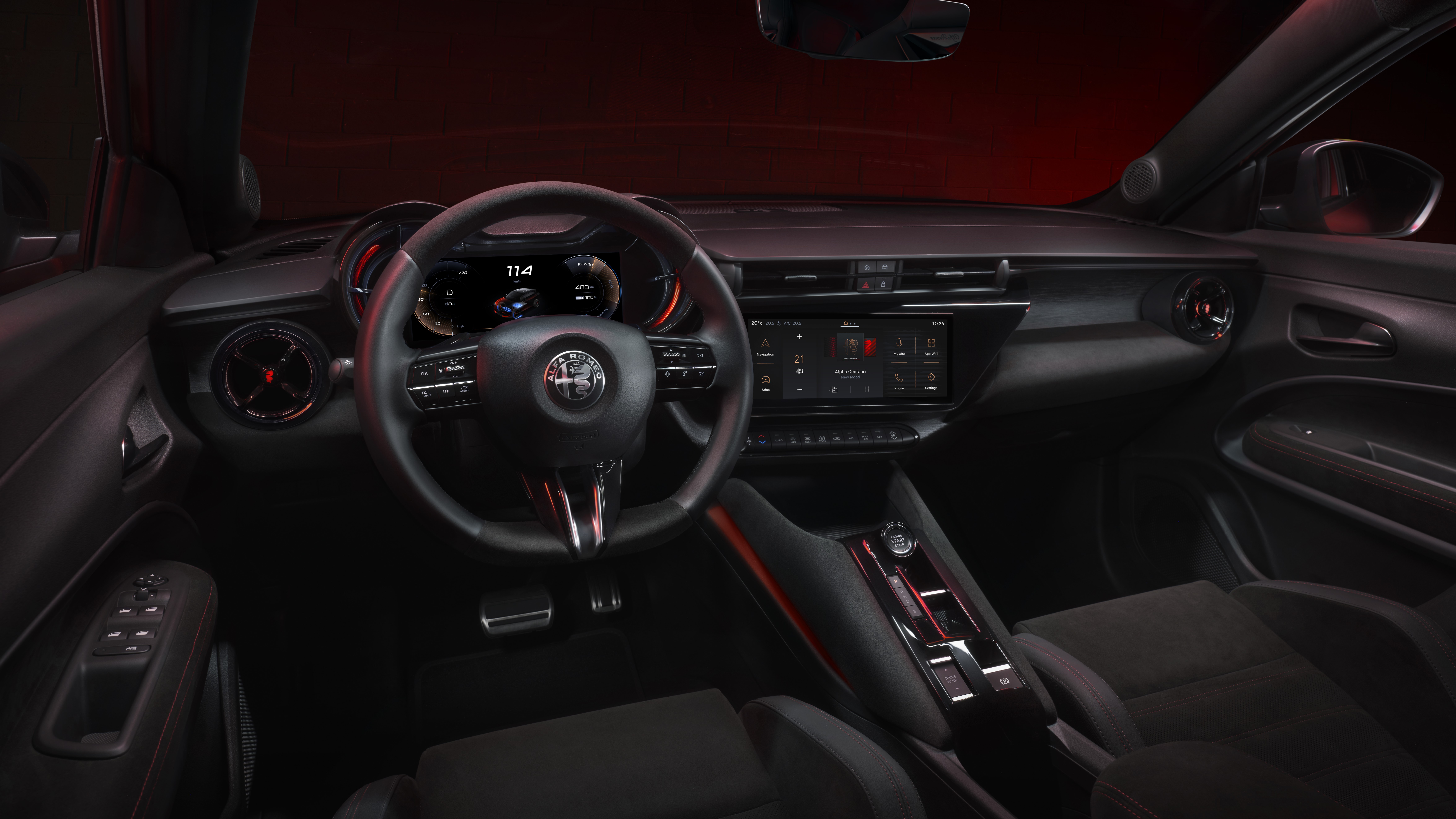 A beltérben 10,25 colos infotainment képernyőt és prémium anyagokat találunk, itt egy jóval hagyományosabb Alfa Romeo dizájn uralkodik. Nem maradhat el a háromágú sportkormány és a sportülés sem, ám a csomagolás alatt egy praktikus kis crossover lapul. Erről a 400 literes csomagtartó is árulkodik, amely kiegészül egy töltőtartóval is a gépháztető alatt az elektromos változatoknál.