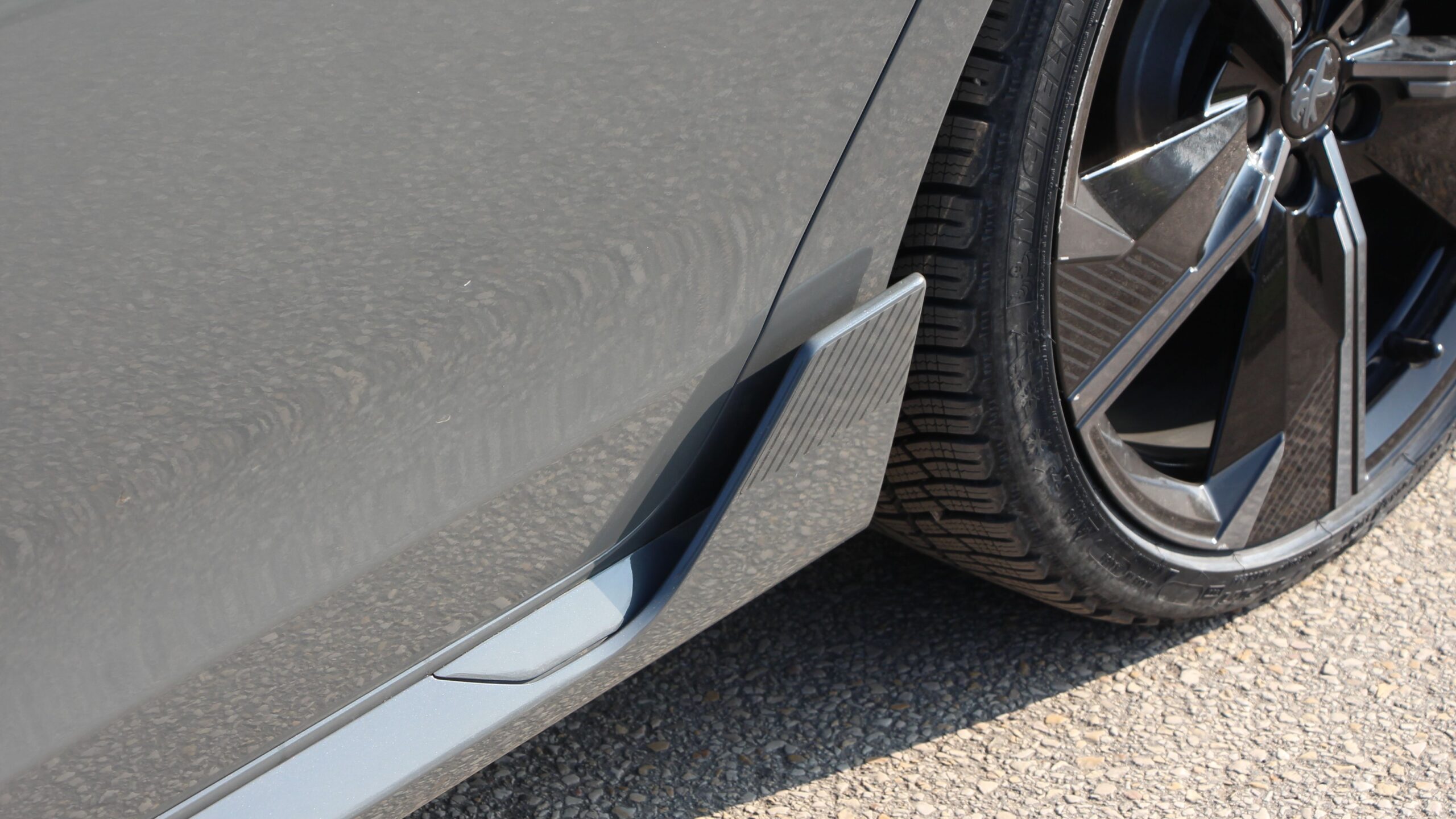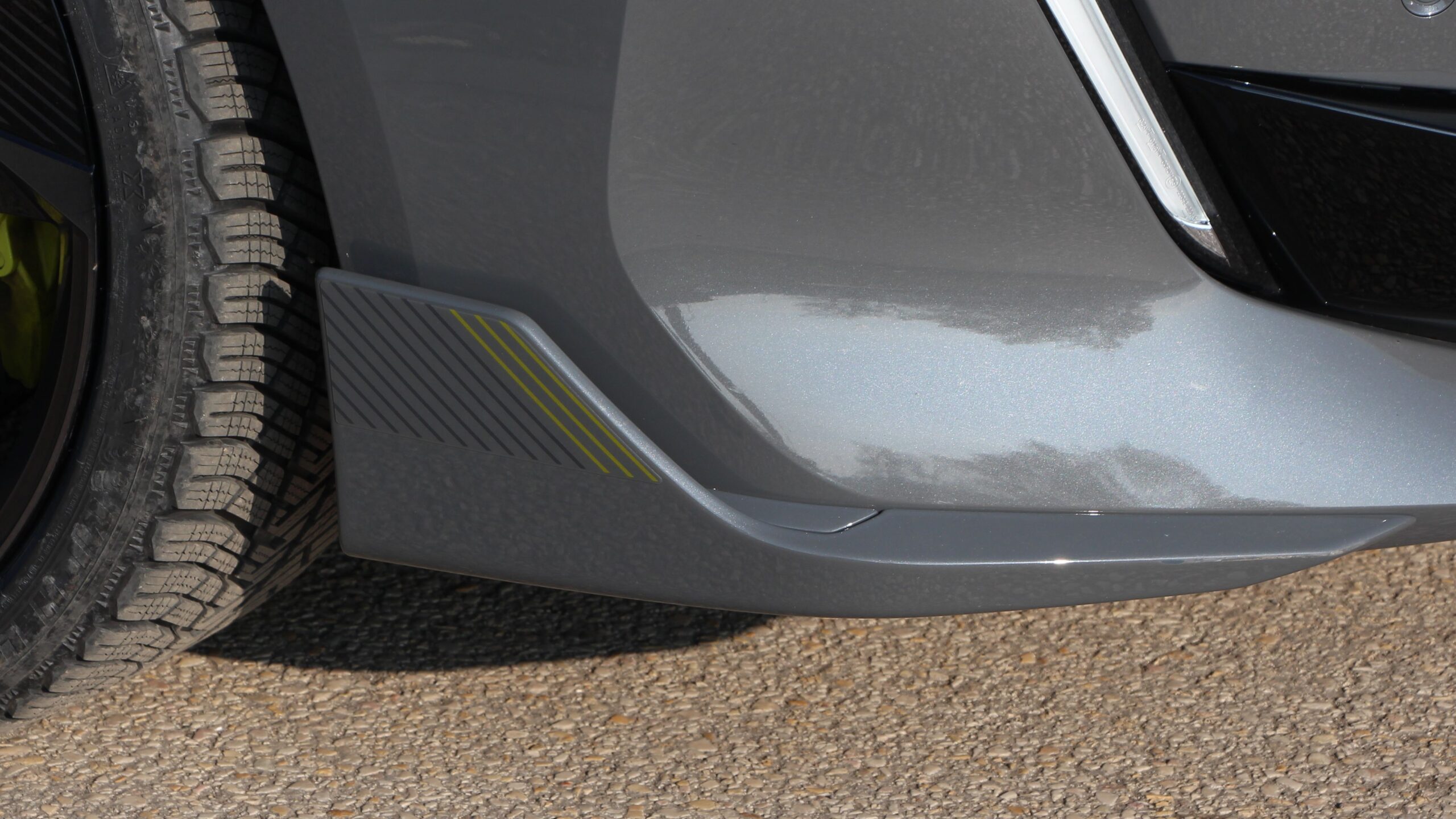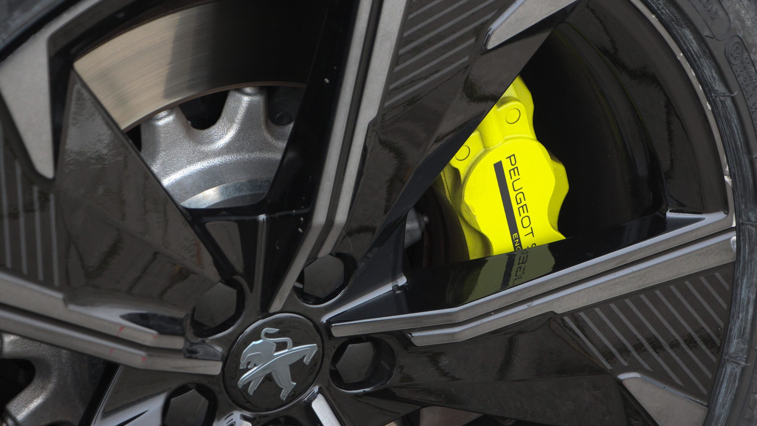 A vérpezsdítő hangulat alapja a Selenium szürke fényezés a kéttónusú, 21 colos felnikkel. Bár leginkább feketék, betétjei műanyagok. Emlékeztetnek az úgynevezett "aero-felnikre", amelyeknek a légellenállás, a káros légörvények csökkentése a célja. Nem ritka ez a villanyautókon, hibrideken, de itt olyan szépen oldották ezt meg, hogy nem ment a sportosság rovására. Jól jönnek ehhez a rikító zöld féknyergek elöl (kár, hogy hátul nem ilyenek), amelyek jól passzolnak a PSE három csíkból álló, zöld logójához. Ezek felbukkannak a sárvédőkön, illetve az autó orrán és tomporán a fekete típusjel mellett. De az első lökhárító is kapott neonzöld díszeket, illetve egyedi a hűtőmaszk is. Már ennyitől jóval egyedibb lenne az átlagos 508-asoknál a PSE, de ott vannak még a kis légterelő-toldatok a lökhárítókon, amik megkoronázzák az egészet. Leginkább ezektől kapja azt a versenyautós hangulatot, amitől a motorsport rajongók elégedetten csettintenek.