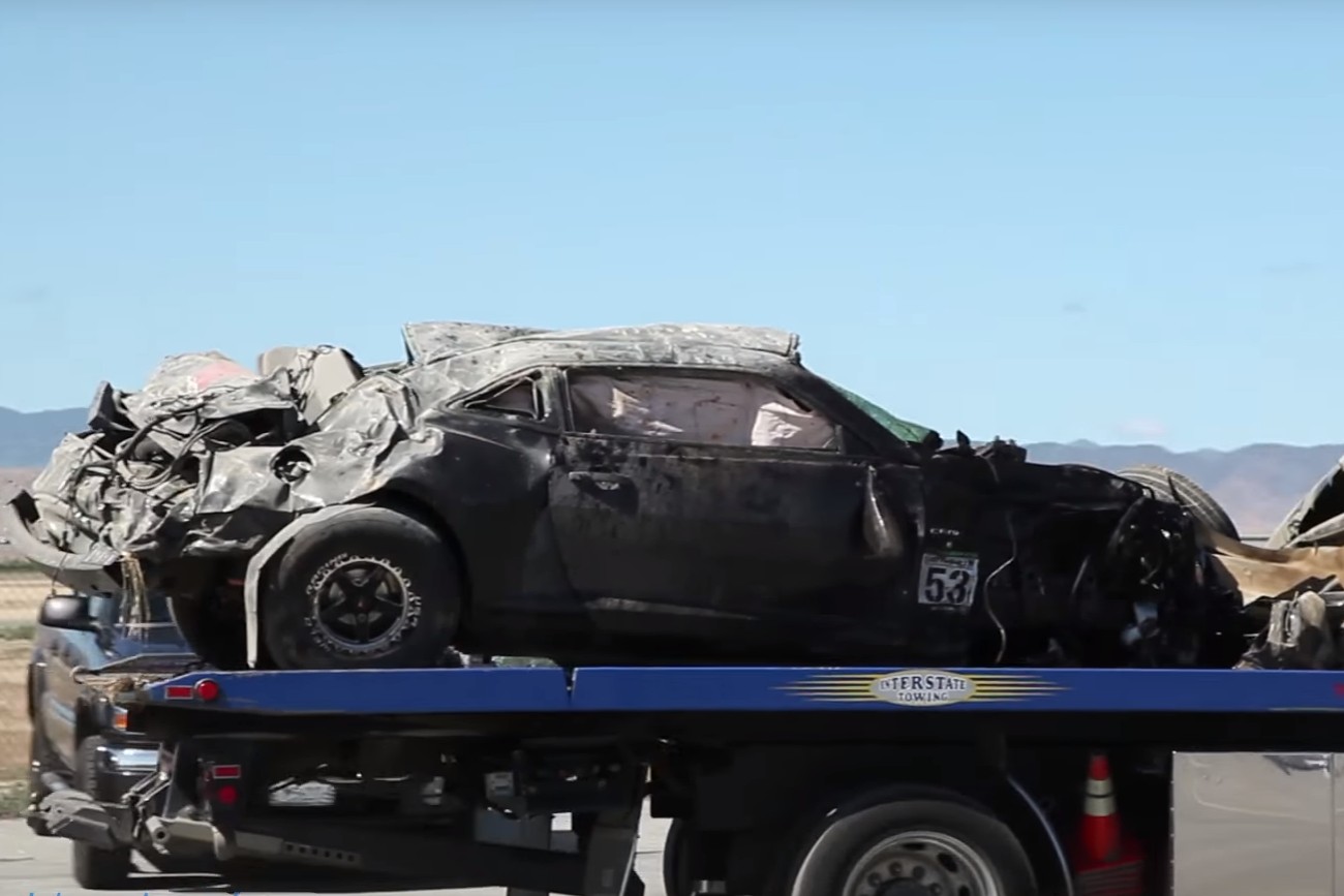 Nem sok maradt belőle, szerencsére jól felkészített kocsi volt, de mázli is kellett hozzá, hogy túléljék az 1800 lóerős Camaro fejreállását