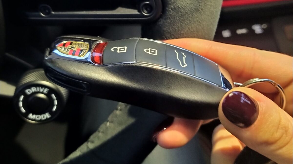 Apró részletektől még izgalmasabb a Macan GTS. Ilyen például a kulcs formája, illetve a vörös hátterű fordulatszámmérő