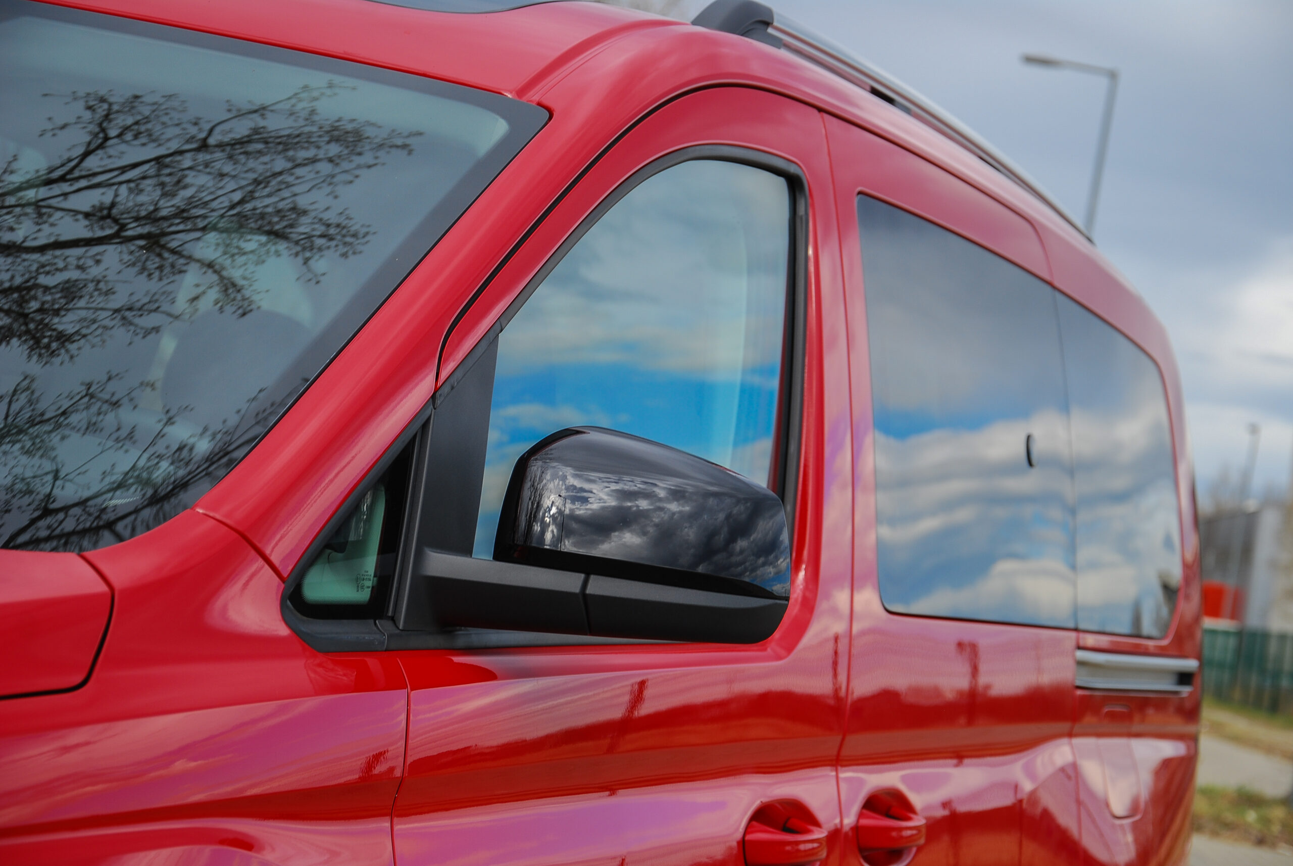 De amúgy is akadnak furcsa részletei – ez a csomagtér ajtó dizájn nagyon bután mutat – igazán lerakhatták volna azt a Ford emblémát a rendszámtábla fölé, meg a Tourneo felirat tipográfiája sem egy főnyeremény. De pl. a fényképész objektívje is jó érzéssel találta meg azt a miniatűr oldalsó irányjelzőt amit szerintem valami elektromos rollerre szánhattak eredetileg, annyira eltűnik a nagy fémfelületen. Plusz az is elég képzavar, hogy akkor most mit krómozunk meg mit nem – elől meg hátul is van egy kis krómbetét, de pl. a visszapillantó tükör háza vagy a hátsó fényszóró már konzekvensen fekete műanyag. Én nem vagyok sem fényes króm, sem műanyag párti (mindkettő tábornak megvan a maga keresztje), de ez a keverék „egy kicsit ebből – egy kicsit abból” nem igazán eredményez egybefüggő arculatot.