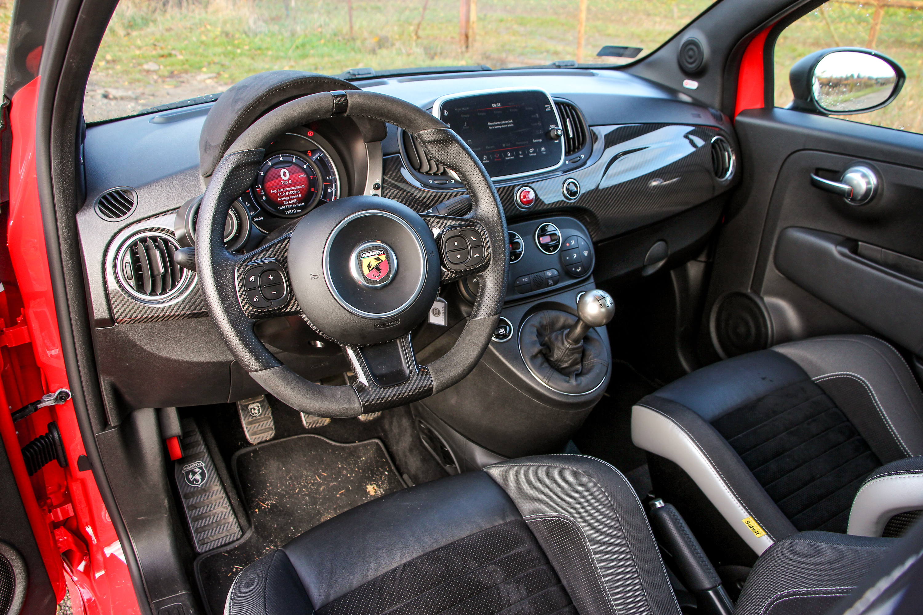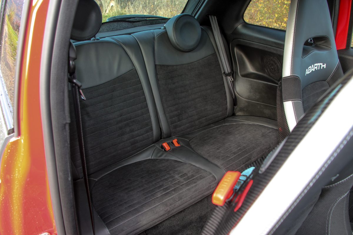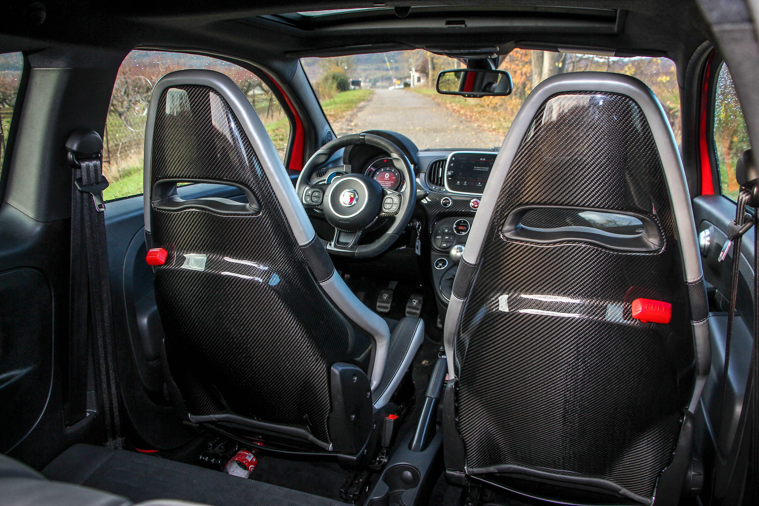 Kicsattintjuk a szabvány Fiat bicskakulcsot, amin ravasz módon kicserélték az emblémát a skorpiósra, bedugjuk a helyére - itt nem is zavaró, hogy kulcsos az indítás – és felébred az őserő. Az a legszebb az egészben, hogy amíg el nem indulunk, senkinek nem esik le, minek van ekkora hangja, parkolóházban szabályosan fáj a fülnek, ahogy szól. 5500-nál adja le a csúcsteljesítményt, de még mielőtt elindulnánk, érdemes felpörgetni párszor nyitott ajtóval, mert bizony durrog a kis méregzsák, nem is akárhogy. Adrenalinszint emelkedik, a tenyerünk izzadni kezd, a jobb lábunkkal meg már tipornánk a gázt, de előbb a kötelező körök, ha már ilyen frankó, ráadásul Sabelt kagylóülésbe huppantunk.