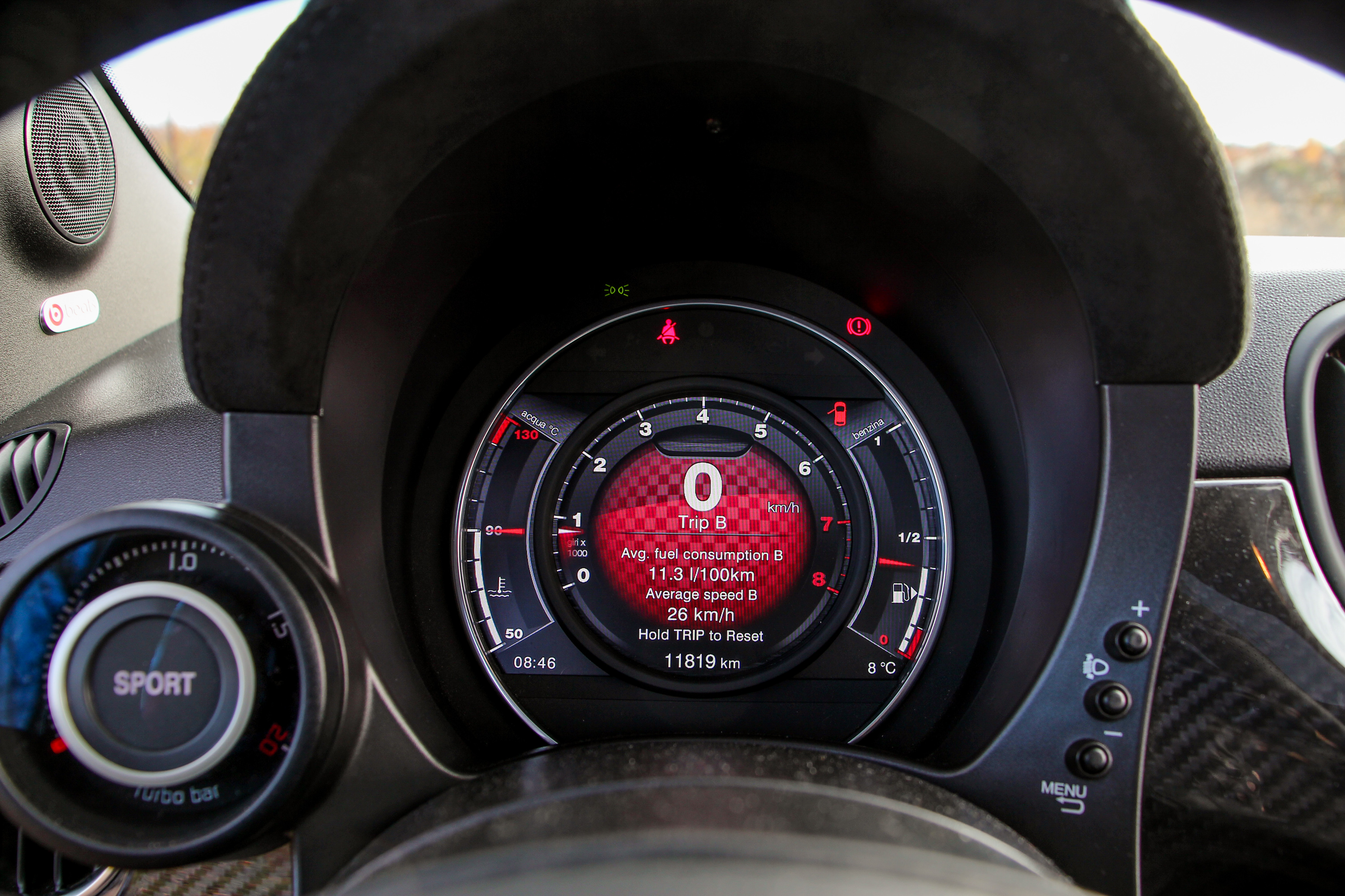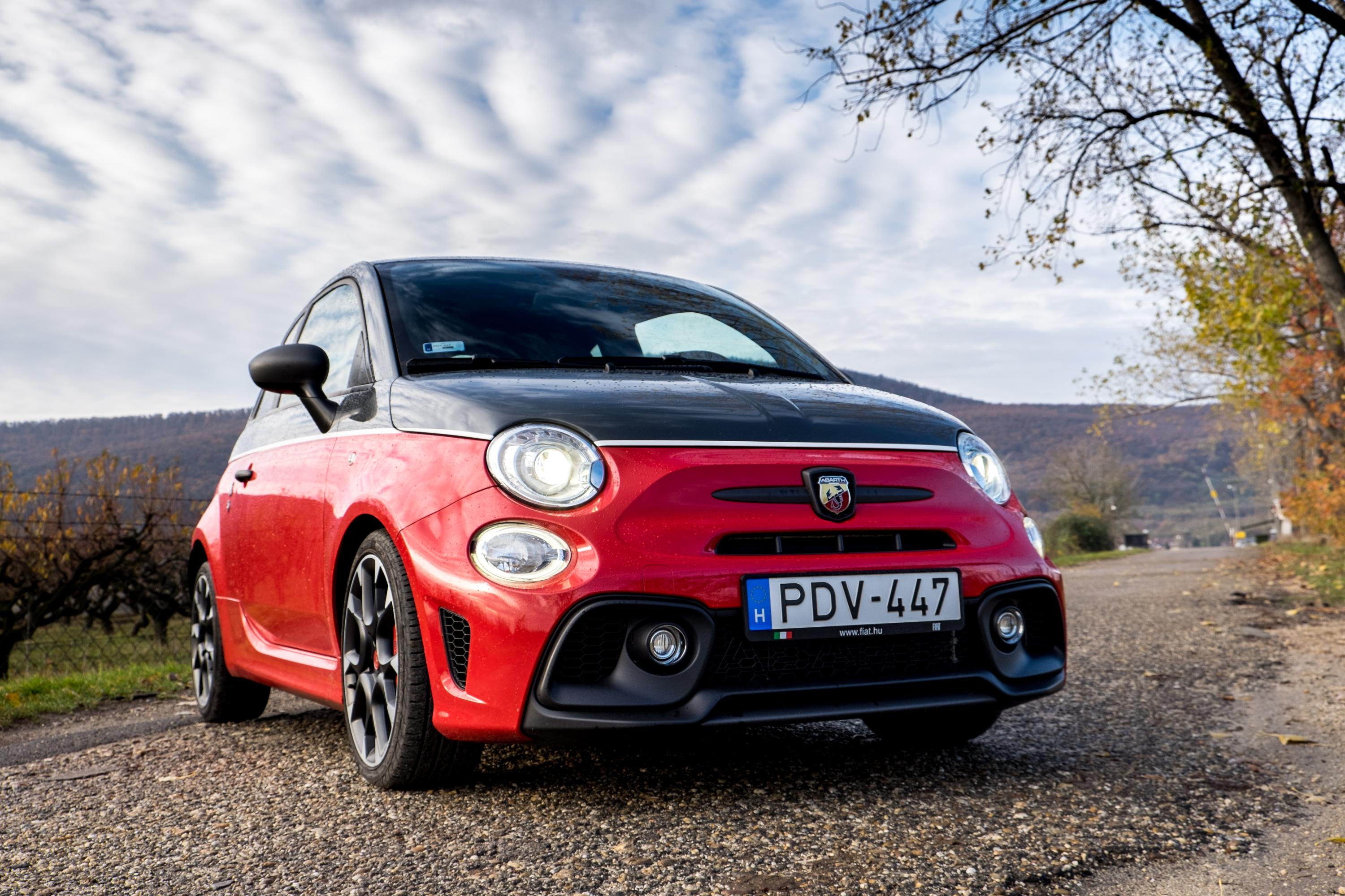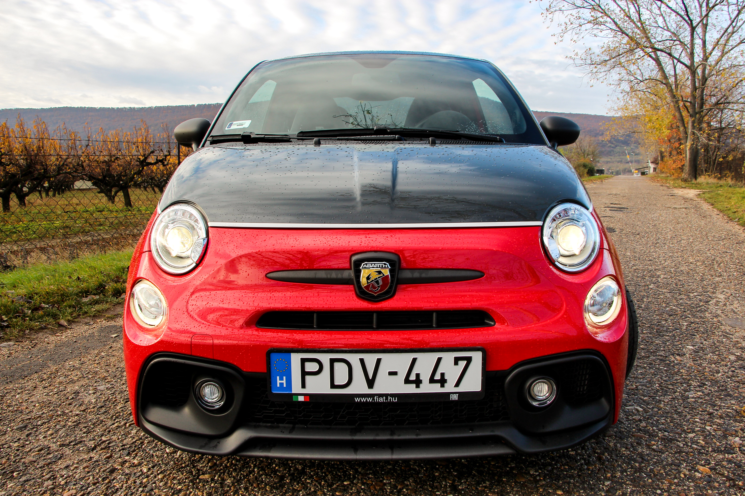 Kicsattintjuk a szabvány Fiat bicskakulcsot, amin ravasz módon kicserélték az emblémát a skorpiósra, bedugjuk a helyére - itt nem is zavaró, hogy kulcsos az indítás – és felébred az őserő. Az a legszebb az egészben, hogy amíg el nem indulunk, senkinek nem esik le, minek van ekkora hangja, parkolóházban szabályosan fáj a fülnek, ahogy szól. 5500-nál adja le a csúcsteljesítményt, de még mielőtt elindulnánk, érdemes felpörgetni párszor nyitott ajtóval, mert bizony durrog a kis méregzsák, nem is akárhogy. Adrenalinszint emelkedik, a tenyerünk izzadni kezd, a jobb lábunkkal meg már tipornánk a gázt, de előbb a kötelező körök, ha már ilyen frankó, ráadásul Sabelt kagylóülésbe huppantunk.