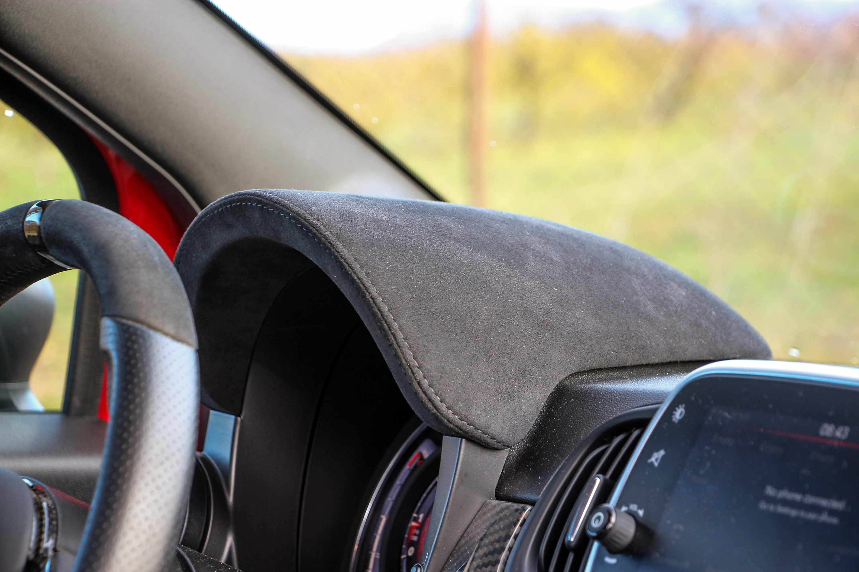Az ergonómia továbbra sem az erőssége, a kormány csak függőlegesen állítható, ellenben a karbon és Alcantara betéteket simán elhisszük, ide passzolnak
