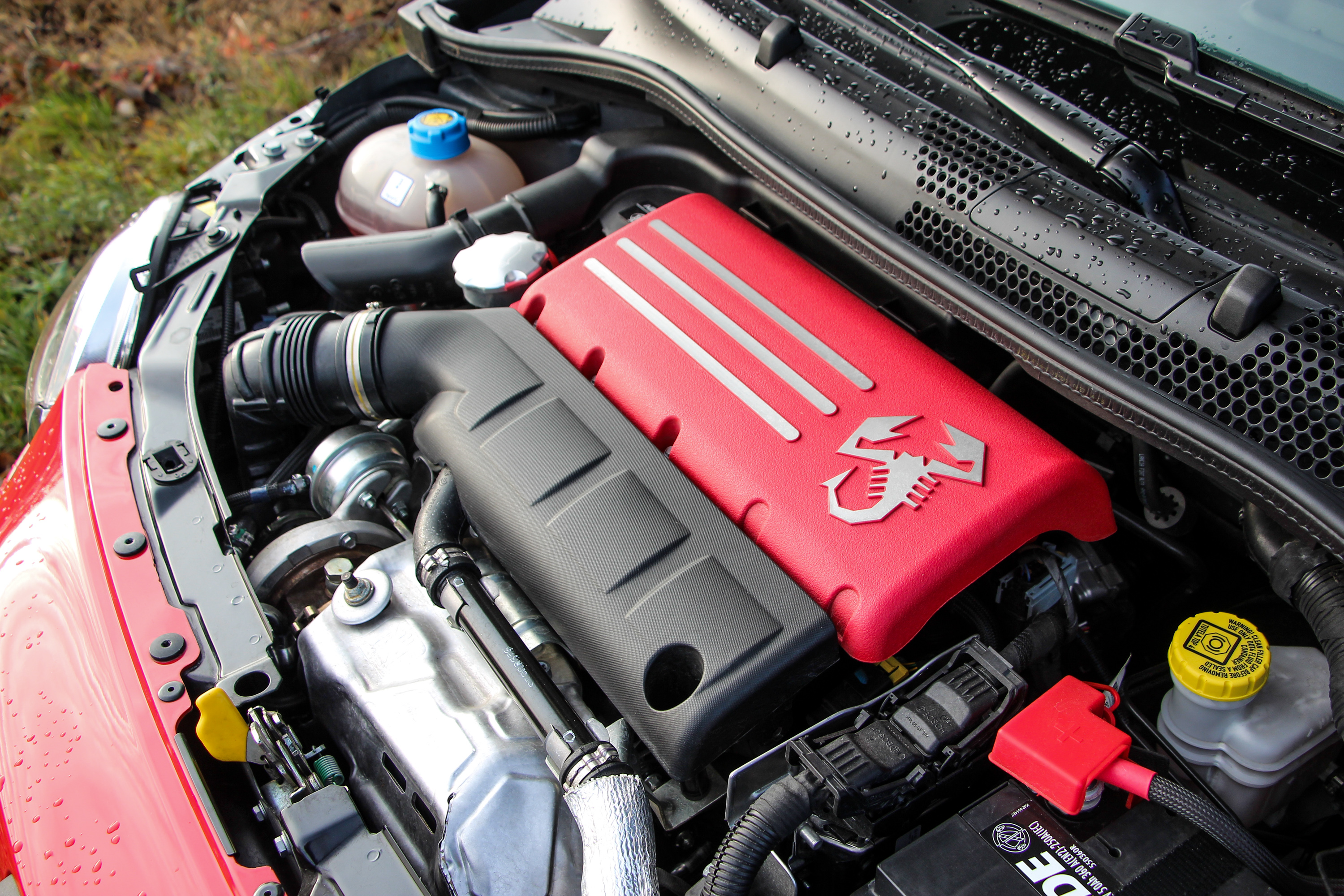 Az 500-ast több szinten tuningolja az Abarth, ennek a csúcsa az 595 Competizione, ez a piros-szürke kis vakarcs a képeken. Nem egy a kínálatban lévő motort tuningolnak, hanem cipőkanállal beleerőszakolják az 1,4-es T-Jetet a biztonság kedvéért. Nem kéthenger, vagy négyhenger szívó, hanem négyhenger és egy jókora Garrett turbó az, ami abban az apró motortérben dolgozik.