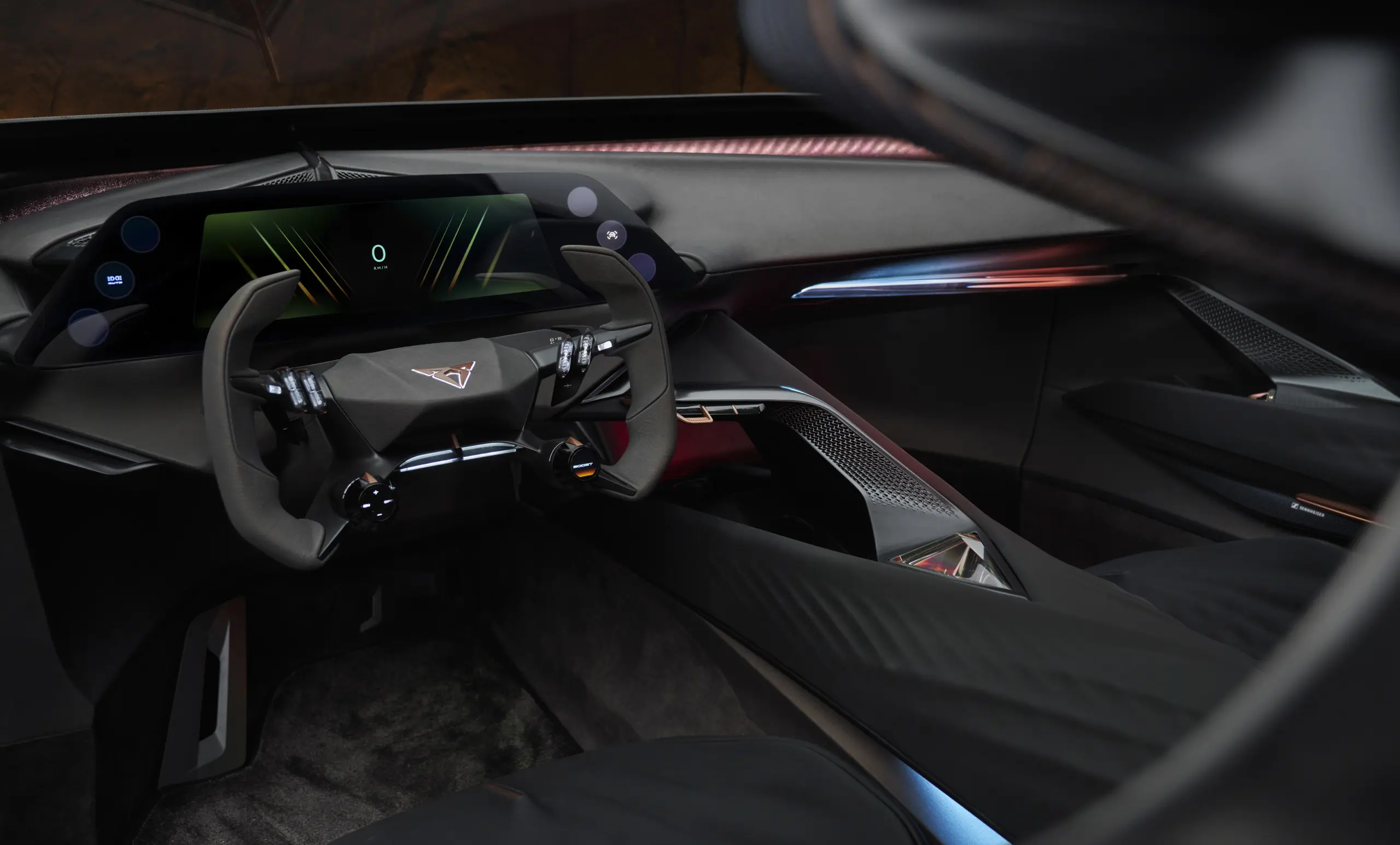 A Tindaya 24 colos kijelzővel megfűszerezett utastere még a külsejénél is tanulmányautósabb: bizonyos elemek, mint az oszlop nélküli, hátrafelé nyíló ajtók, a lebegő ülések, illetve a kabin teljes hosszát tátszelő középkonzol szinte biztosan nem kerültek majd sorozatgyártásba. A Tindaya ennek ellenére kiváló képet ad arról, hogy milyen irányba indul a Cupra az utasterek tervezése terén.