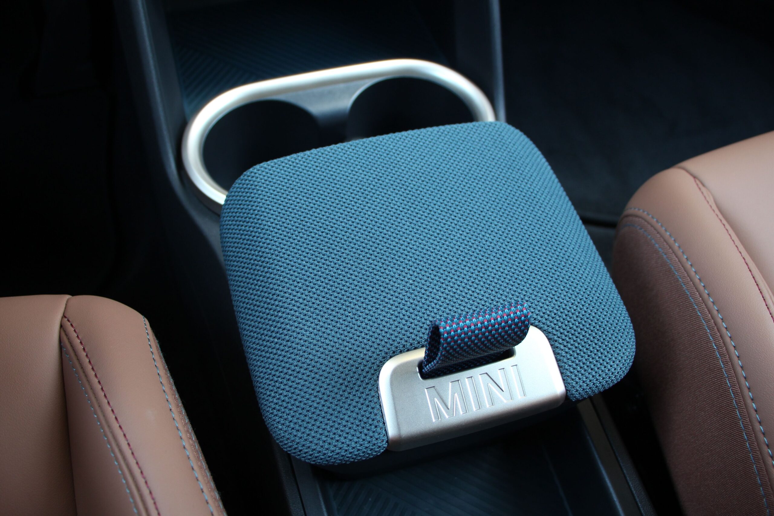 Előtte egy gyors pillantás még előre, mert a látvány igencsak ingergazdag. Az ajtóburkolatok színátmenetes kárpitozása zseniális, ahogy a plexire vetített HUD sem zavaró ebben az esetben, mert a Miniknél már megszoktuk, hogy a meredek szélvédő ezt megköveteli. A hatalmas, kör alakú infotainment kijelző is megmaradt. Az OLED képernyő csodaszép grafikával jeleníti meg az információkat, ábrákat és a menetmódoknak megfelelő hangulatokat. Néha kicsit belassul, ami valójában nem különösebben zavaró, viszont a menükezelést elsajátítani nem kétperces feladat, és elkerülhetetlen, mert a legtöbb fizikai gombot száműzték. A képernyő alatt csupán a slusszkulcsot idéző indítógomb, az üzemmódváltó, a menetirány kapcsolója és egy rádiókezelő tekerőgomb maradt. Illetve még néhány olyan funkciógomb, ami tényleg jobb, hogy egy mozdulattal működtethető, mint például a parkolókamerák és a párátlanítás. Hangulatos viszont a szövetborítású tárolórekesz-fedél, és a még mindig túl vaskos kormánykerék alsó küllőjét kiváltó kis övecske.