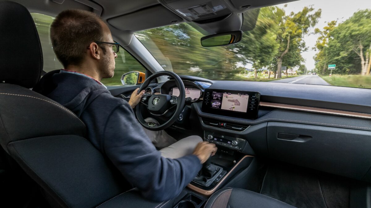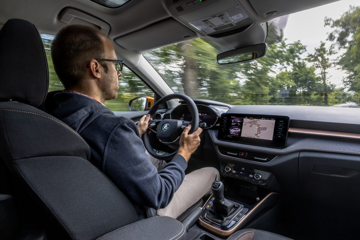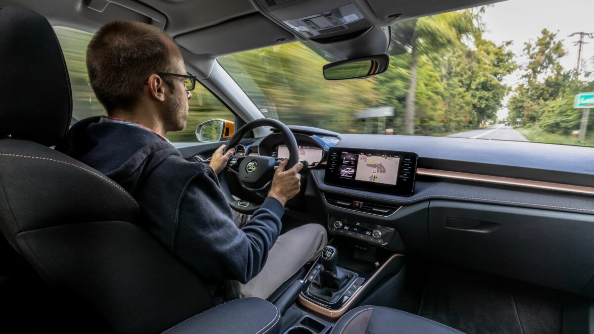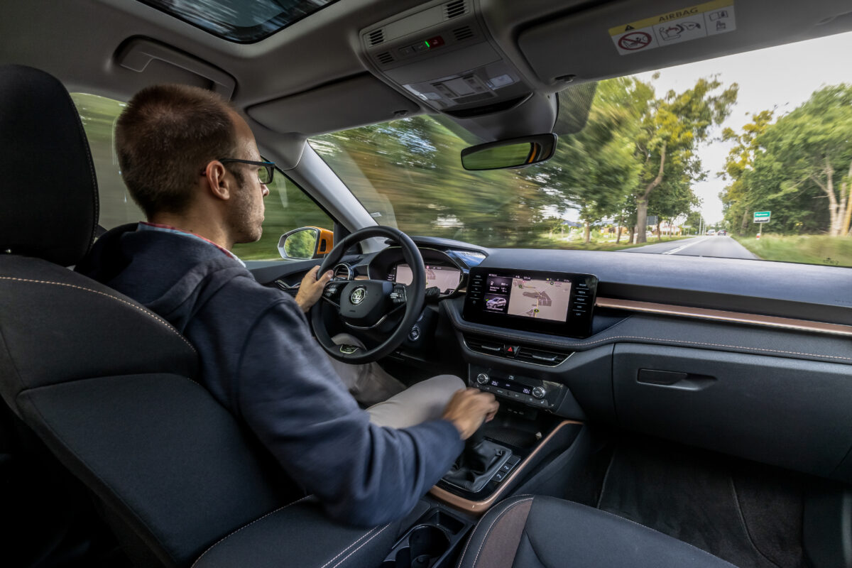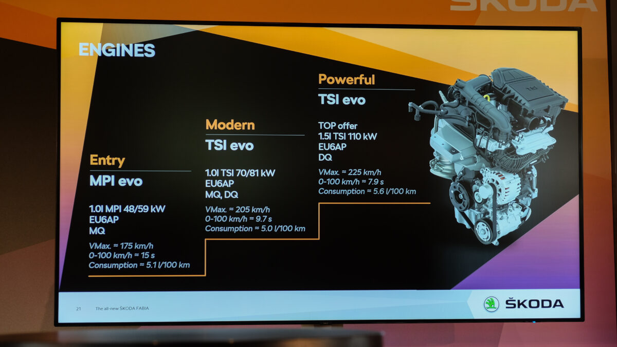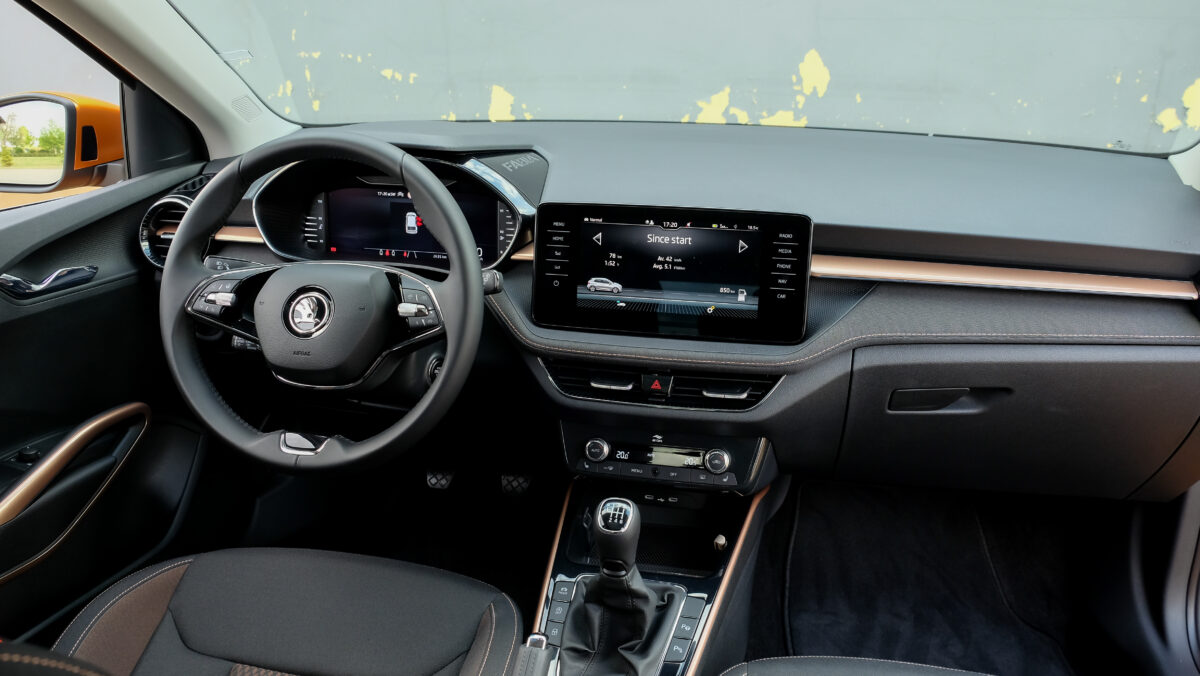 Induljunk! Kezdetben a motorpaletta csakis 1,0 literes, háromhengeres benzineseket kínál. Mind az EA211 EVO családból való, hátrafelé néző kipufogó-leömlős. Később se lesz hibrid vagy dízel, jön viszont a hengerlekapcsolásra is képes 1.5 TSI EVO, 150 lóerővel. Most viszont be kell érni a 1,0 literesekkel, amelyek turbó nélkül 65 és 80, turbóval 95 és 110 lóerősek lehetnek. Utóbbihoz már 6 fokozatú kézi váltó jár (a többi 5 fokozatújával szemben), de opciós hozzá az 1.5-öshöz alap 7 fokozatú DSG automata. A menetpróbán egyedül a 110 lóerős, kézi váltós egységet sikerült vezetni. Versenyautó nem lesz ettől a Fabia, de bőven jól megy, ahogy hallottam, a DSG-vel pláne, s erre fog még rátenni az 1,5-ös. A vegyes fogyasztási értékek rendre 5 liter körüliek, s mivel opcióként 50 literes üzemanyagtartály is elérhető, az 5 motorvariáns közül 4 esetén 900 kilométert meghaladó hatótáv érhető el. A Fabia ráadásul nem csak papíron ígérkezik takarékosnak, a kijelző szerint a fotózások miatt gyorsításokat, megállásokat bőven tartalmazó tesztkörön is 5,1 literes átlagot hozott, persze leginkább országúton.