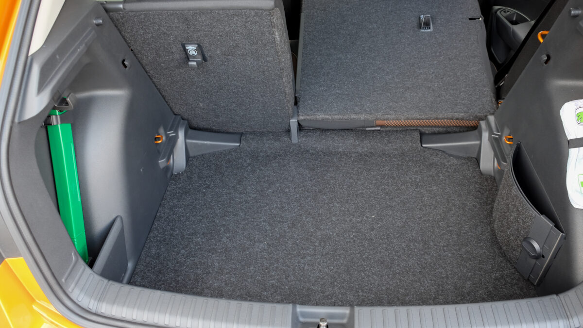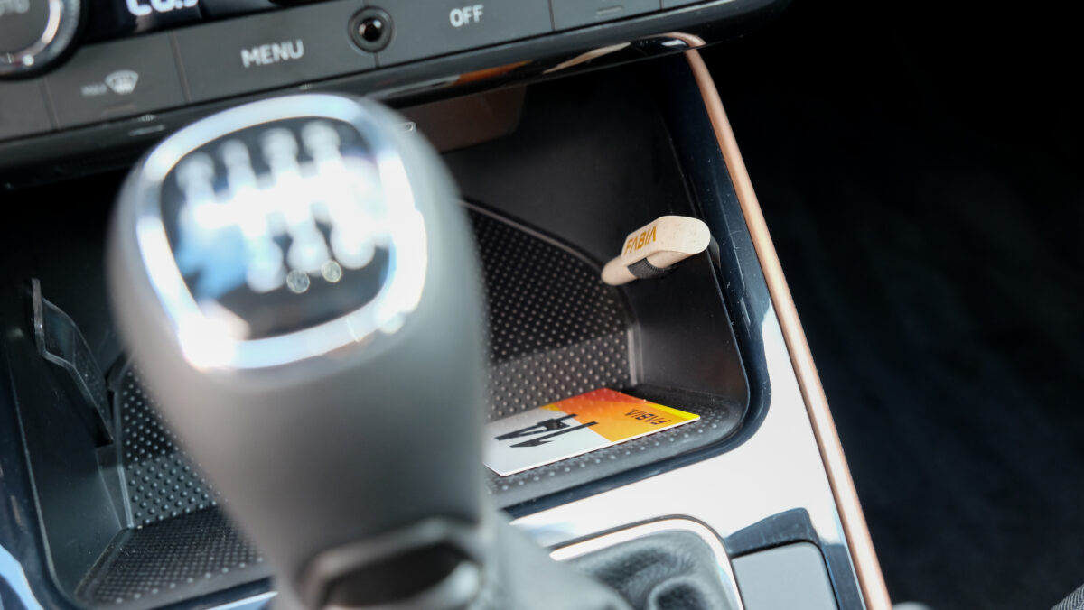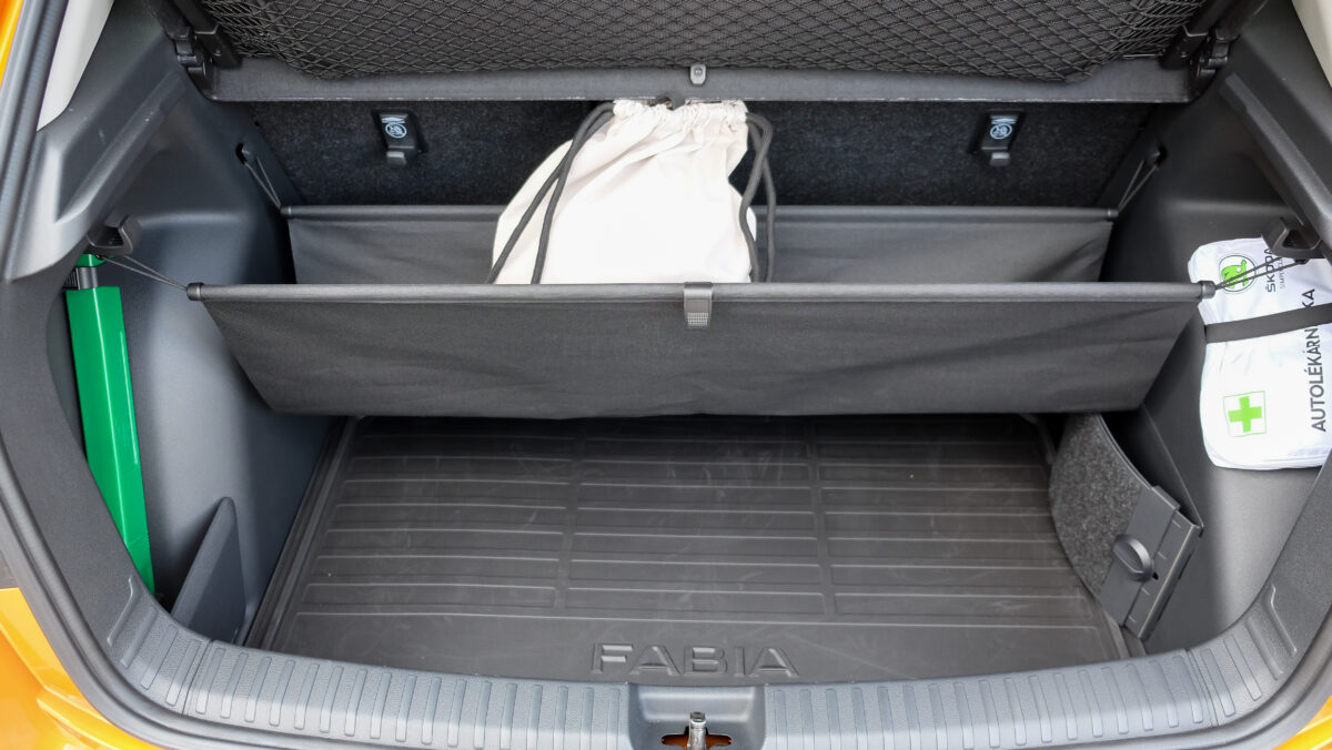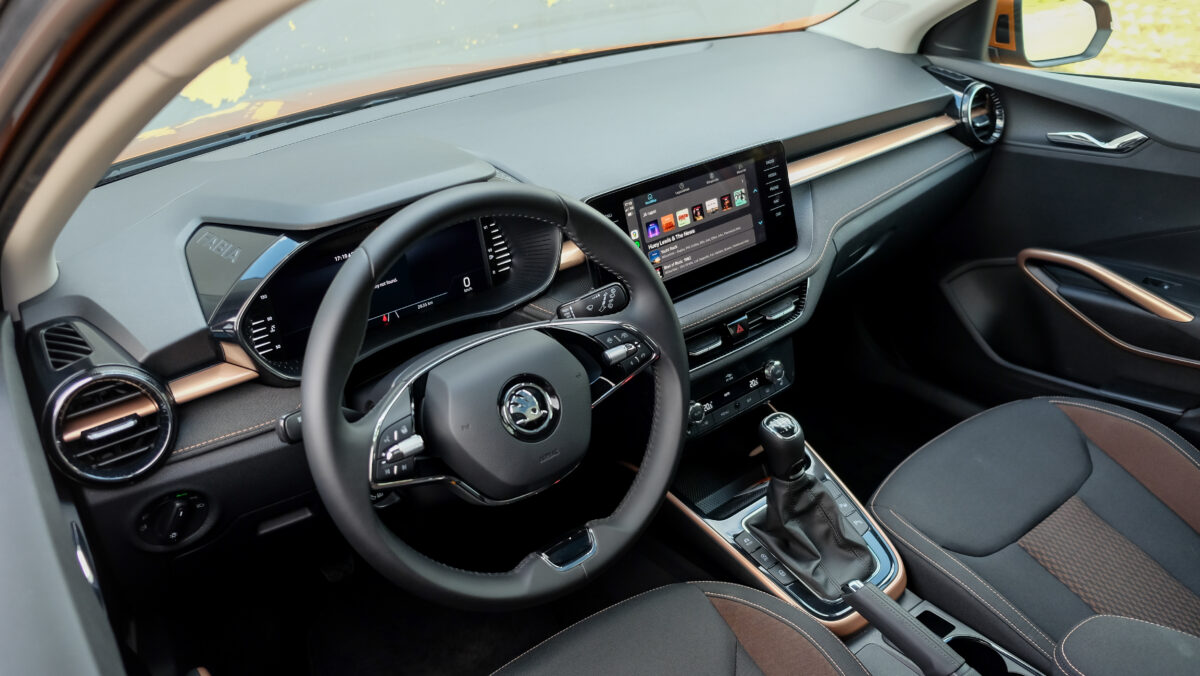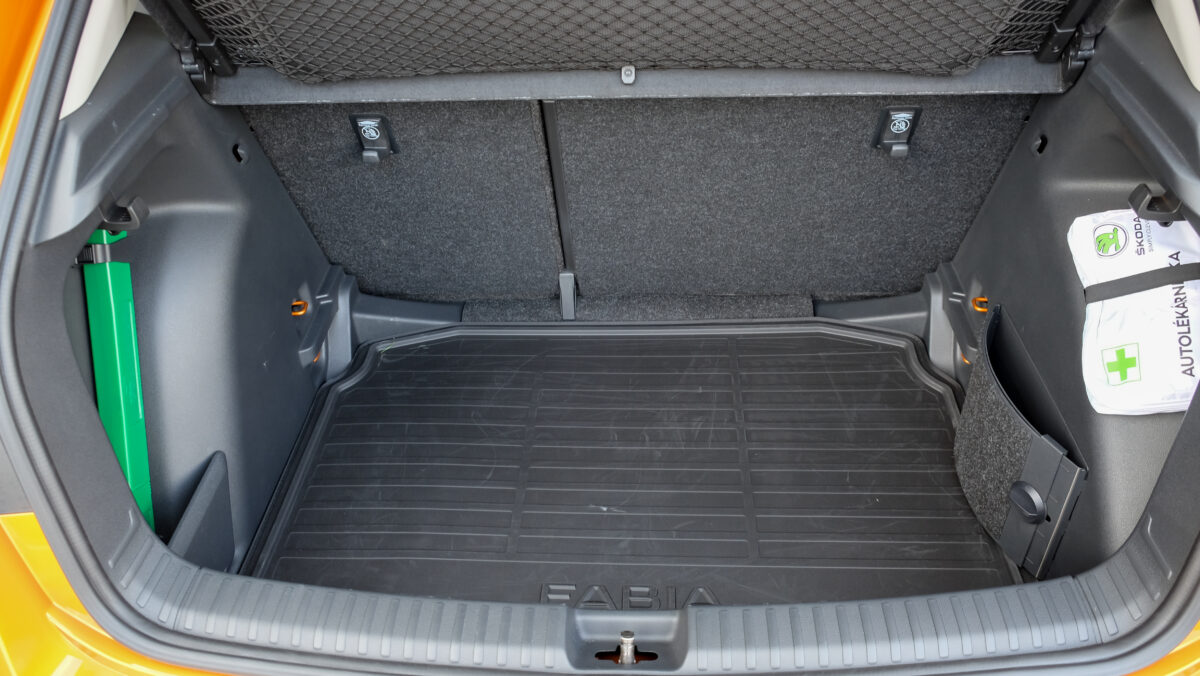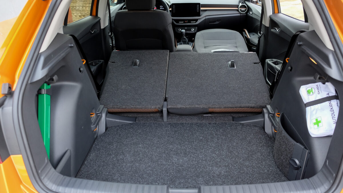 Bár a középkonzolra különálló kijelző került, széles formátuma miatt nem lóg ki nagyon a műszerfalból. A kijelző felbontása fenomenális, átmérője akár 9,2 col, oldalain pedig dedikált érintőgombok is segítik a menüben eligazodást. Jó hír, hogy az automata klíma dedikált kezelőpanelt, vakon is elérhető tekerőkapcsolókat kapott. Legalább ennyire fontos, hogy a negyedik generációs Fabia is kapott egy csokornyi, korábban csak felsőbb kategóriákban elérhető opciót, például már fűtőszálas szélvédő és fűthető kormánykerék is elérhető hozzá, akár 3 küllős kivitelben, a DSG-váltó kapcsolóival együtt. Opcióként a légkondi már kétzónás is lehet, de megjelentek a hátsó légbefúvók is, 2 darab USB-C csatlakozóval. Meg persze pakolórekesz is elérhető oda is, ami mondjuk az ötödik ülőhely lábterét igencsak lecsökkent, de még egy hely, ahova lehet pakolni, ha csak négyen utazunk. Összesen akár 16 rekesz, 108 liternyi térrel tölthető meg az utastérben.