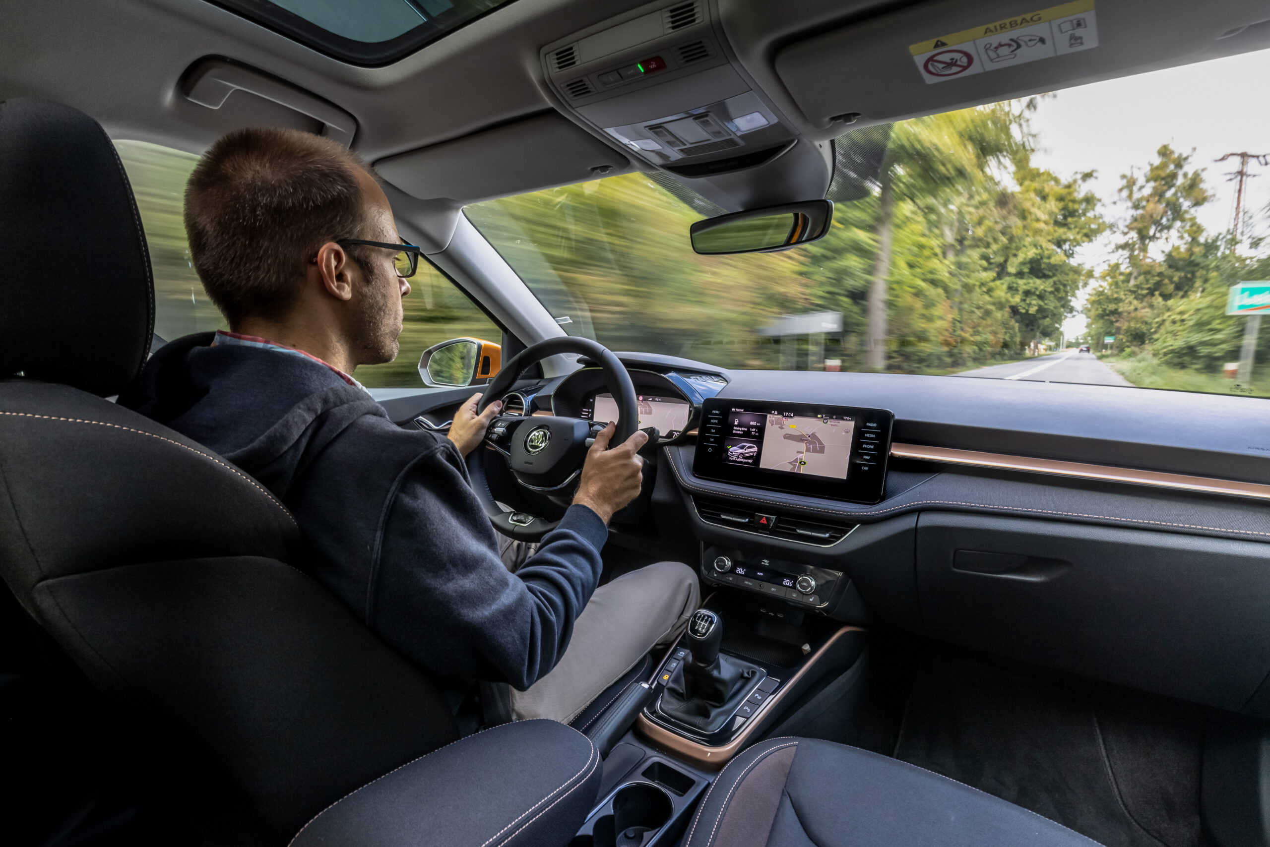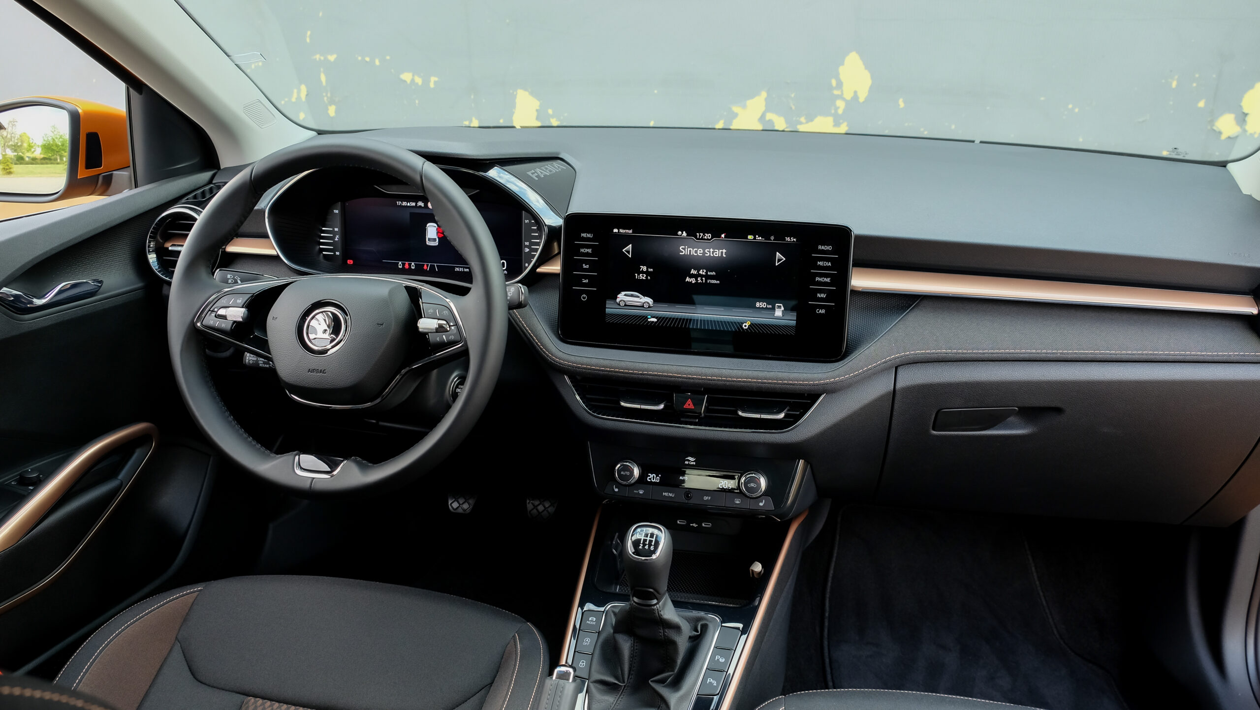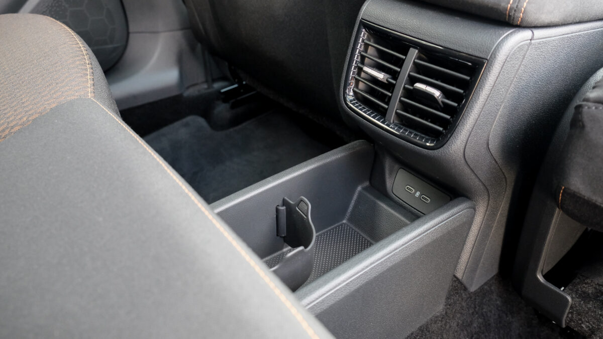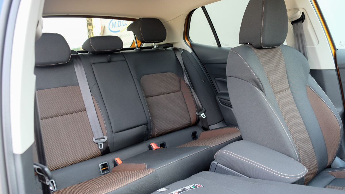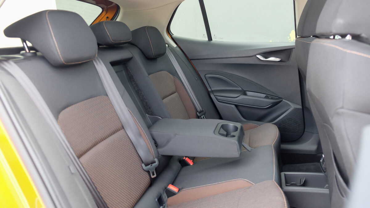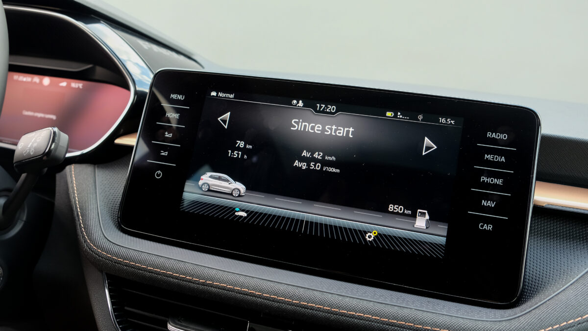Bár a középkonzolra különálló kijelző került, széles formátuma miatt nem lóg ki nagyon a műszerfalból. A kijelző felbontása fenomenális, átmérője akár 9,2 col, oldalain pedig dedikált érintőgombok is segítik a menüben eligazodást. Jó hír, hogy az automata klíma dedikált kezelőpanelt, vakon is elérhető tekerőkapcsolókat kapott. Legalább ennyire fontos, hogy a negyedik generációs Fabia is kapott egy csokornyi, korábban csak felsőbb kategóriákban elérhető opciót, például már fűtőszálas szélvédő és fűthető kormánykerék is elérhető hozzá, akár 3 küllős kivitelben, a DSG-váltó kapcsolóival együtt. Opcióként a légkondi már kétzónás is lehet, de megjelentek a hátsó légbefúvók is, 2 darab USB-C csatlakozóval. Meg persze pakolórekesz is elérhető oda is, ami mondjuk az ötödik ülőhely lábterét igencsak lecsökkent, de még egy hely, ahova lehet pakolni, ha csak négyen utazunk. Összesen akár 16 rekesz, 108 liternyi térrel tölthető meg az utastérben.