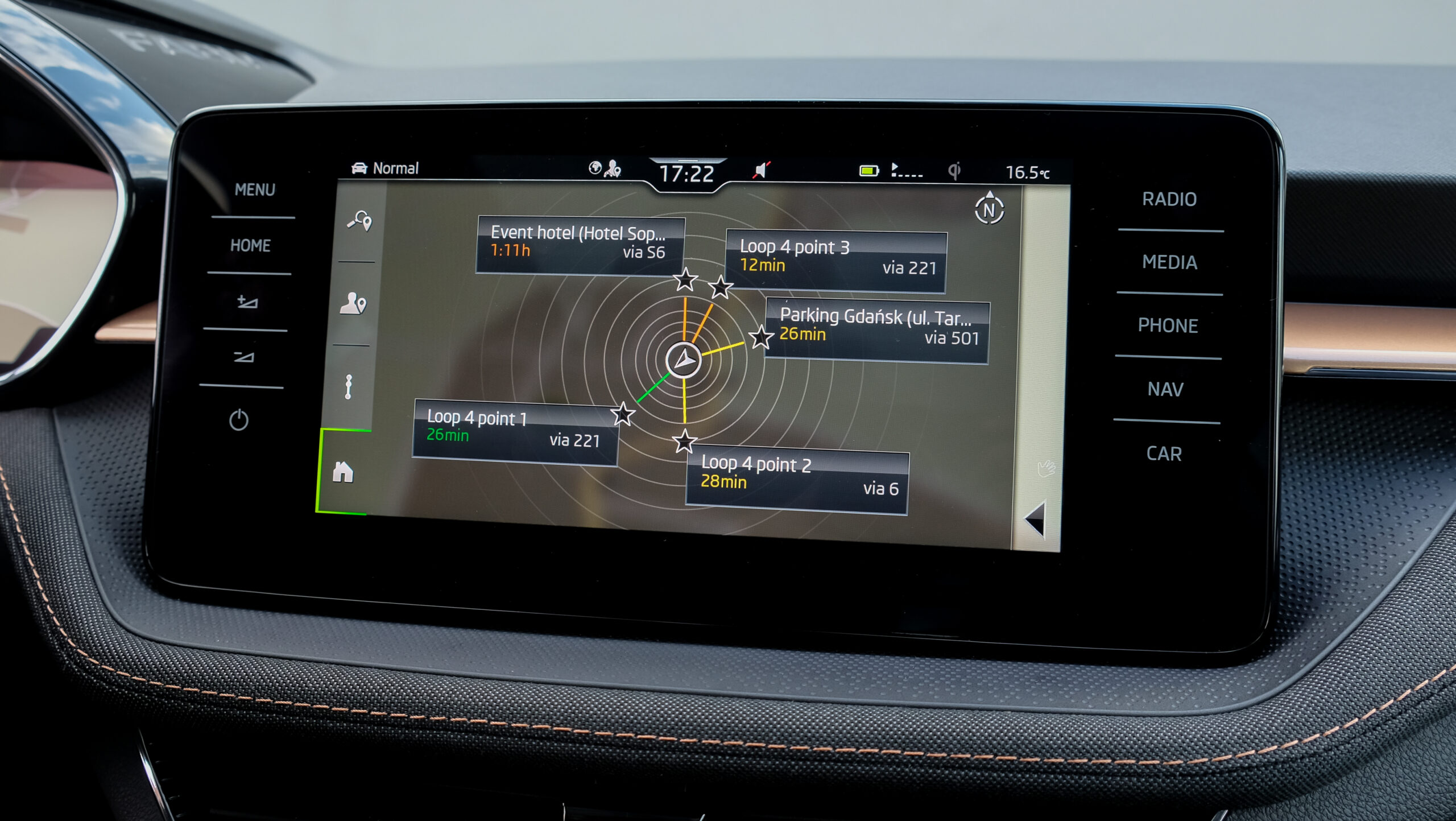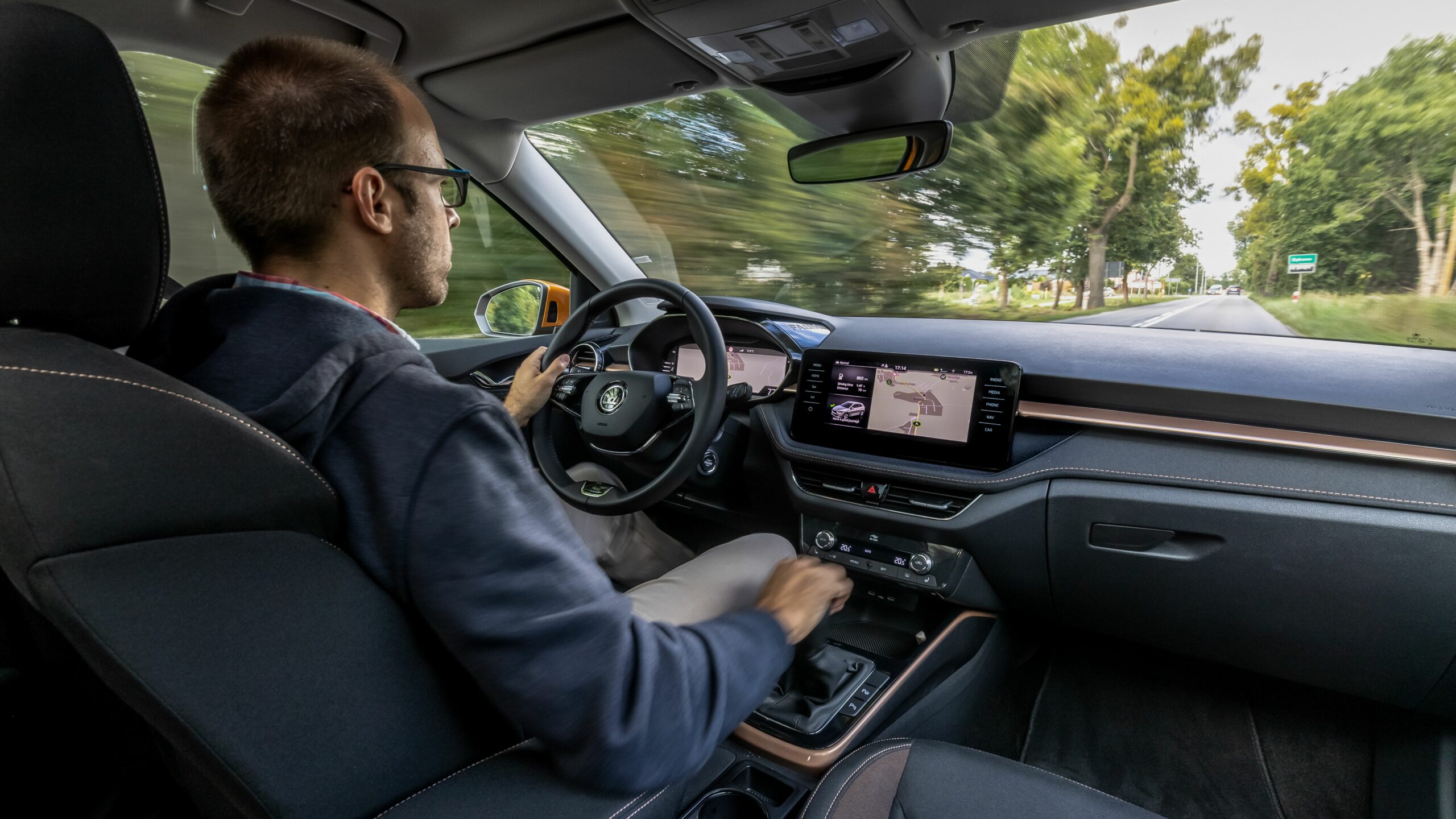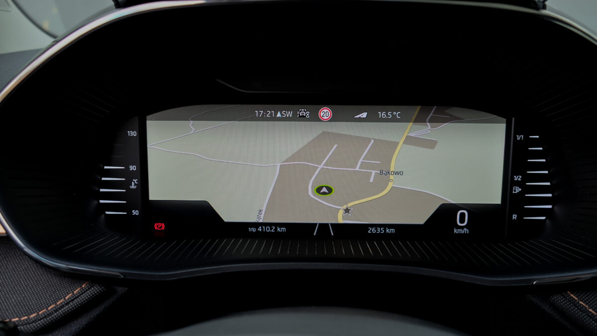 Ahogyan motorból, úgy futóműből is van választék, az alap konfiguráció mellett 1,5 centivel süllyesztett sportfutómű és (a "rossz-út csomag", Rough-Road Package által) ugyanennyivel emelt is elérhető. A felniválaszték szintén egész döbbenetes, acélfelniből 14 és 15 colosak állnak rendelkezésre, aluból 15, 16 és 17 colosak. Én szándékosan egy 16 colos, így viszonylag ballonos (195/55 R16) gumikkal szerelt autót vittem el, ezzel a hazaiaknál érezhetően jobb lengyel utakon teljesen korrekt volt a Fabia a sablonos, elöl MacPherson, hátul csatolt lengőkaros futóművén. A biztonság minden téren erős: az opciós hátsó oldallégzsákkal és a sofőr térdlégzsákjával együtt akár 9 légzsák lapulhat, sofőrsegédből pedig egyebek mellett sávtartó, távolságtartós tempomat, holttérfigyelő, gyalogos- és kerékpárosfelismerés is elérhető. Parkolni első-hátsó radar és parkolóasszisztens is segít, s a menetrögzítő kamerákhoz is kap előkészítést a Fabia, a középső visszapillantójához tett USB-aljzattal.