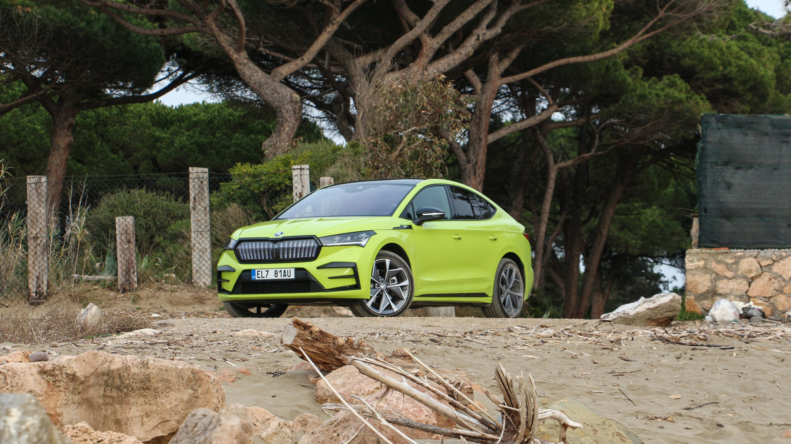 Enyaq Coupé iV a tengerparton: hiába megemelt és összkerekes, a homokra mégsem mertünk rápróbálni vele ezekkel a 21 colos felnikkel