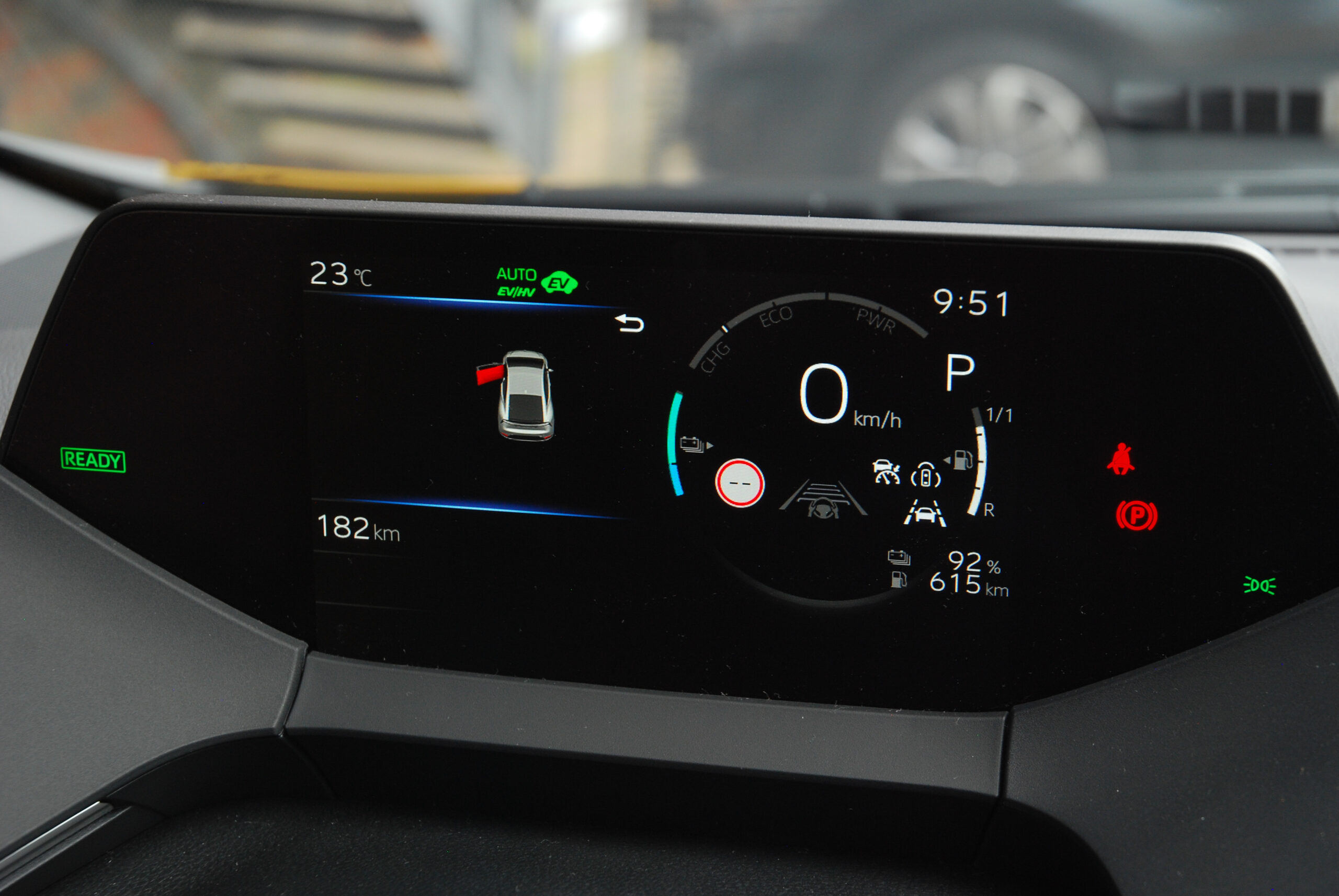 Ettől természetesen a modelltől megszokott kényelem sem veszett el, sőt! Az első ülések környékén mindent kiváló anyagok borítanak, az összes kezelőszerv kézre áll, illetve a könyöklők is jó helyre kerültek: látszik, hogy valódi emberekre szabták az utasteret. A középkonzolon a különálló klímavezérlő és a Toyota legújabb rendszerét futtató, 12,3 colos érintőképernyő kerül a figyelem középpontjába, a két fotel között pedig a megszokott Toyota váltó köré csoportosulnak a különböző kezelőgombok.
