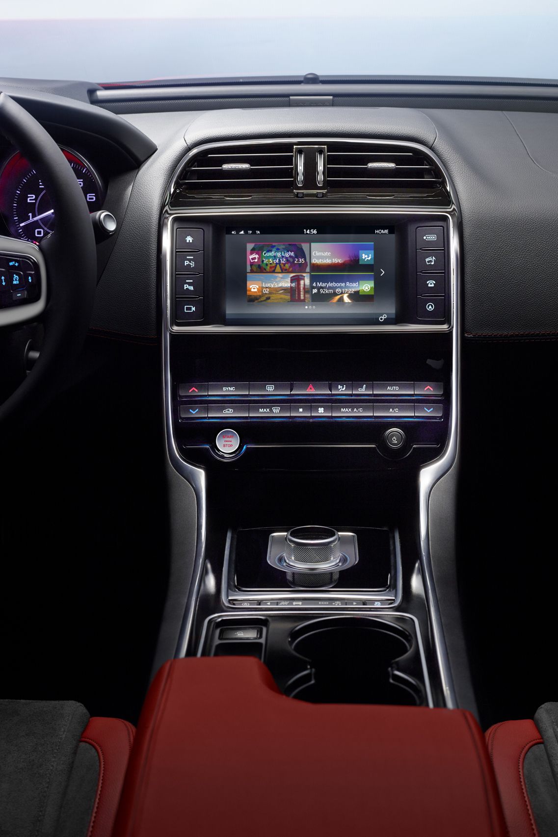 Jaguarosan kerek előválasztóval, az S esetén természetesen kormány mögötti váltófülekkel is jön az XE, sajátos az ajtókárpit lépcsős kialakítása