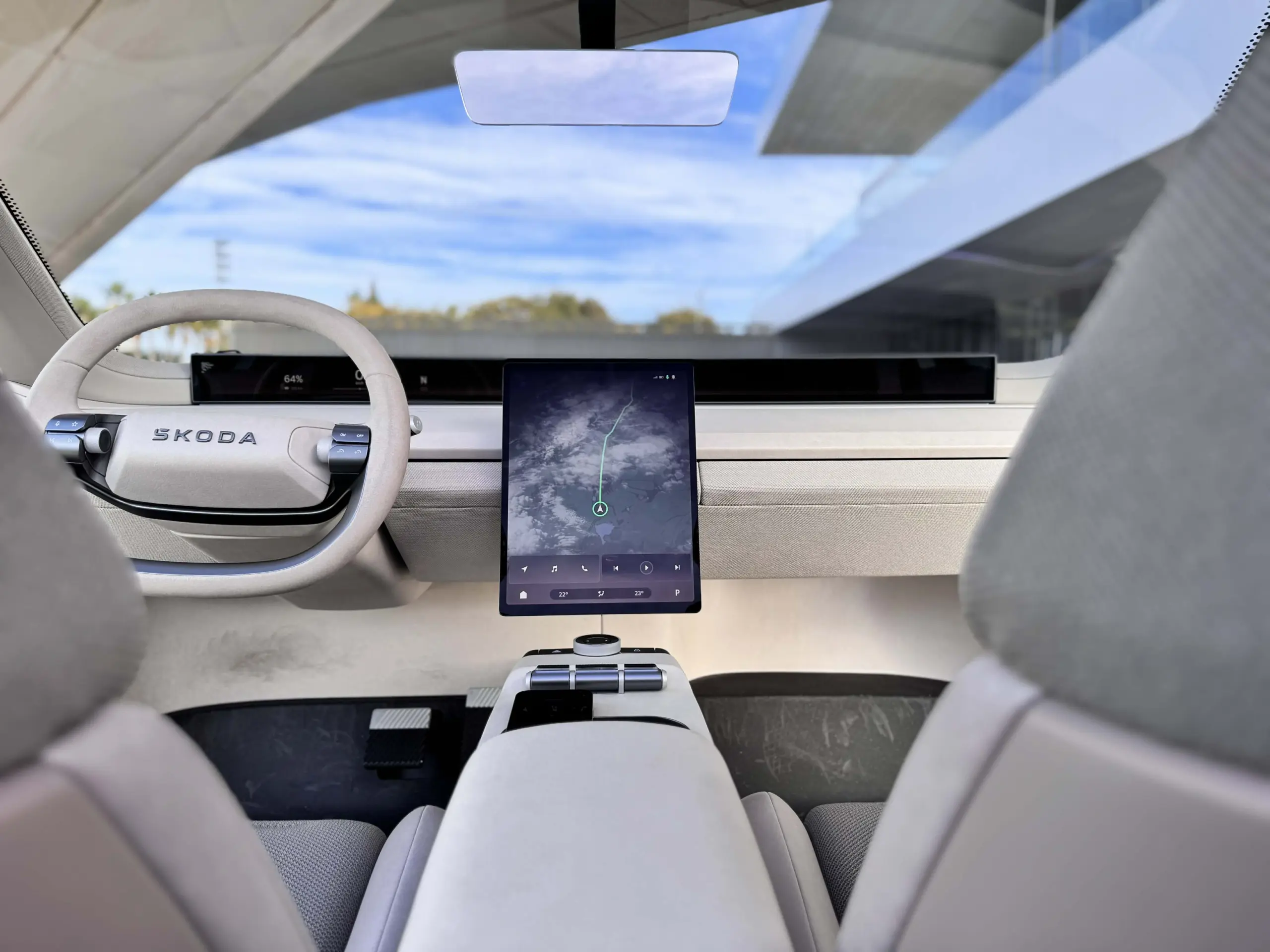 A középső érintőképernyő ennél jóval fontosabb, mivel szinte minden erről vezérelhető. A függőleges tájolásra a Škoda szakembere a kérdésemre logikus magyarázattal állt elő. Elmondása szerint a felhasználók túlnyomó többsége menet közben a navigációt teszi ki maga elé, így ez a megoldás praktikusabb, mivel a térkép nagyobb része jeleníthető meg egyszerre. Különösen tetszett, hogy több nézet közül lehet választani, ha pedig teljesen ránagyít a felhasználó az autóra, akkor a beállításokkal tud játszani.