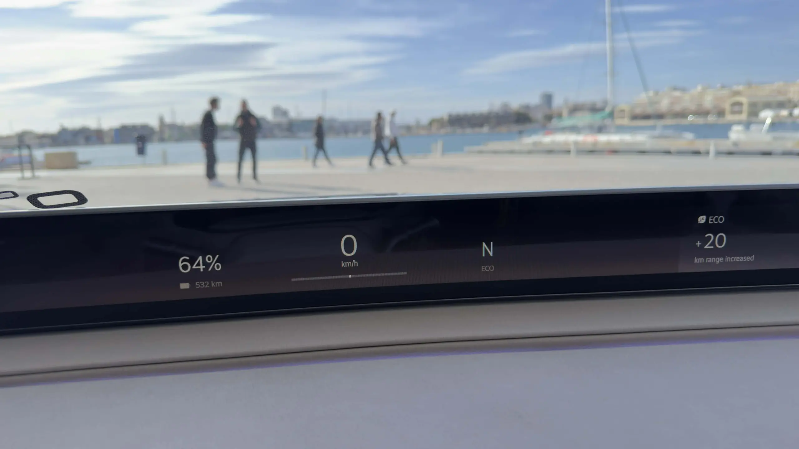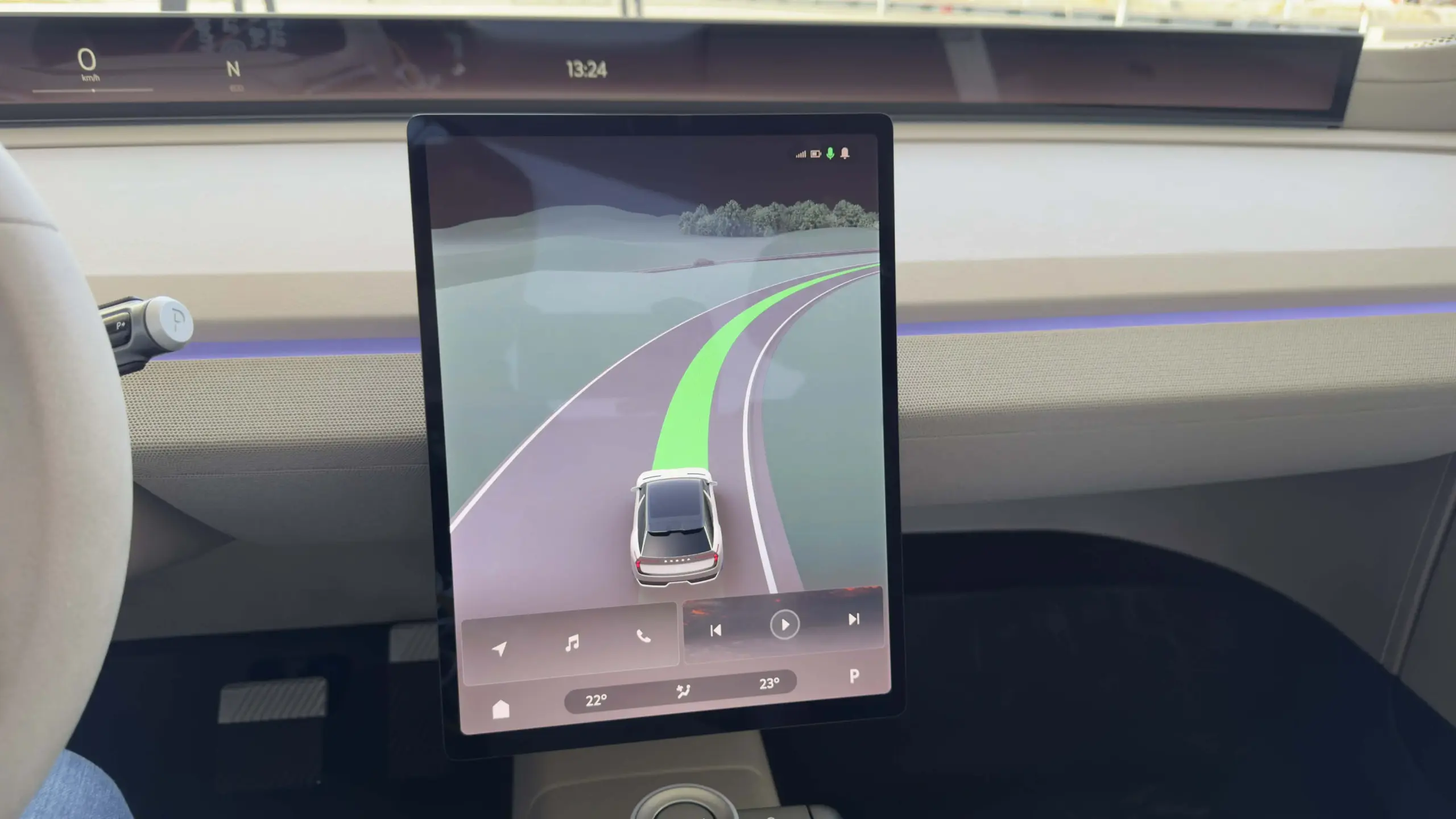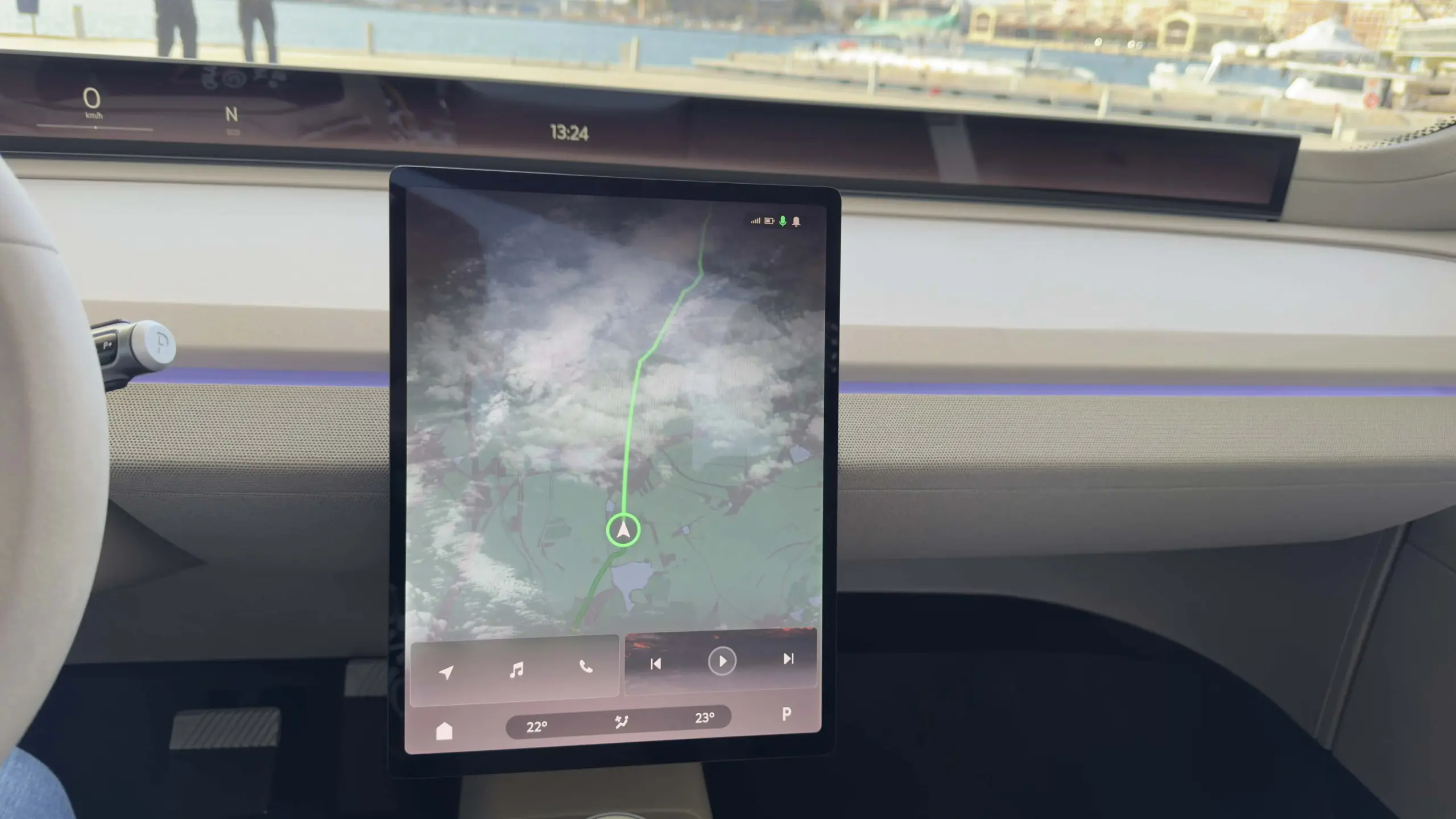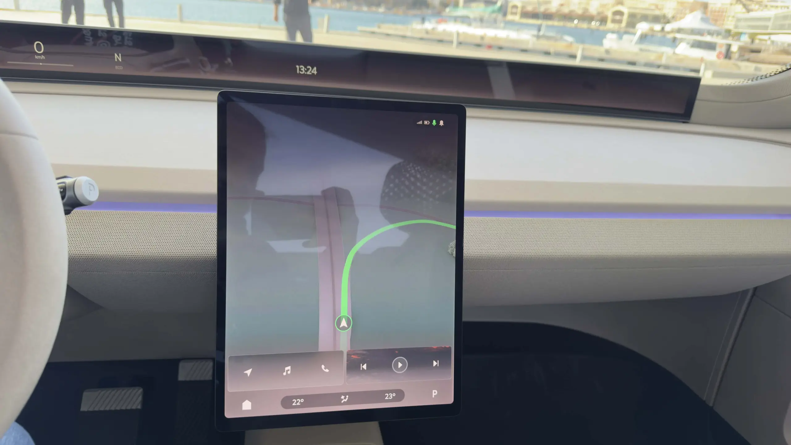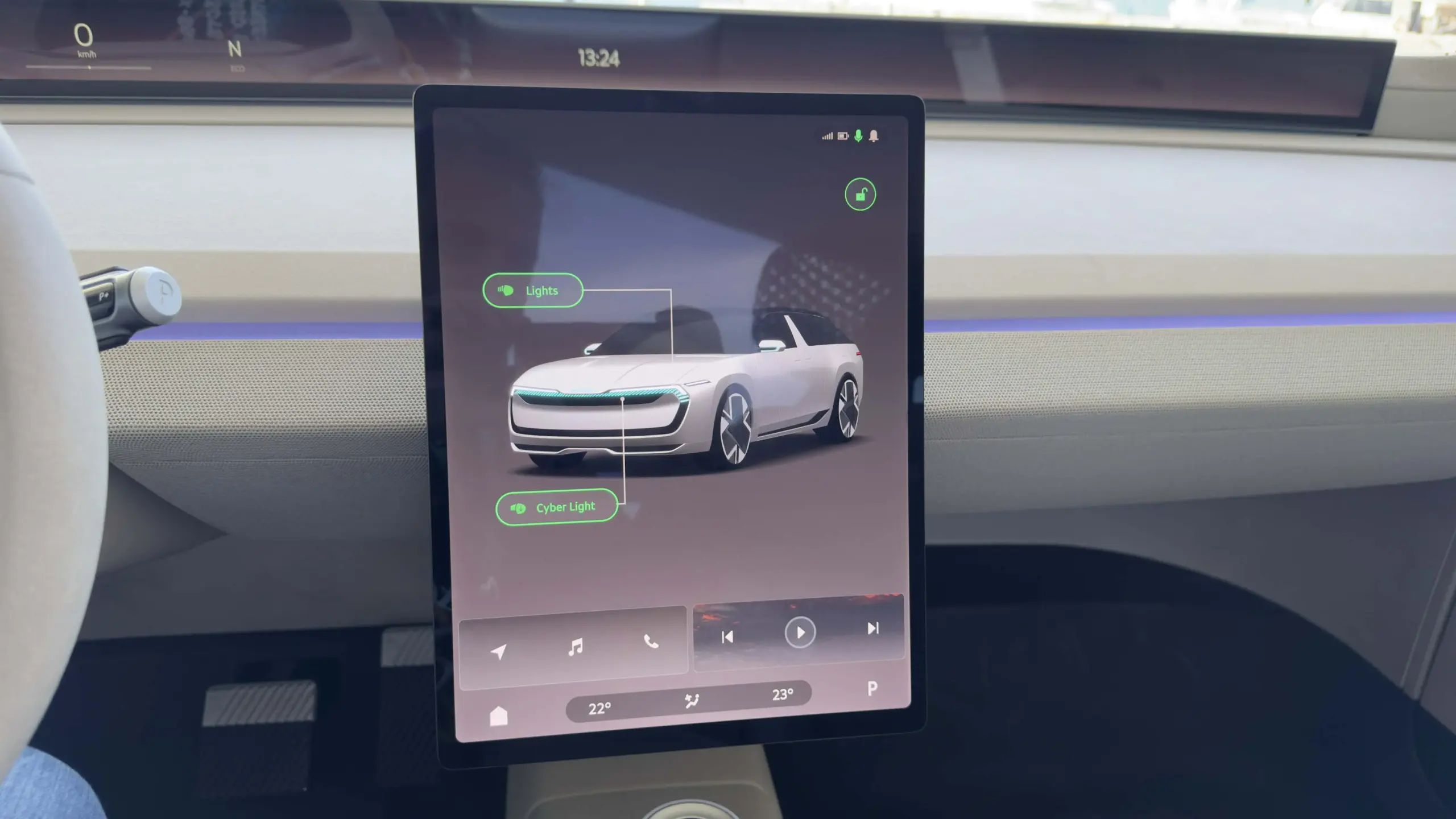 Természetesen azért nem vitték túlzásba. A hangsúlyt az 1,2 méteres, A-oszloptól A-oszlopig tartó digitális műszeregységre és a középen lévő függőlegesen tájolt multimédiás kijelzőre helyezték. Előbbi semmiképpen sem mondható ördögtől való gondolatnak, hiszen a német prémiumok körében már akad olyan SUV, amelyben kísértetiesen hasonló megoldás található. A Vision O-ban a felület bal oldali részét értelemszerűen a sofőr számára releváns információk fedik le (aktuális sebesség, töltöttségi szint, sebességi fokozat, stb.), míg középre és az anyósülés elé nagyjából bármit, de tényleg bármit ki lehet vetíteni. A menetpróbán például YouTube videót néztem itt, de elméletileg bármelyik streaming platform megjelenítésére képes, vagy akár a naptár, a navigáció, esetleg épp az aktuális hőmérséklet is felvillanhat a kijelzőn.