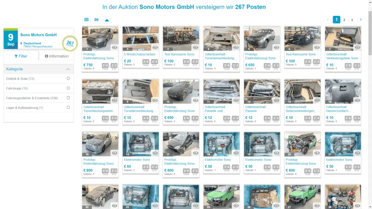 A Sono Motors eredetileg 2019-re ígérte a Sion EV napelemes villanyautó bemutatását, a vételár pedig egy hajszállal 30 ezer euró alatt, vagyis nagyjából 12 millió forintra jött volna ki. A 2017-ben bemutatott prototípus napelemei körülbelül 29 kilométeres hatótávolságot tudtak generálni egy nap alatt, ami a beépített 30 kilowattórás akkumulátor 160 kilométeres hatótávolságát növelte. Közösségi finanszírozási kampánnyal az eredetileg tervezett, 2019-es megjelenési dátumig több mint 700 ezer dollárt gyűjtött össze a cég 1100 előrendelésből. A megjelenést mégis elhalasztották, 2023-ra 54 kilowattórás lítium-vasfoszfát akkumulátorral és akár 300 kilométeres hatótávolsággal ígérték a modellt. 2022 végére a Sono Motors 45 ezer kifizetett foglalást regisztrált a Sion EV-re, de 2023 elején a vállalat úgy döntött, hogy befejezi a projektet. Most pedig, két év hallgatás és a cég átnevezése után elárverezik a maradványokat, köztük több komplett és néhány sérült vagy félkész prototípust is. Egy tucat vadonatúj villanymotort hirdetnek, mindössze 50 eurótól, ami a jelenlegi árfolyamon körülbelül 20 ezer forintnak felel meg. Az első ülések ára 14 euró (5500 forint), a hátsó üléssor 30 euró (12 ezer forint), a hiányos karosszéria pedig 100 euró (40 ezer forint). A legérdekesebbek azonban a kész prototípusok, amelyek jelenleg 650 és 800 euró közötti áron, vagyis 300 ezer forint környékén várják a licitálókat.