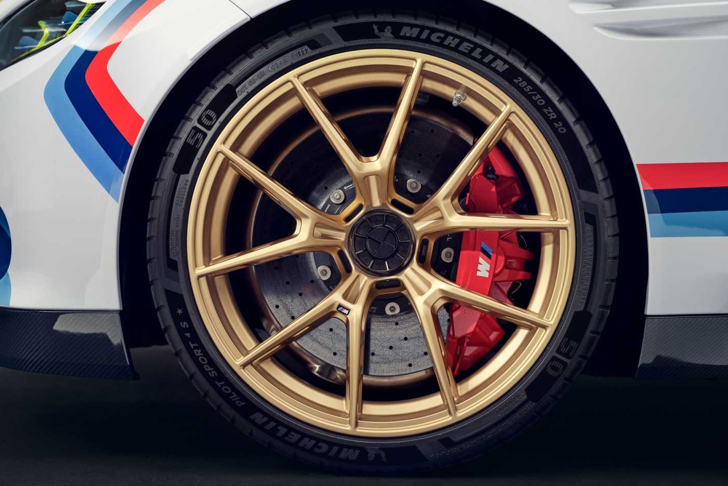 Bár az első lézerfényszórók lényegében az M4 CSL-ről érkeztek, a kadmiumsárga részletek a múlt versenyautóit idézik, akárcsak a hatalmas sárvédőív- és küszöbtoldatok. A leglátványosabb kapocs az elődmodell örökségével mégis a hatalmas, M-Power feliratú hátsó légterelő, amelyet egy tetőszpojler egészít ki, akárcsak annak idején az E9 alapú modellen. Az elöl 20, hátul 21 colos felnik modern, Y formájú küllői és az autó oldalának sziluettje mégis gyorsan visszarepítenek a jelenbe, akárcsak maguk a Michelin gumik, amelyek egy 50-es szám formájában az oldalfalukon hordják az emlékév jelölését.