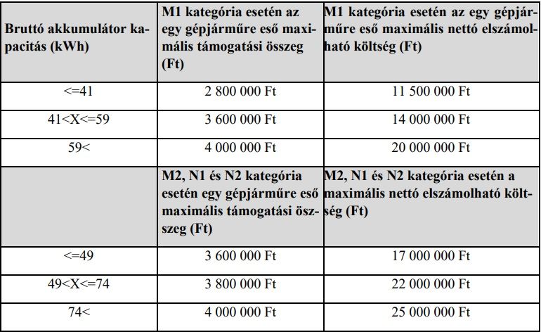 A támogatás összege függ attól, hogy személyautóra, vagy tehergépjárműre igénylik, illetve a bruttó akkumulátor kapacitástól is. Az alábbi táblázat mutatja a pontos számokat.
