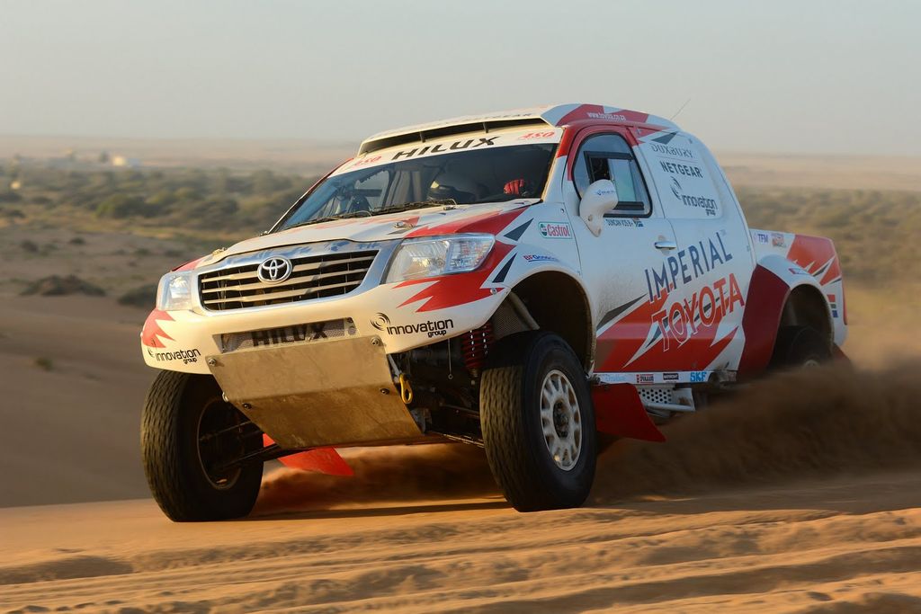 Balra Al-Attiyah Hummerje (Robby Gordoné narancssárga lesz), jobbra De Villiers Toyotája. Előbbi hátsókerekes, mindkettő benzines, rettenet erős, s akár a győzelemre is jó lehet