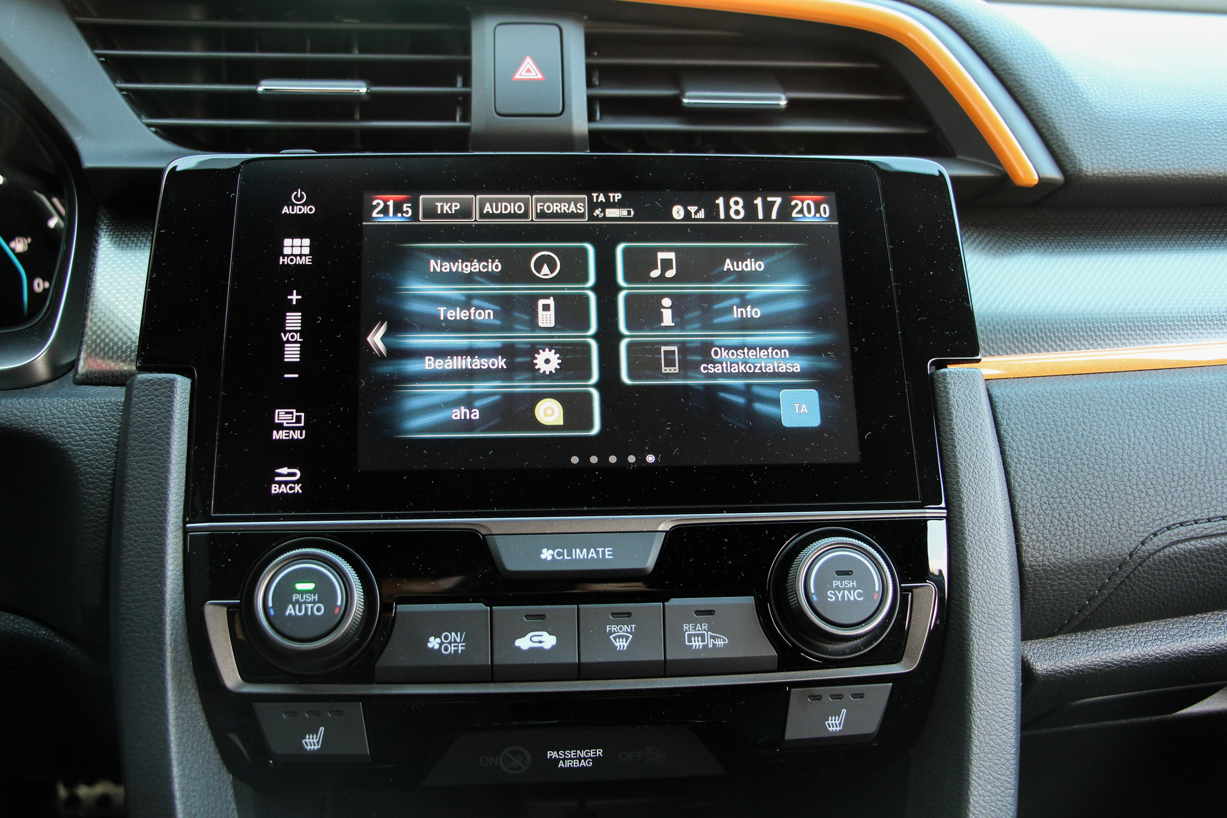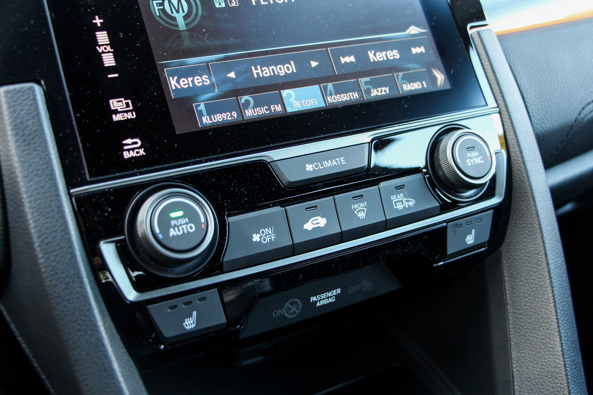 Ki van ez találva. Sok az ügyes megoldás odabent, amiből a technika sem maradt ki. Az automata kézifék - amit ha bekötött öv nélkül nem kapcsolunk ki, ránk szól a Civic – tartó (hold) állással is rendelkezik, így nem kell bajlódnunk lejtőn elinduláskor, vagy dugóban araszoláskor. A start-stop viszont kicsit lassú, rendszeresen gyorsabban raktam az egyest, mint beindította volna a motort, így garantált volt a fulladozás, kikapcsolandó. Alapáras felszereltsége az összes vezetéstámogatót tartalmazza, nem csak fékez magától veszély esetén, de a sávba is visszakormányoz, van táblafelismerője és tempomatot is ad, ráadásul a radaros, követős fajtából. Tolatókamera is van az Elegance-tól fölfelé, valamint kétzónás automata klíma. Az új Civicet vezetni kimondottan jó, méreteivel megizzasztja a kompakt szegmenst, árával pedig a vevőket. Bőséges ellátmányával viszont csábító lehet, de tényleg érdemes a nagyobbik motorral választani, főleg, hogy Elegance felszereltségű tesztautónk végső ára is közel elérte a mindenképp 1,5-ös motorral járó Sport felszereltség indulóárát.