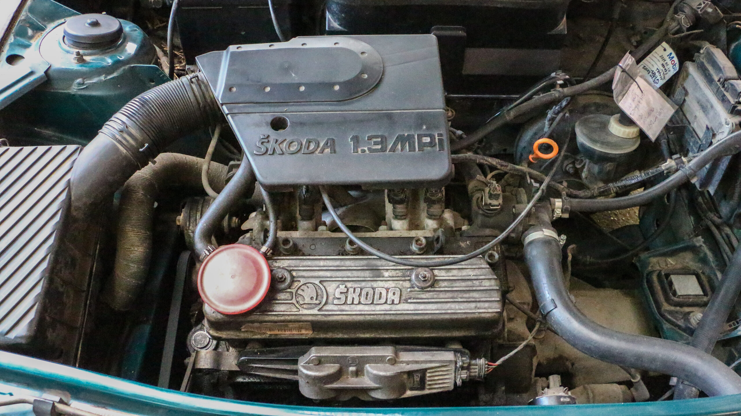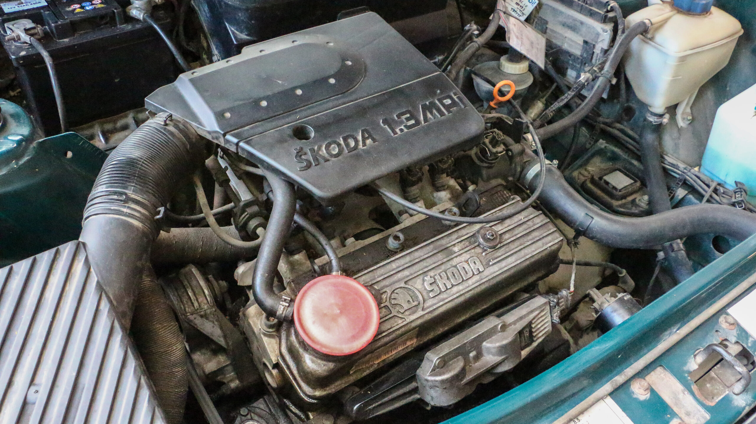 Motorja sem valami bivaly, a szocializmusban született, 1289 köbcentis Škoda erőforrás egy változata került az eladott példányok nagyjából 90 százalékába, ám ekkor már nem hátra, hanem előre, és nem karburátorral, hanem központi injektorral, később hengerenkénti injektorral. Ezt 54, 58 és 68 lóerős teljesítményszinteken kínálták, illetve az igazi ínyencek komoly felárért akár a Volkswagen 75 lóerős 1,6 literes erőforrását is kérhették bele, dízelfronton pedig a hírhedt Volkswagen 1,9 literes blokk turbó nélküli, 64 lóerős változata jutott. Ezt a konkrét autót is az alap 54 lóerős verzió húzza, 99 Nm csúcsnyomatékát és szintén minimális, 935 kilós saját tömegét is figyelembe véve 15,1 másodperc alatt képes elérni a 100 kilométeres óránkénti sebességet.