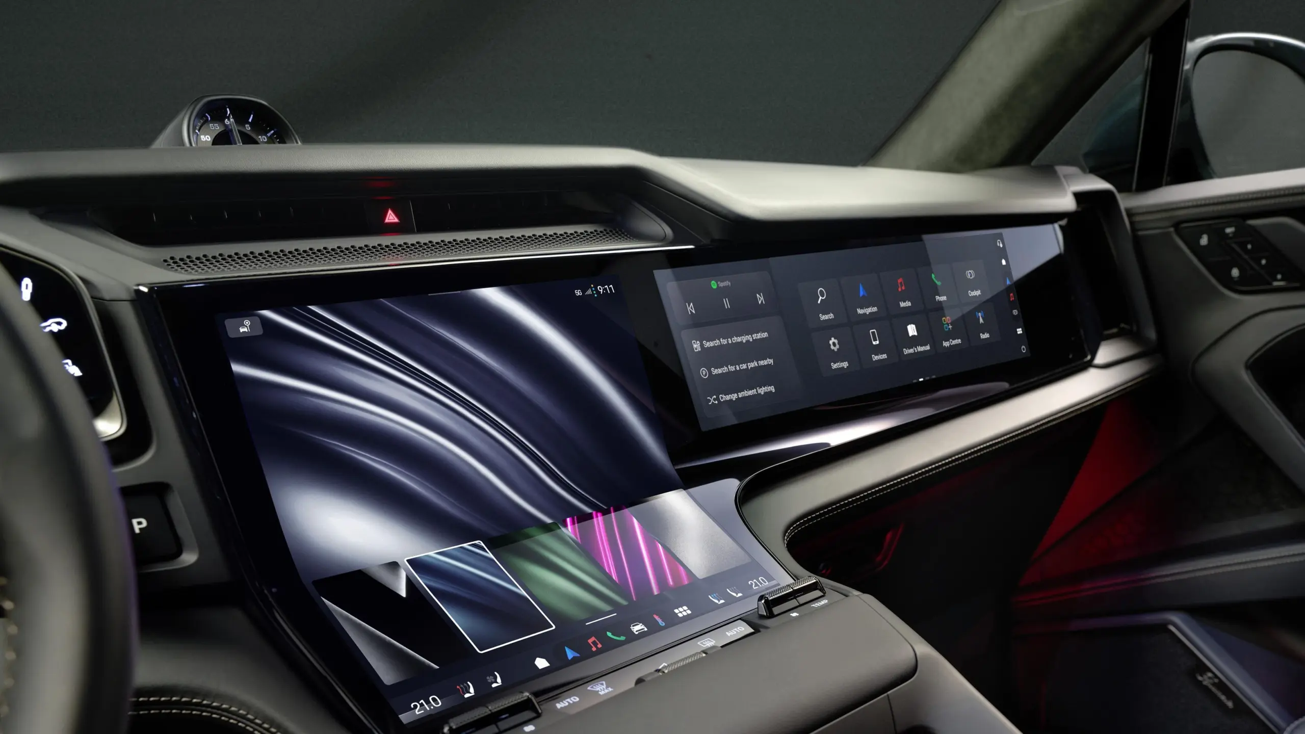 Ahogyan arra számítani lehetett, a műszerfalon egymást érik a képernyők. Közülük egyértelműen a középső multimédiás a legextrémebb. A "Flow Display" névre keresztelt panel történelmi szinten is különleges, ugyanis még soha nem került ekkora kijelző egyetlen Porsche modellbe sem - a pontos méretet viszont nem árulták el. Ezzel szemben kiemelték, hogy a digitális műszeregység 14,25 colos, míg az utasoldal elé opcionálisan rendelhető extra tablet 14,9 colos.