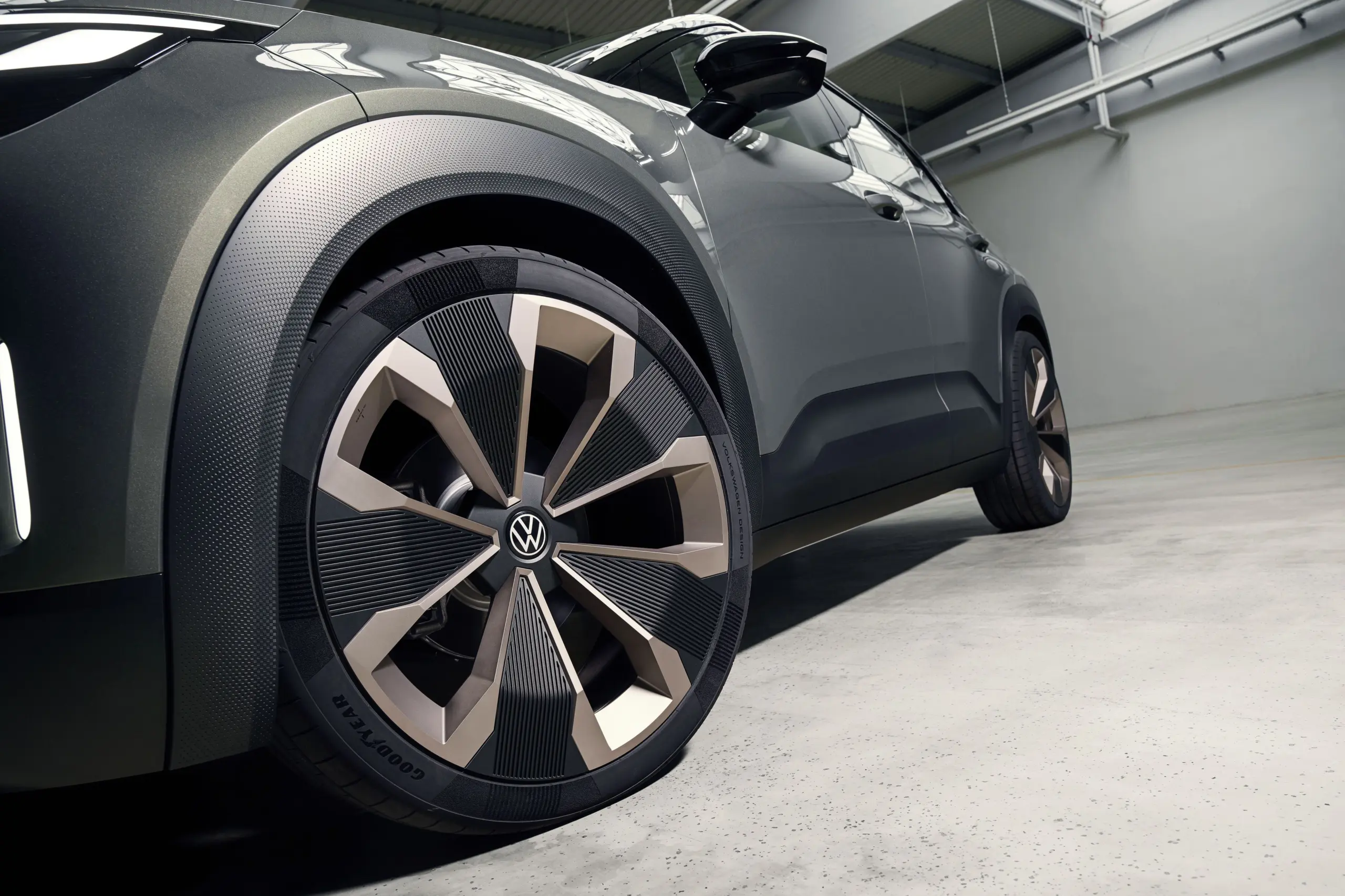 Ezúttal egy 2,6 méteres tengelytávolságú és 4,1 méter hosszú kompakt SUV modellt mutatott be a Volkswagen ID. Cross Concept néven, amiből ki is derül, hogy ez egyelőre csak egy tanulmányautó. A T-Cross méretű koncepcióautó egyik különlegessége a Balboa (de nem a Rocky) névre keresztelt 21 colos, könnyűfém felnik, amelyekre a Goodyearrel közösen fejlesztett, egyedi gumiabroncsok kerültek. Ha jól megnézitek, akkor látszik, hogy a felnik mintázata a gumikban folytatódik.