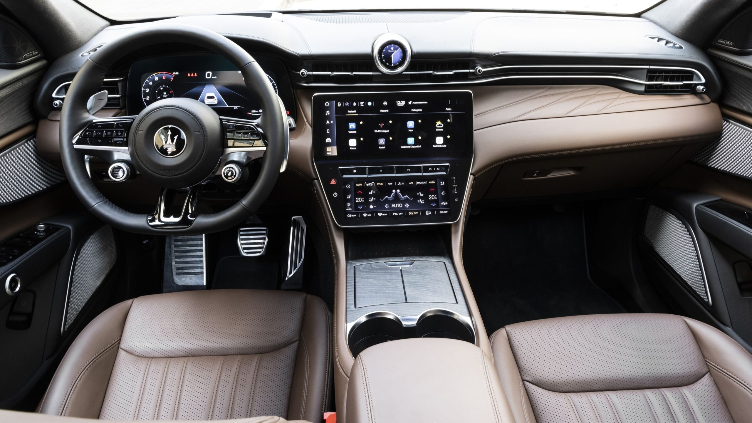 Bent a korszellemnek megfelelően maximális digitalizáltság vár. A jellegzetes Maserati stíluselemet, a műszerfal tetején elhelyezett analóg órát is digitálisra cserélték, persze analógnak álcázva. A középkonzolon két érintőképernyő is helyet kapott, a felső 12,3 colos, az alsó pedig 8,8 col méretű. Természetesen a vezető is digitális műszeregységről olvashatja le az információkat, de még az ajtónyitás is gombnyomásra működik belülről, kilincsek helyett. Az anyaghasználat természetesen prémium, a kényelem pedig elsőrangú, és hátul valóban fejedelmi a lábtér.