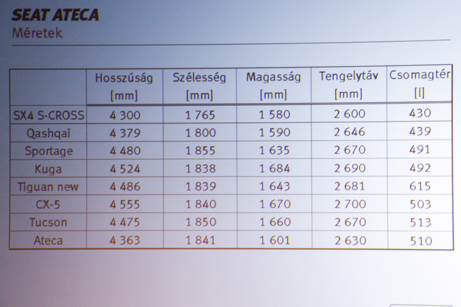 Az Ateca és legfőbb konkurensei. Méretével a középmezőnyben van, a kompakt SUV-k/crossoverek között is kompakt, utas- és csomagterével ugyanakkor tágas