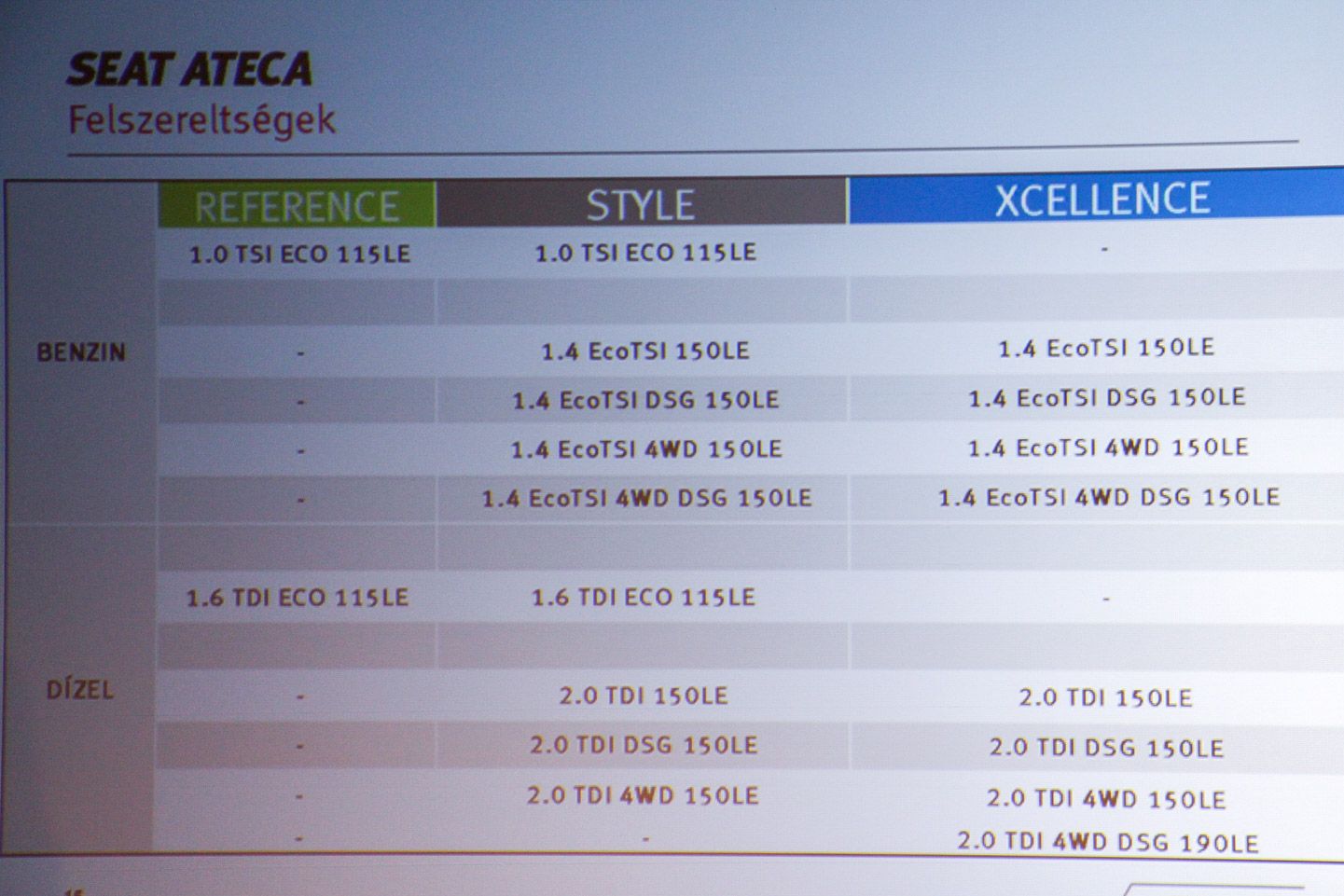 Igaz, az eladások zömét nem az alapmodelltől várhatjuk. Az ugyanis a háromhengeres és 1,0 literes, 115 lóerős TSI. A dízel belépő épp ilyen erős, hiszen az az 1.6 CR TDI 115 lovasa - már több eséllyel a best seller címre. Benzinesből az 1.4 TSI (150 LE) akár összkerékhajtással, akár DSG váltóval, akár a kettővel együttesen is a kínálat része, ugyanez a variációs lehetőség elmondható a 150 lóerős 2.0 TDI-ről is, a 190 lóerős (szintén 2,0 literes) TDI csúcsmodell azonban csakis 4WD-vel és DSG-vel lesz kapható. Bár az Ateca 5 millió forint alatti belépőára a konkurensekhez mérten kedvező, alapfelszereltsége - a márkától megszokottan - gazdagnak számít.