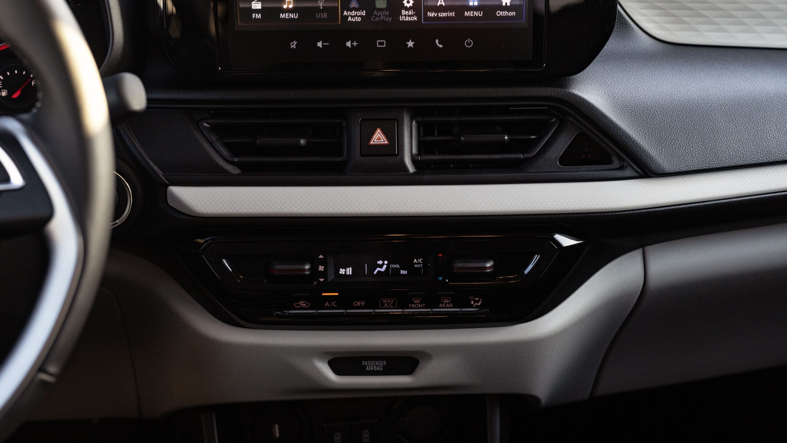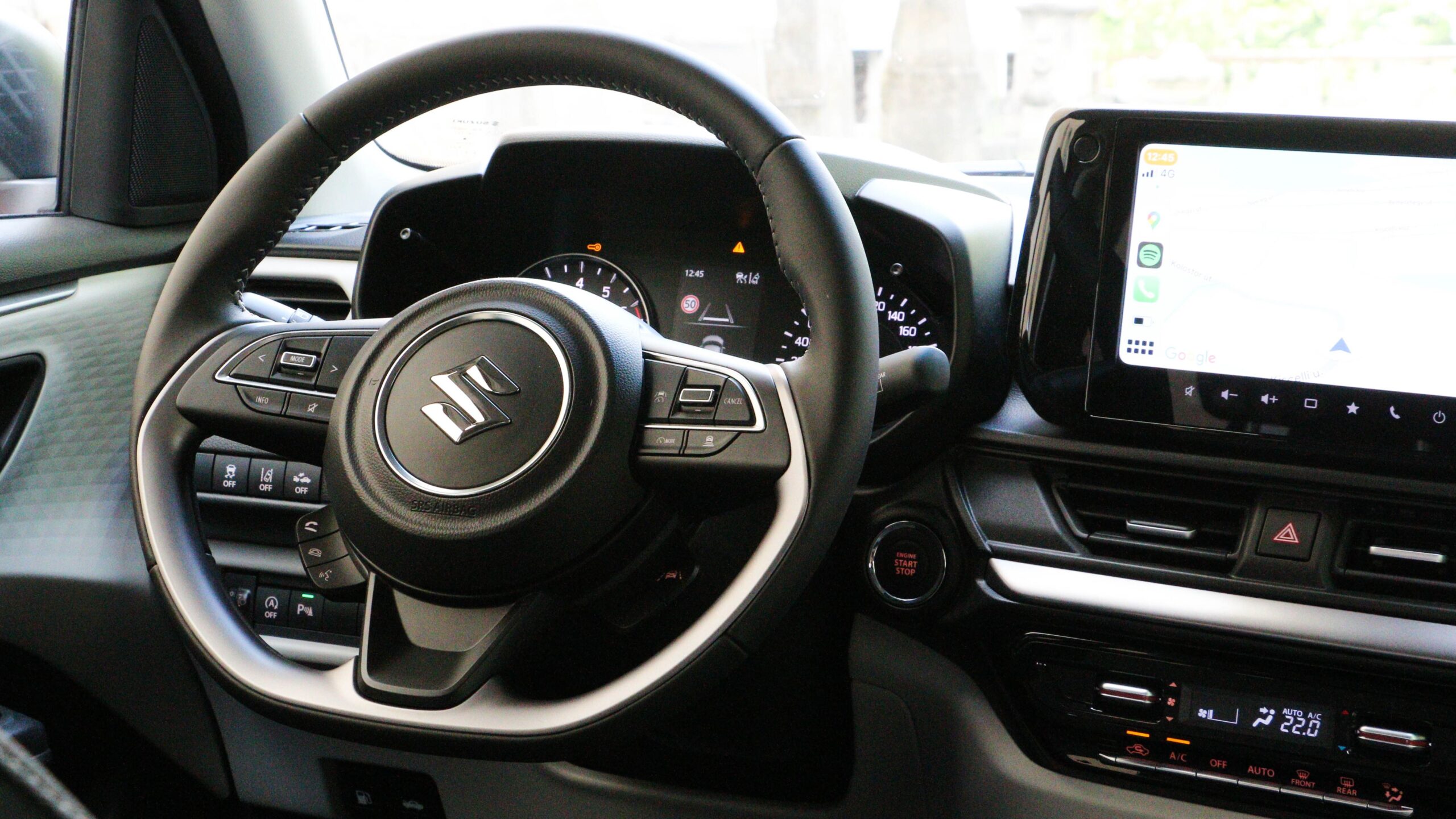 Még mielőtt alaposan kiveséznénk az utasteret, az ajtók is rejtegetnek érdekességet. A mérnökök különös figyelmet fordítottak a kintről érkező zajokra, ezért a hangszigetelő anyagot nem sajnálták az egyébként igencsak könnyű Swiftből. Emiatt főleg az első ajtók csukása meglepően nagy erőt kíván, de hátul is megfigyelhető a jelenség – gyorsan leszögezném, azért nem kell egy a G Merci „ajtócsapkodására” gondolni. A belső tér jelentősen átalakult a kifutó modellhez képest. A 9 colos multimédiás érintőképernyő immár a műszerfal tetején csücsül, a klímavezérlő így valamivel fentebb került, ez szerencsére továbbra is fizikai gombokkal szabályozható. A kormányon is marad a hagyományos megoldás, de még a műszeregység is analóg, csupán a közepén találni egy 4,2 colos színes LED kijelzőt.
