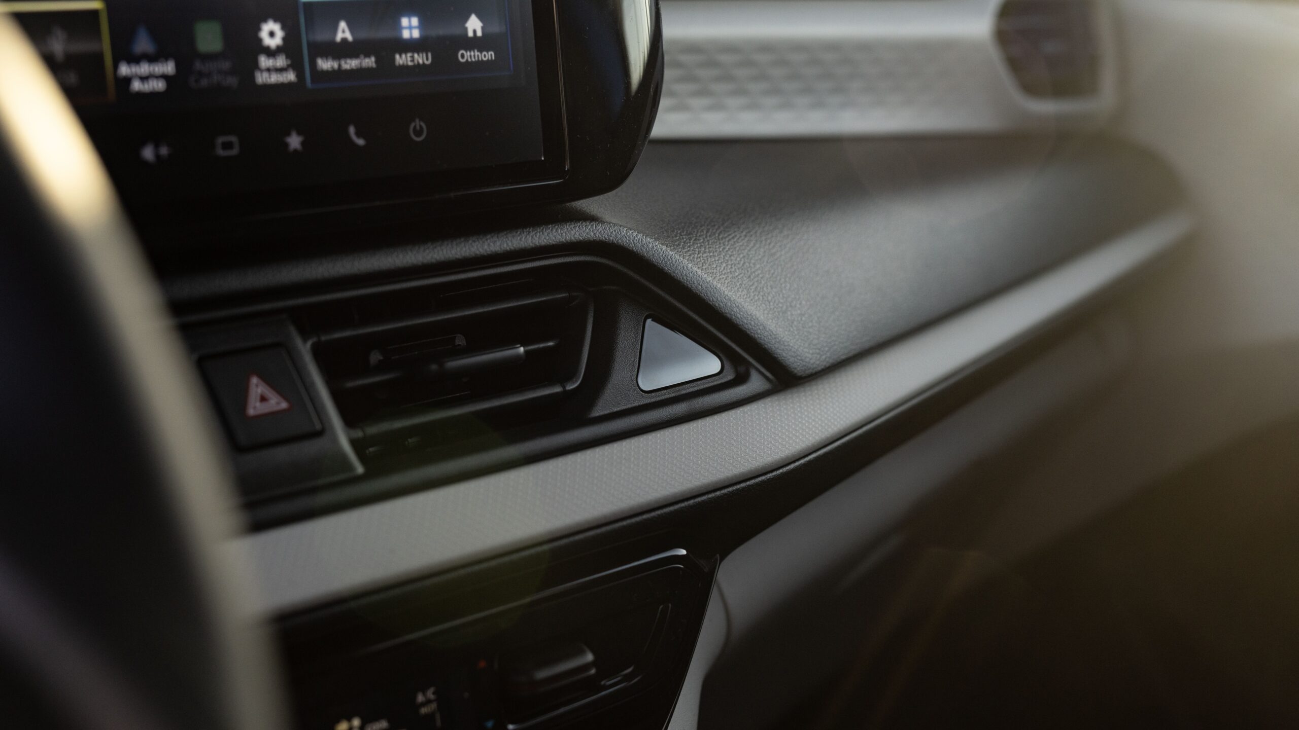 A műszerfalon található fehér berakás sokat dob az összhatáson. Sok a kopogós műanyag, de a kezelőszervek tapintása kellemes, a kormány karimavastagsága és átmérője tökéletes