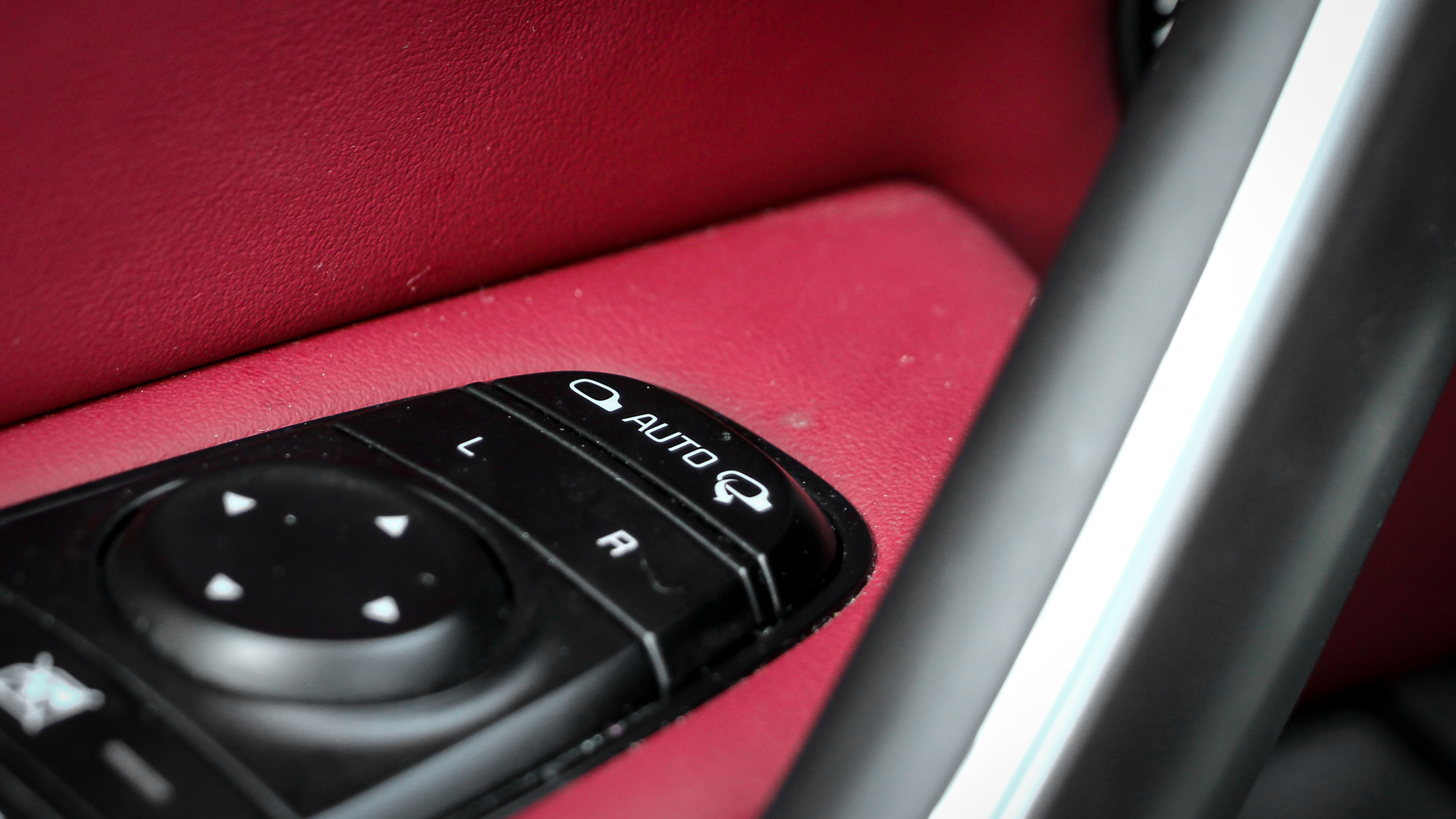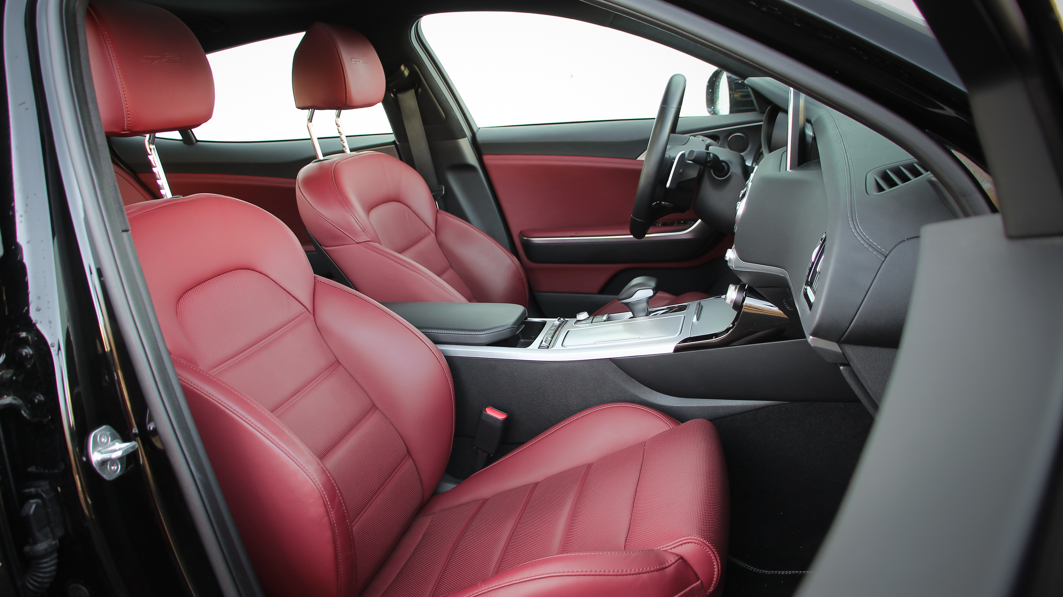 Izgalmas az utastér a bordó bőrkárpittal, az első ülések tartása és pozíciója szemtelenül jó, hosszú távon is rendkívül kényelmesek