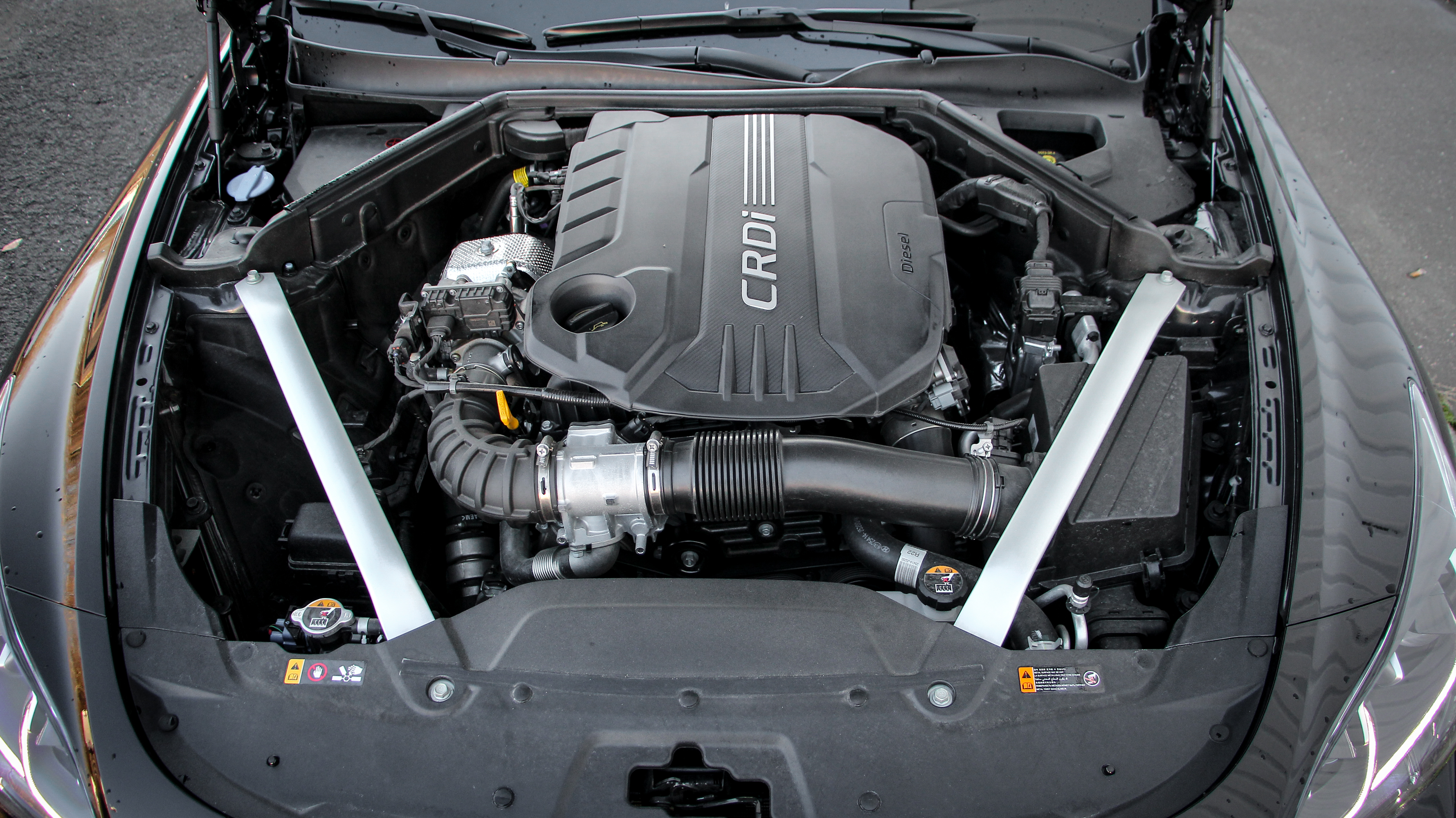 Ekkora dízelmotor már nem valami általános a kategóriában, a downsizing nem érte el teljesen a Kiát, vagy fogalmazhatunk úgy is, hogy a régi motorokat használták a Stingernél. Ez a dízelmotor sem valami fiatal, az R sorozatú 2,2 literes, vasblokkos közös nyomócsöves motor már jó ideje szerepel a koreaiak kínálatában. Leginkább a nagyobb modellekben volt elérhető, a Hyundai Santa Fe és a Kia Sorento is készült ezzel, de a Carnival orrába is került.