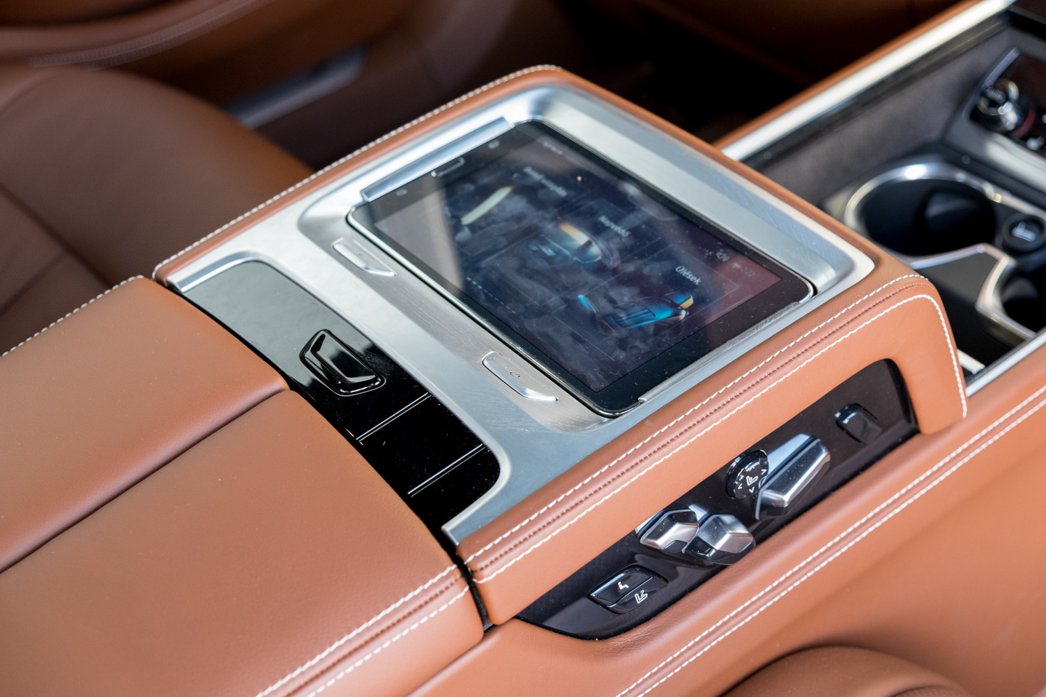 A kivehető tableten kezelhetjük a legtöbb rendszert, még a hangulatvilágítás árnyalatát és erősségét is, a világító V12 felirat a küszöbön nekem sok