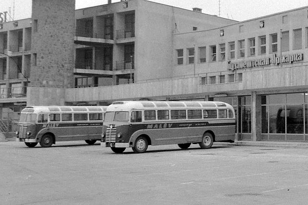 Utasokra várakozó Mávaut kisbuszok vidéken. A távolsági és elővárosi forgalomra szánt Ikarus 30-asok csak egy ajtóval rendelkeztek, tetejükre hátsó létrán megközelíthető csomagtartót szereltek, és a pótkereket a hátfalra erősítették