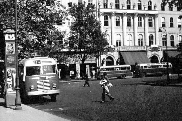 Vörösmarty tér, valamikor az 1950-es években. A fotó érdekessége, hogy jobbra hátul az első busz Rába Tr 3,5, mögötte pedig az ebből a típusból fejlesztett Ikarus 30 áll - jól látható a járművek közötti méretkülönbség. A 30-as nagyobb volt, mégsem vált be a leginkább 100 férőhelyes szóló buszokat igénylő Budapesten