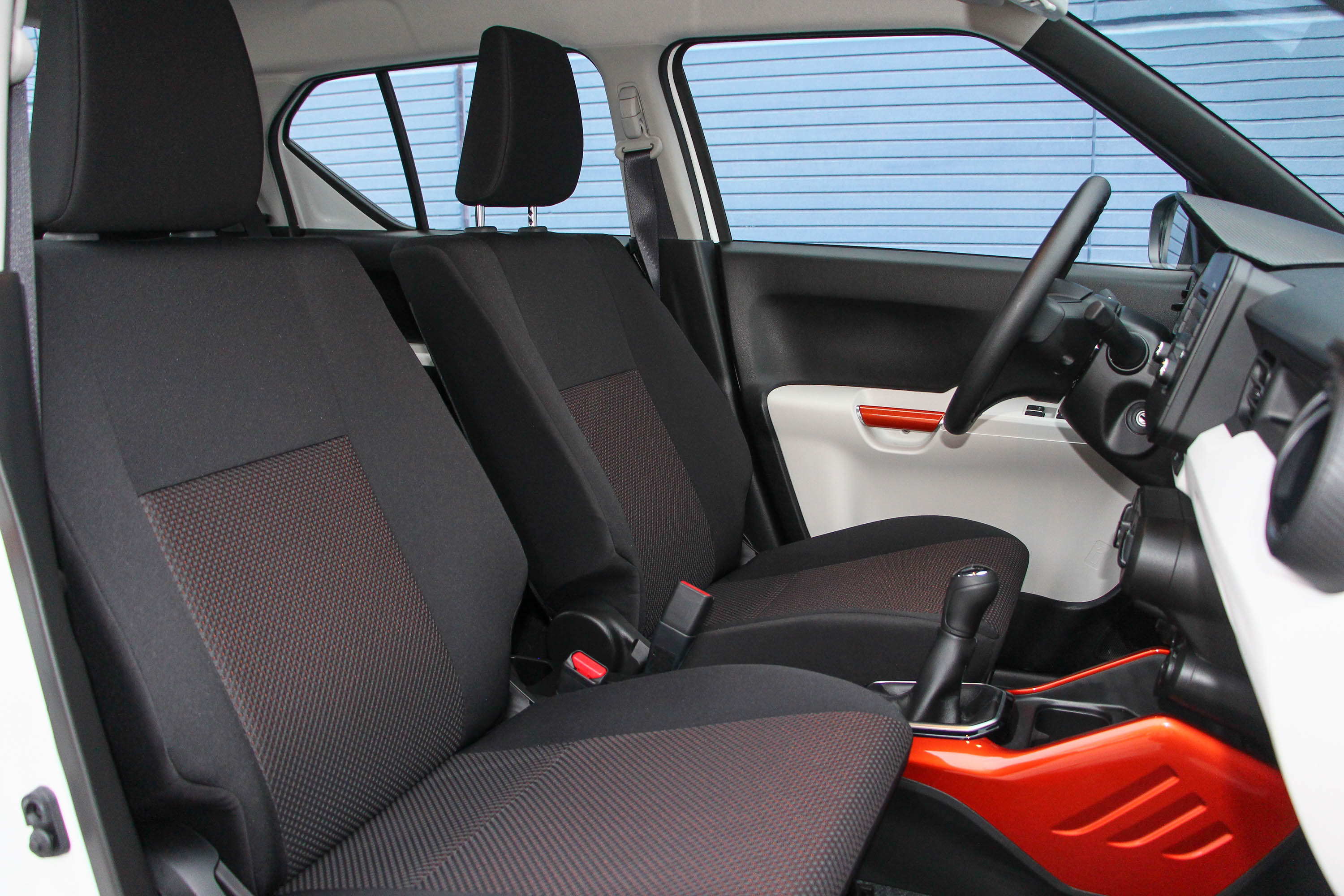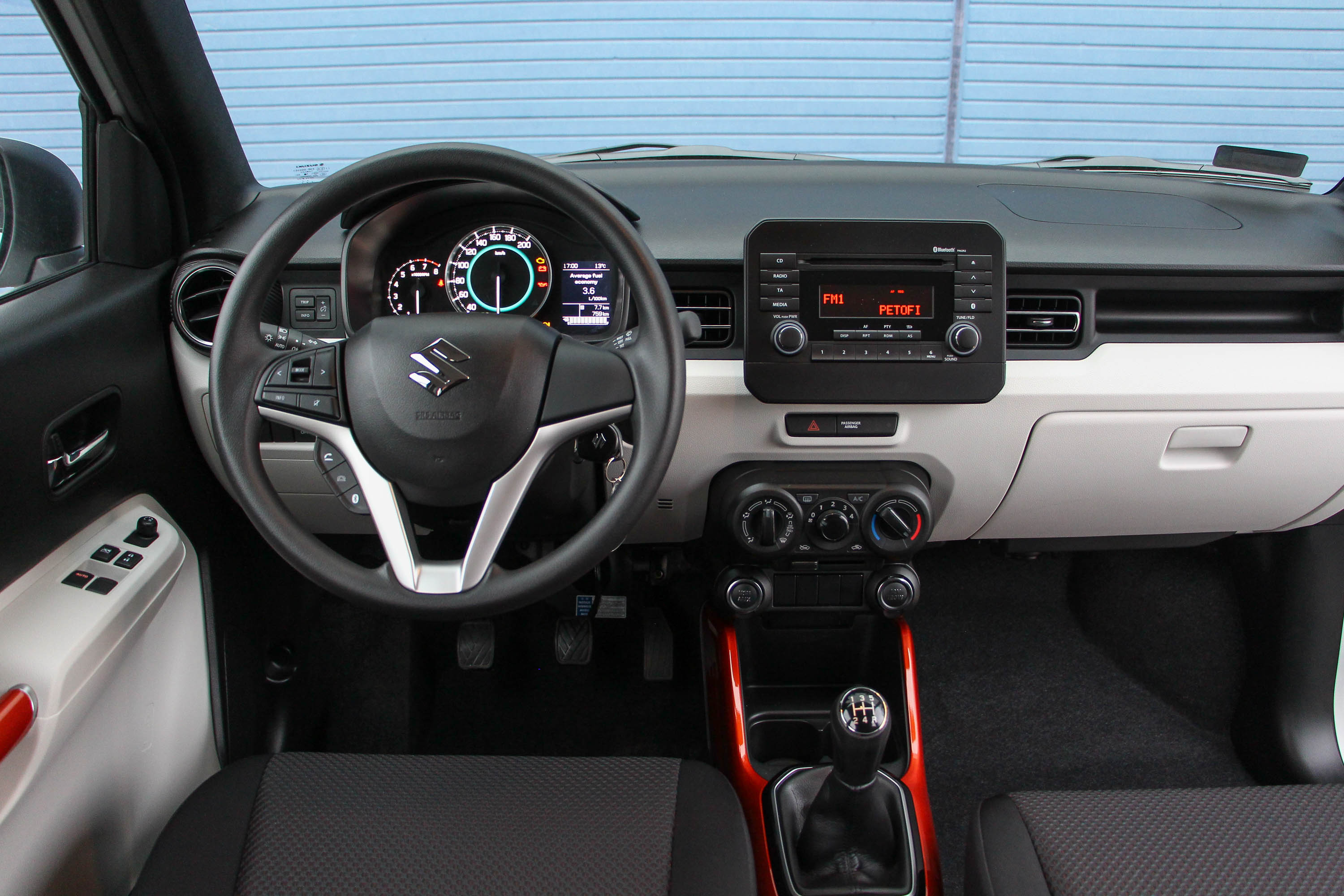 Belülről még gusztusosabb. Kívülről is korrekt az Ignis megjelenése, de igazán akkor esik le az állunk, ha beleülünk. Kéttónusú, ahol kell világos beltér, ráadásul még narancsszínű betétek is fokozhatják az izgalmat, például az ajtóbehúzókon és a középkonzol alsó részénél. Apró szépséghiba, hogy utóbbi felső felfogatási pont híján az elöl ülők térdével találkozva jobbra-balra mozog, ám ezen simán túllendülünk. Az anyagok ugyanis kisautós mércével abszolút rendben vannak, hibátlan az ergonómia, elöl egész hosszúak, hátul csak palacktartósak az ajtózsebek. Az első ülések a tágasnak tűnő, ám valójában nem egész 1,4 méteres belső szélességű kisautóban drabálisnak tűnnek, de ez kell ahhoz, hogy ne legyenek csenevészek. Kisautós mércével kényelmük is megfelelő. Meglepetés, hogy felnőttként is kényelmes a hátsó ülés, ott két kategóriával nagyobb a lábtér, az Ignis négy felnőtt számára abszolút vállalható autó.