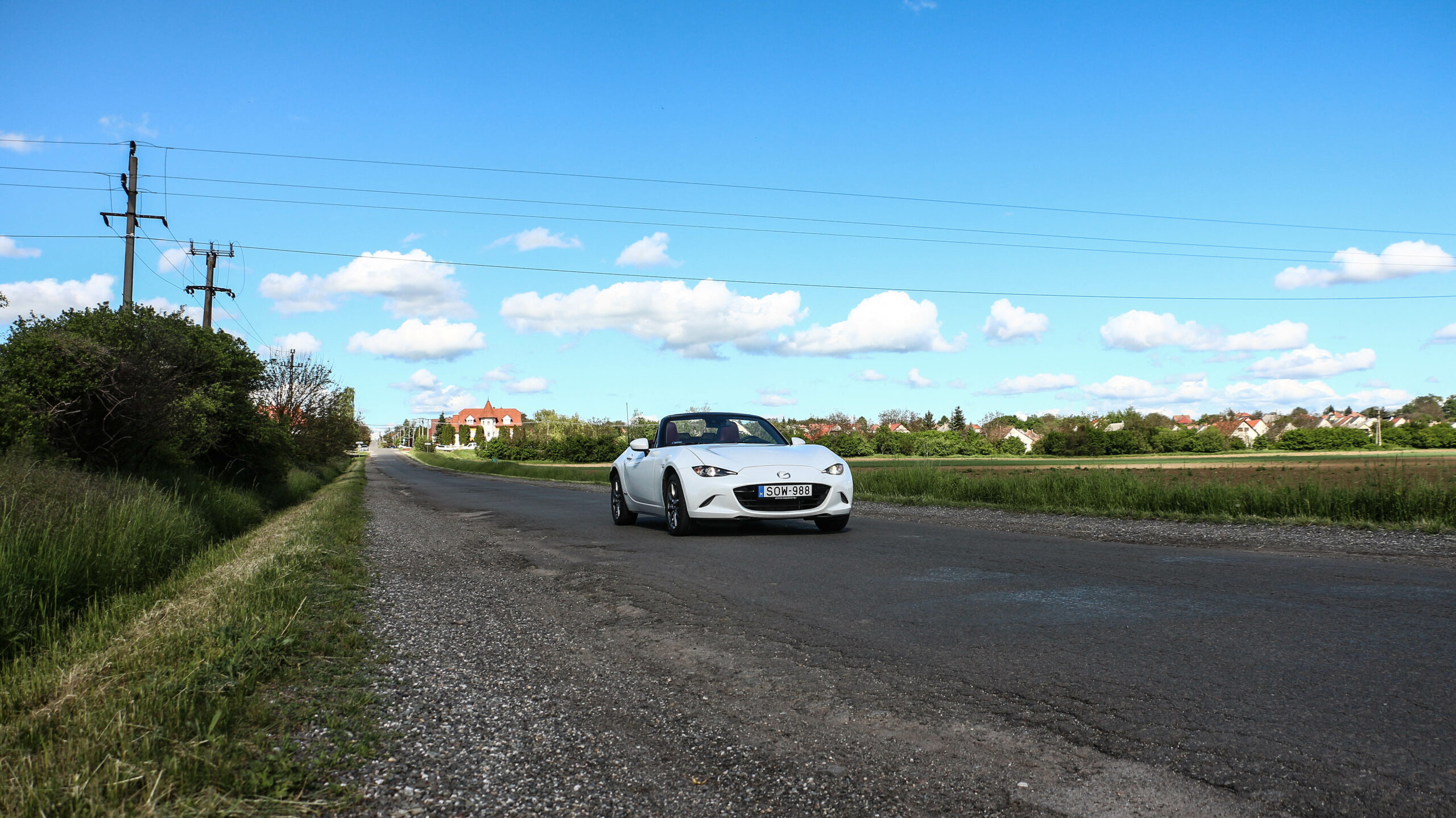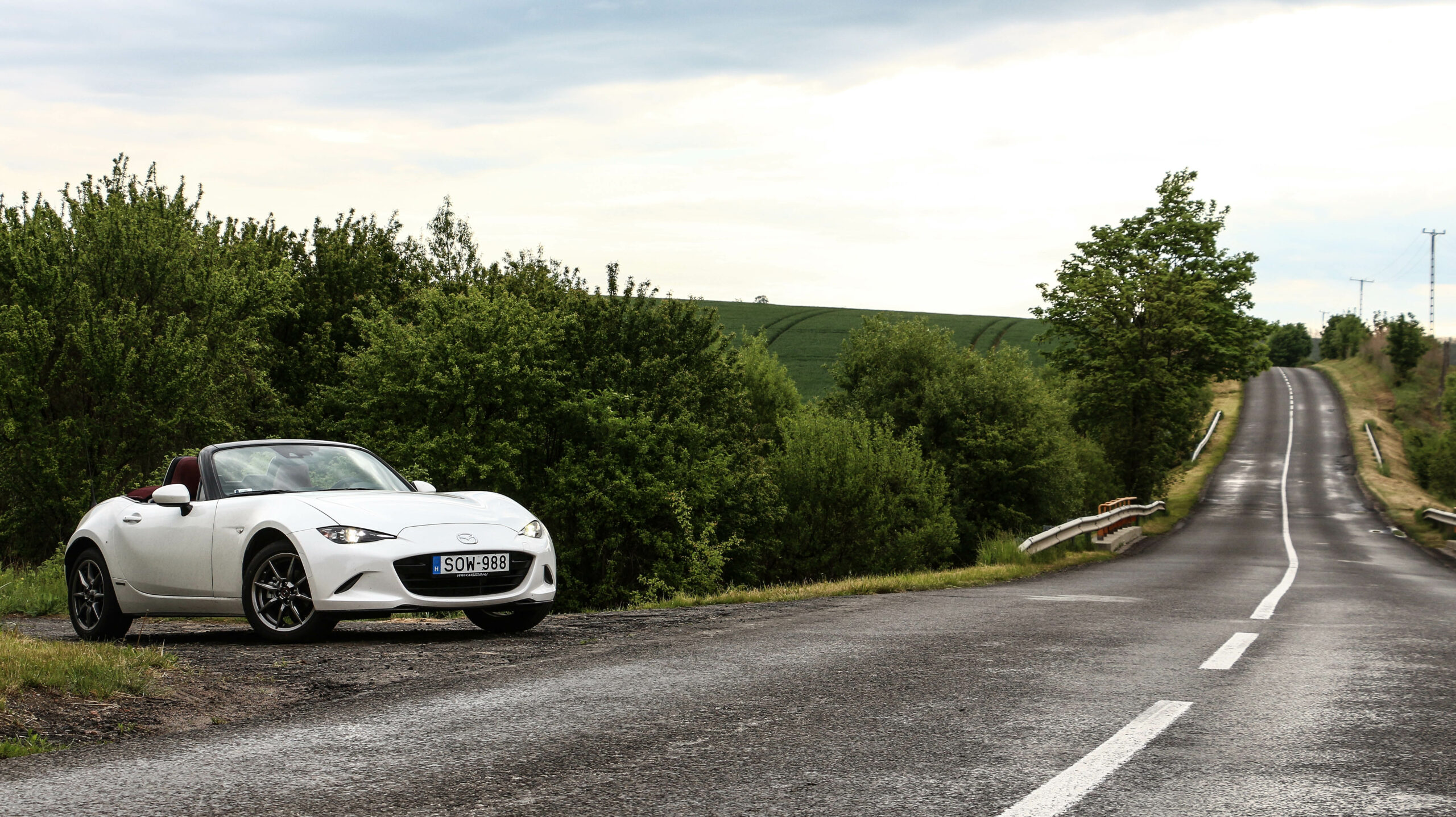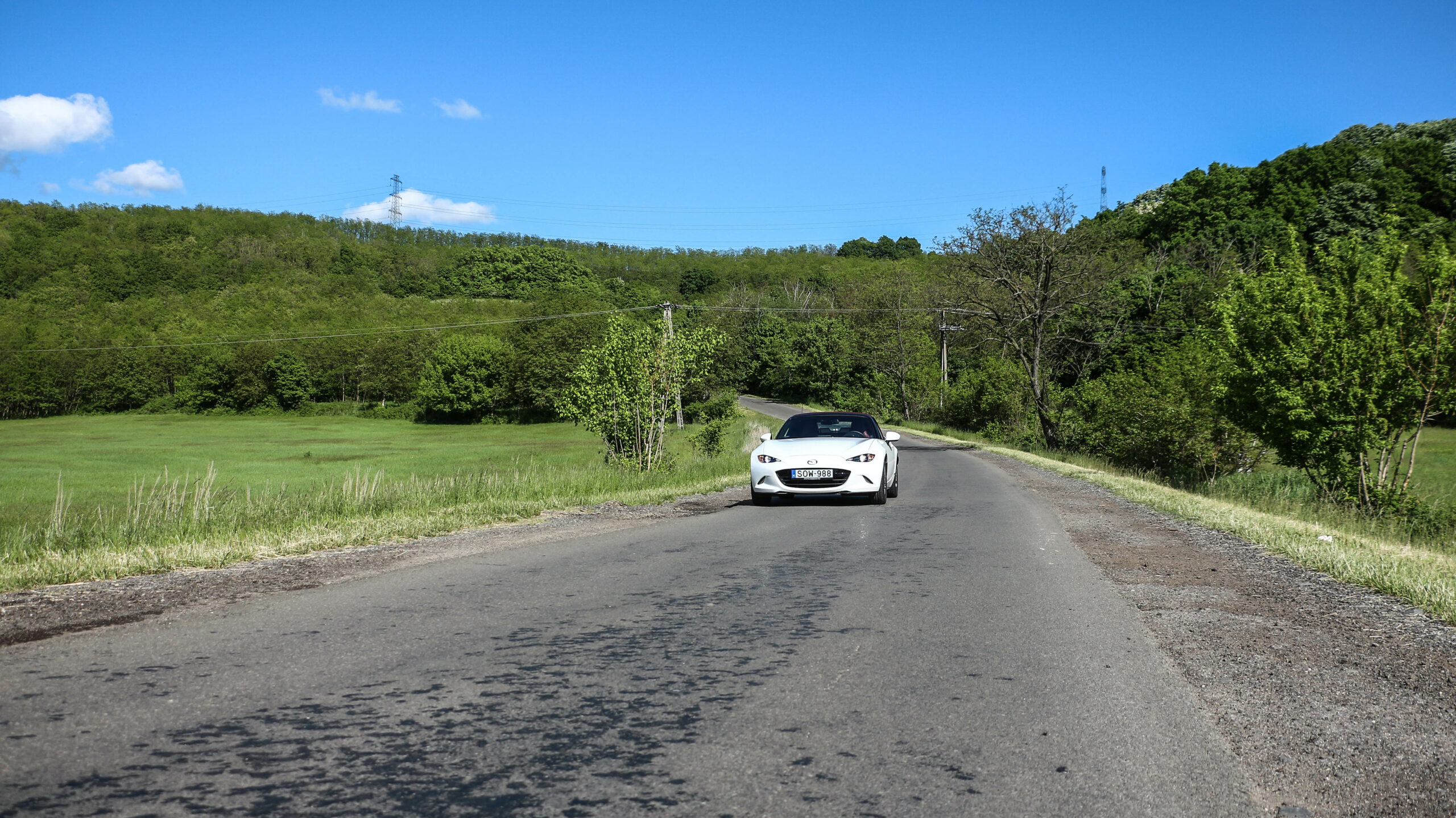 Lehetne kristálytisztára sikálva egy bemutatóteremben is fotózni, de az MX-5 így őszinte: egy kiváló szerpentinezés koszával az oldalán, megannyi élmény után a dombsági mellékút szélén