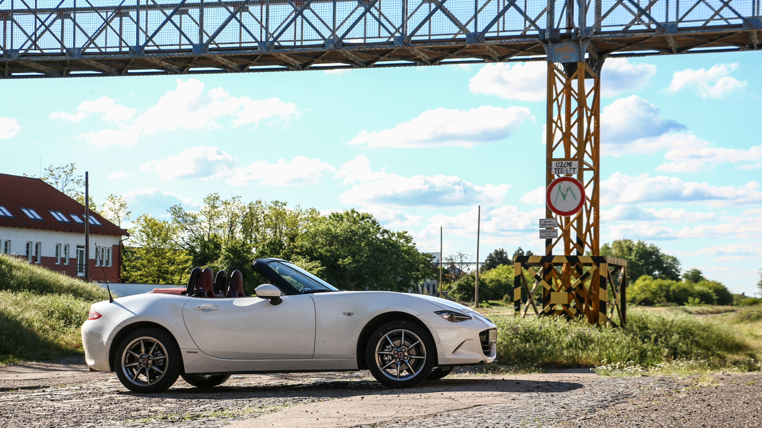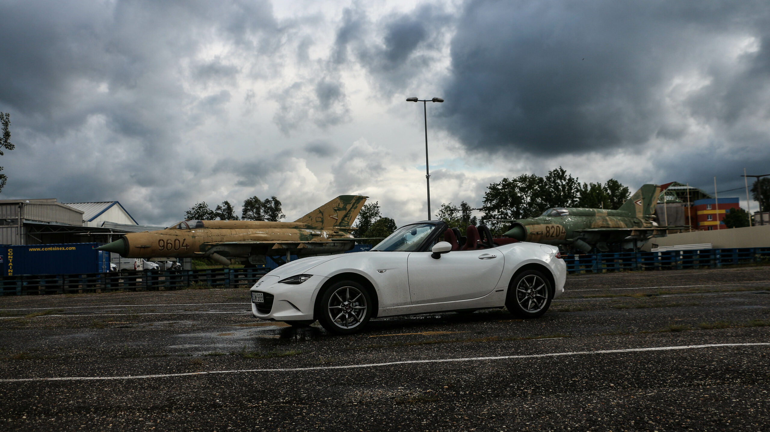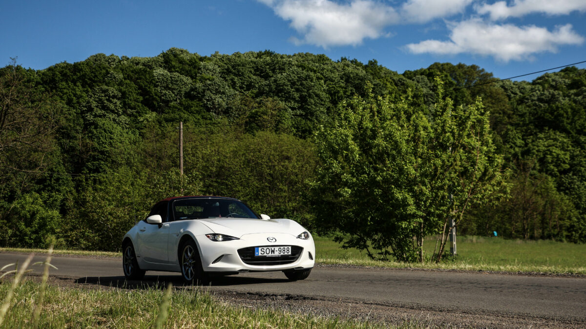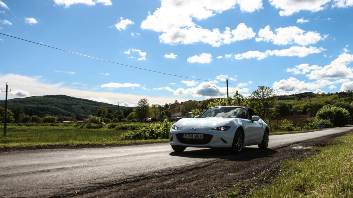 Lehetne kristálytisztára sikálva egy bemutatóteremben is fotózni, de az MX-5 így őszinte: egy kiváló szerpentinezés koszával az oldalán, megannyi élmény után a dombsági mellékút szélén