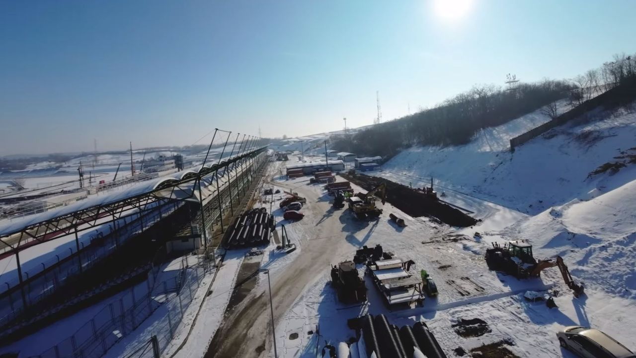 Munkagépek és teherautók népesítik be a fehér hóréteggel betakart Hungaroringet (fotó: Hungaroring)