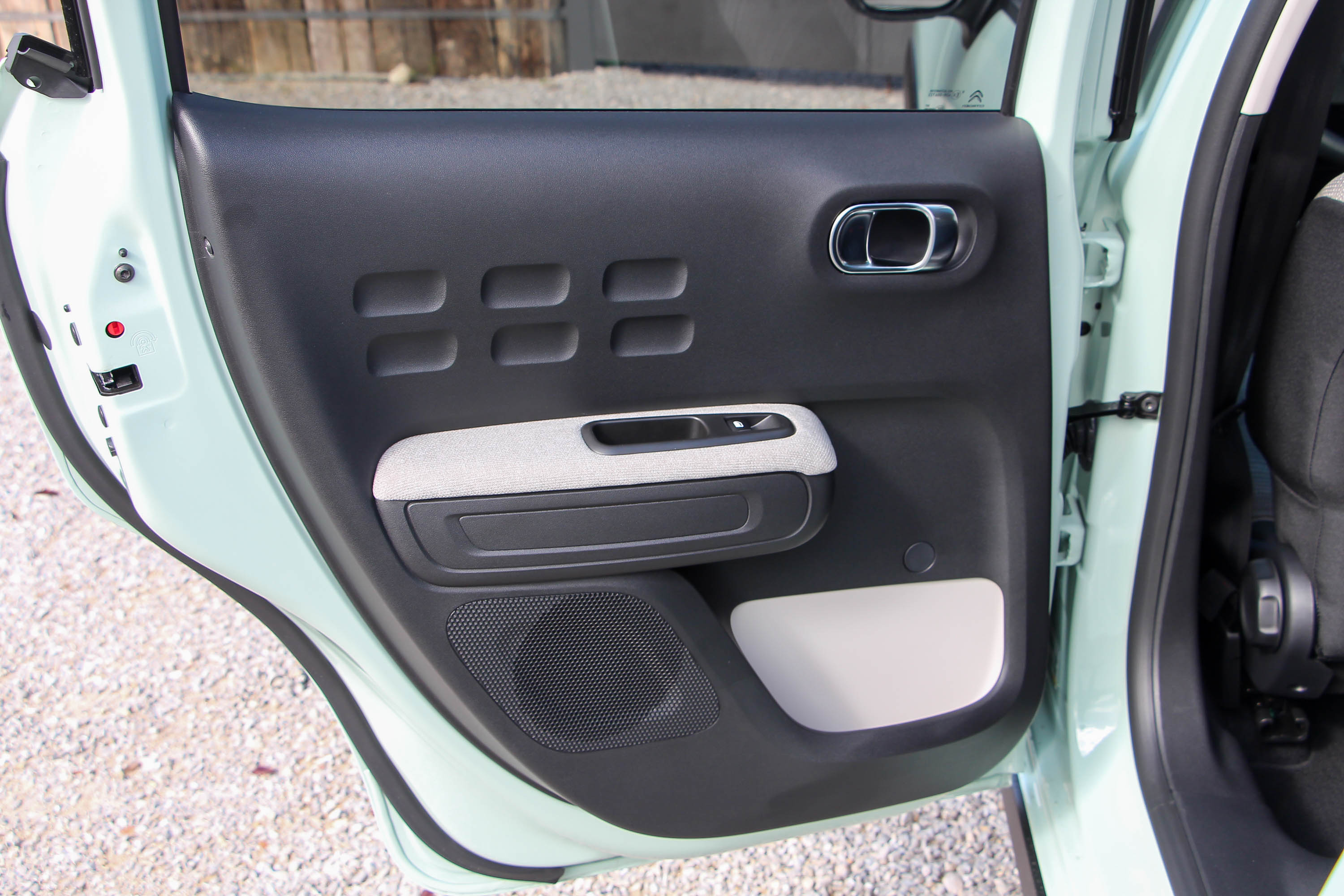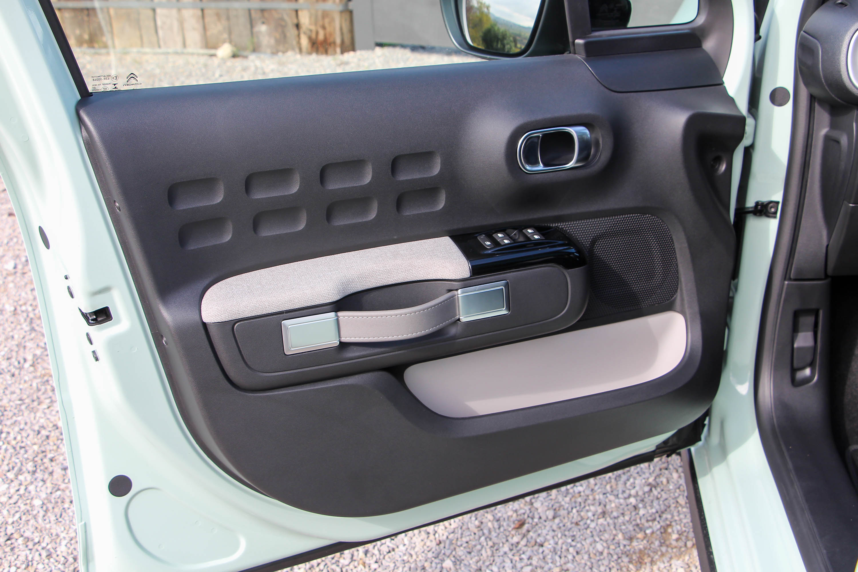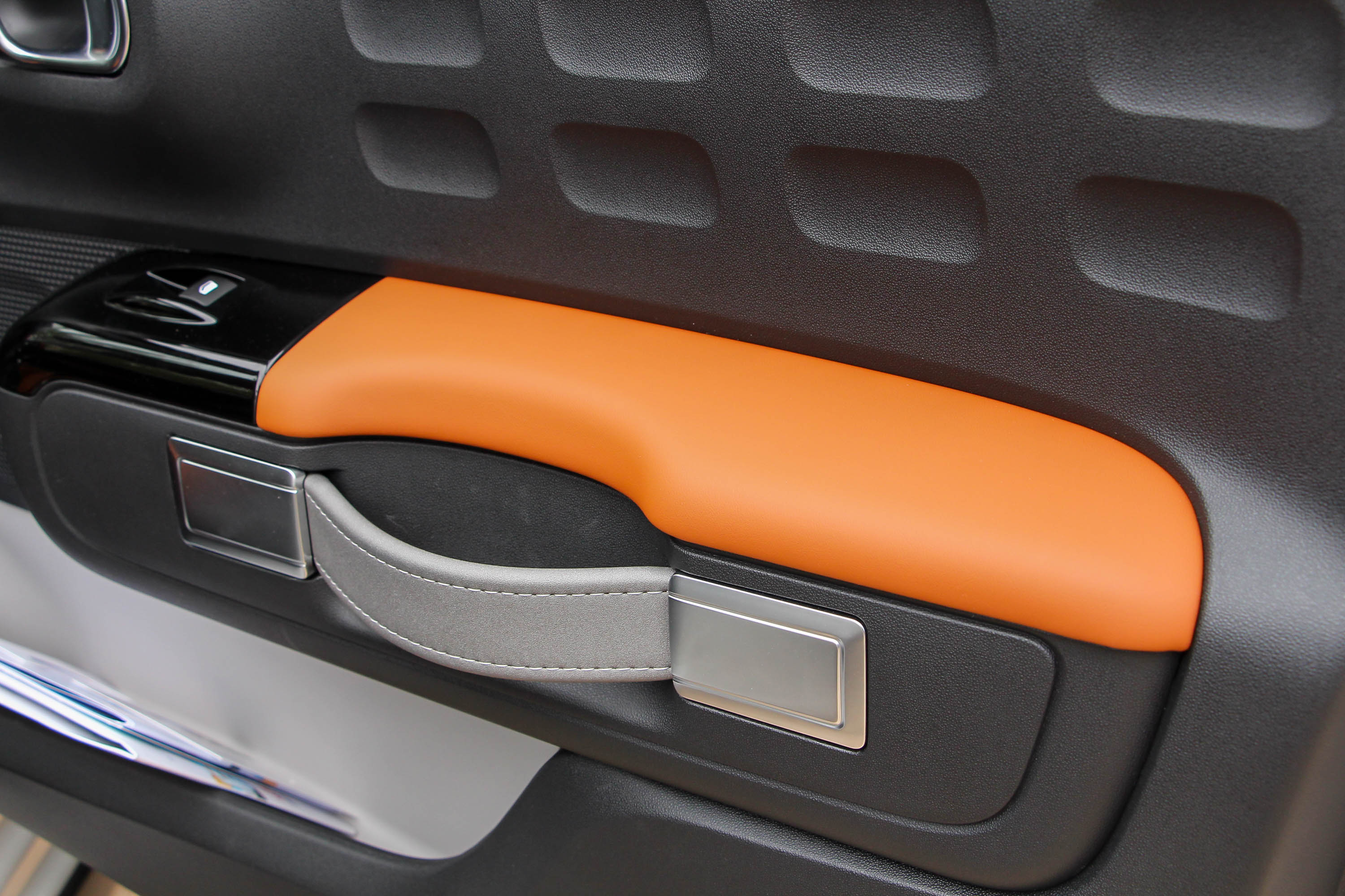 Elöl-hátul vidámak a nagy zsebeket adó ajtókárpitok is, az első behúzó olyan, mint az autó egésze: üdítően egyedi