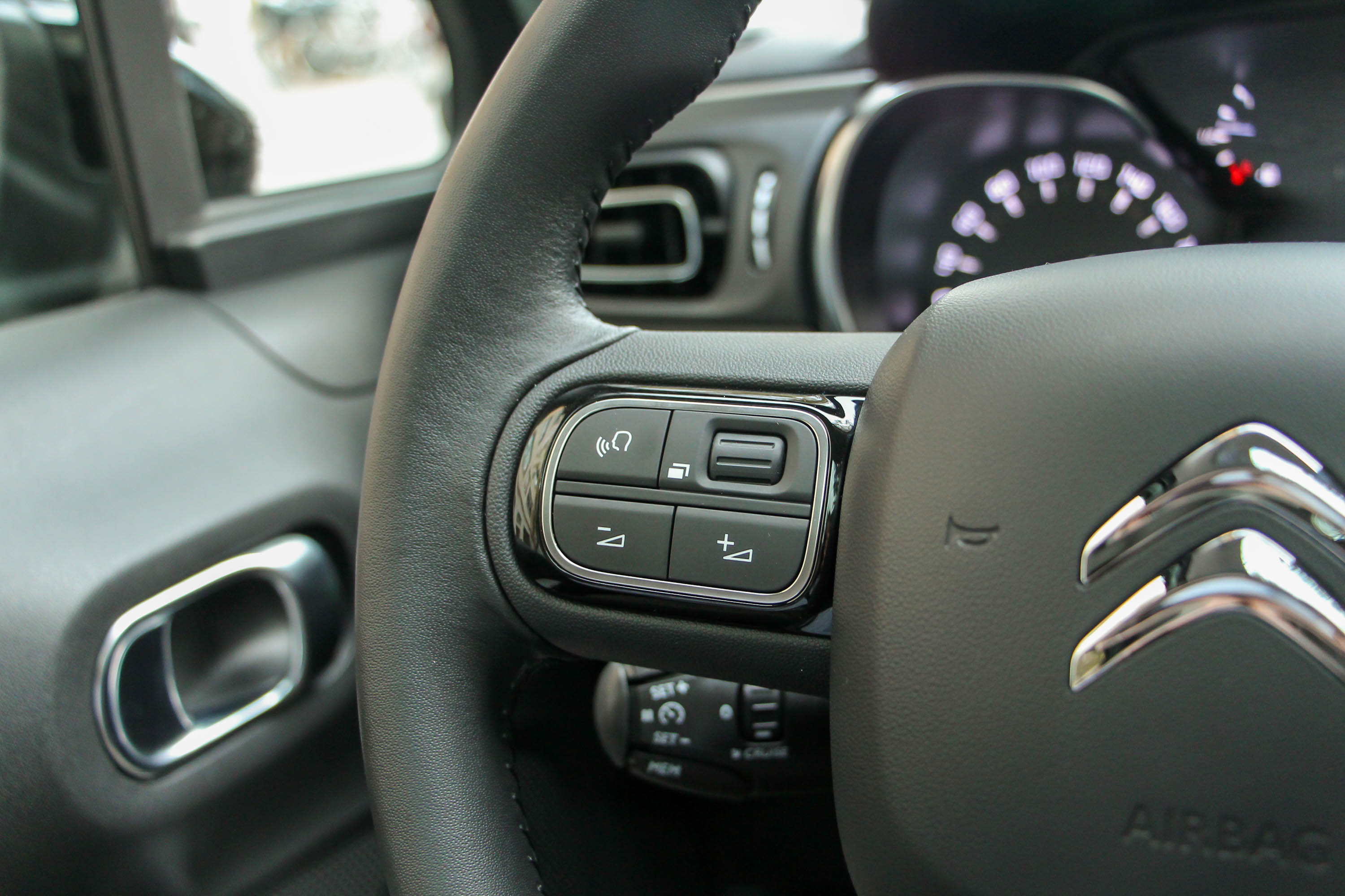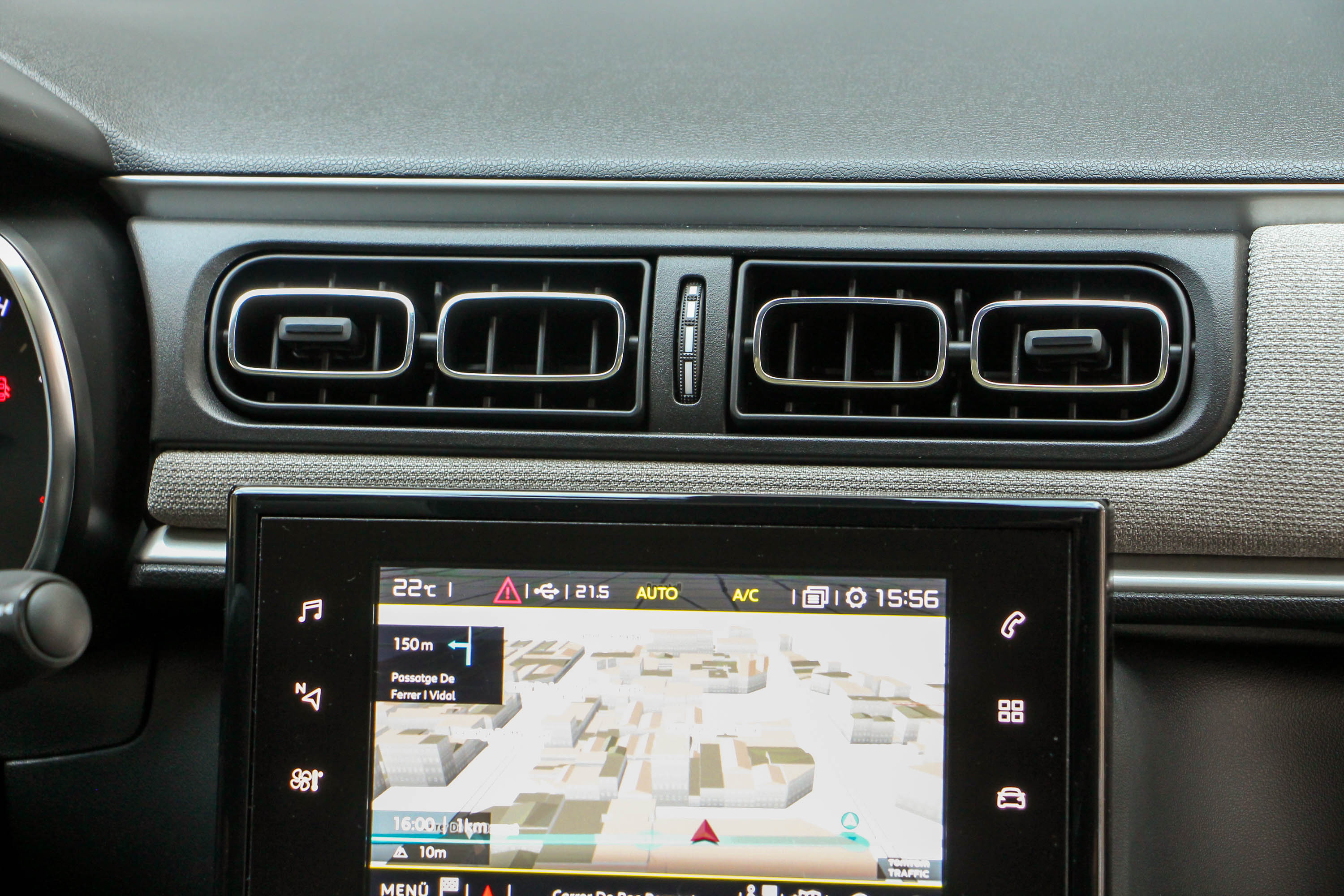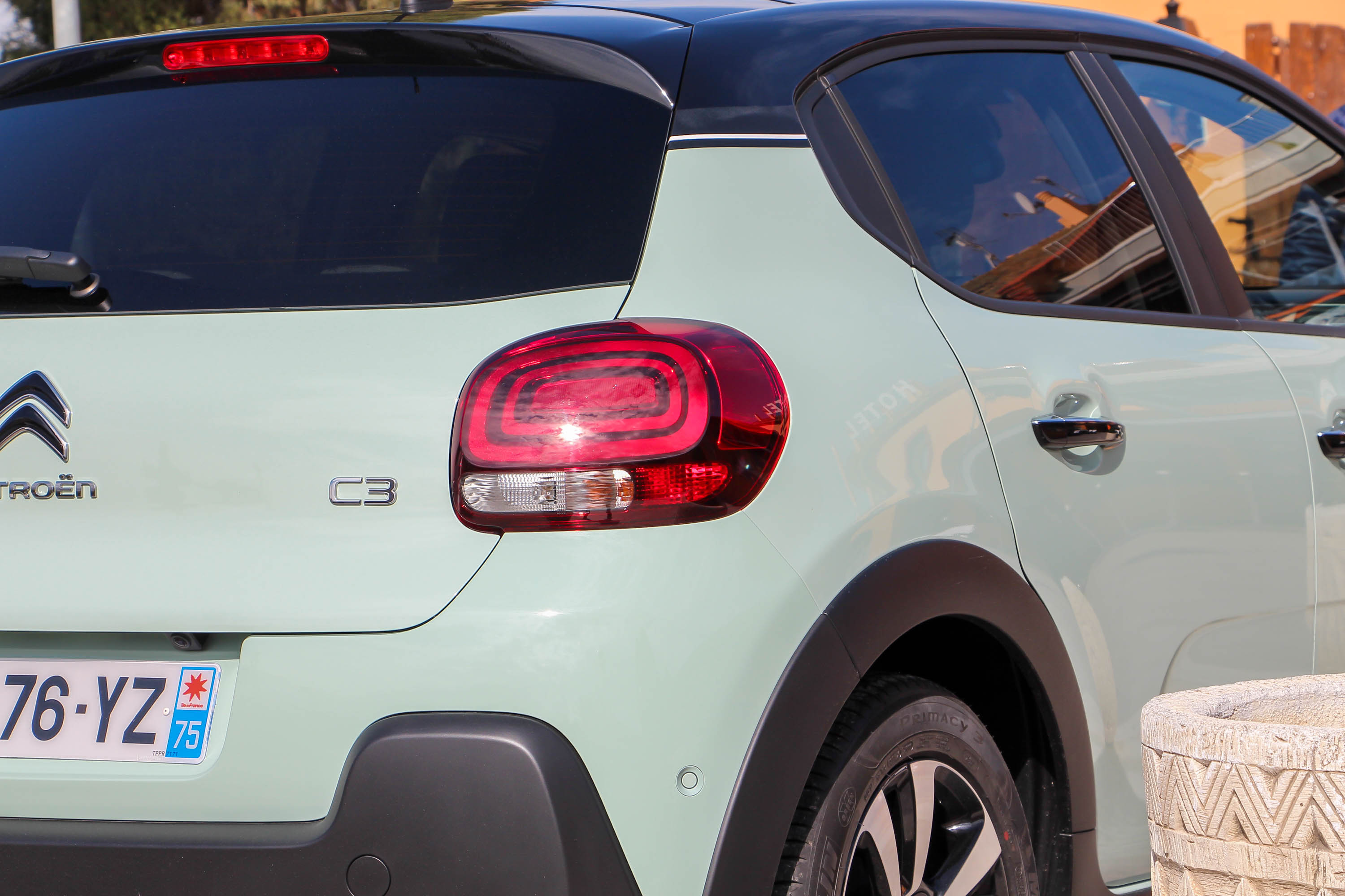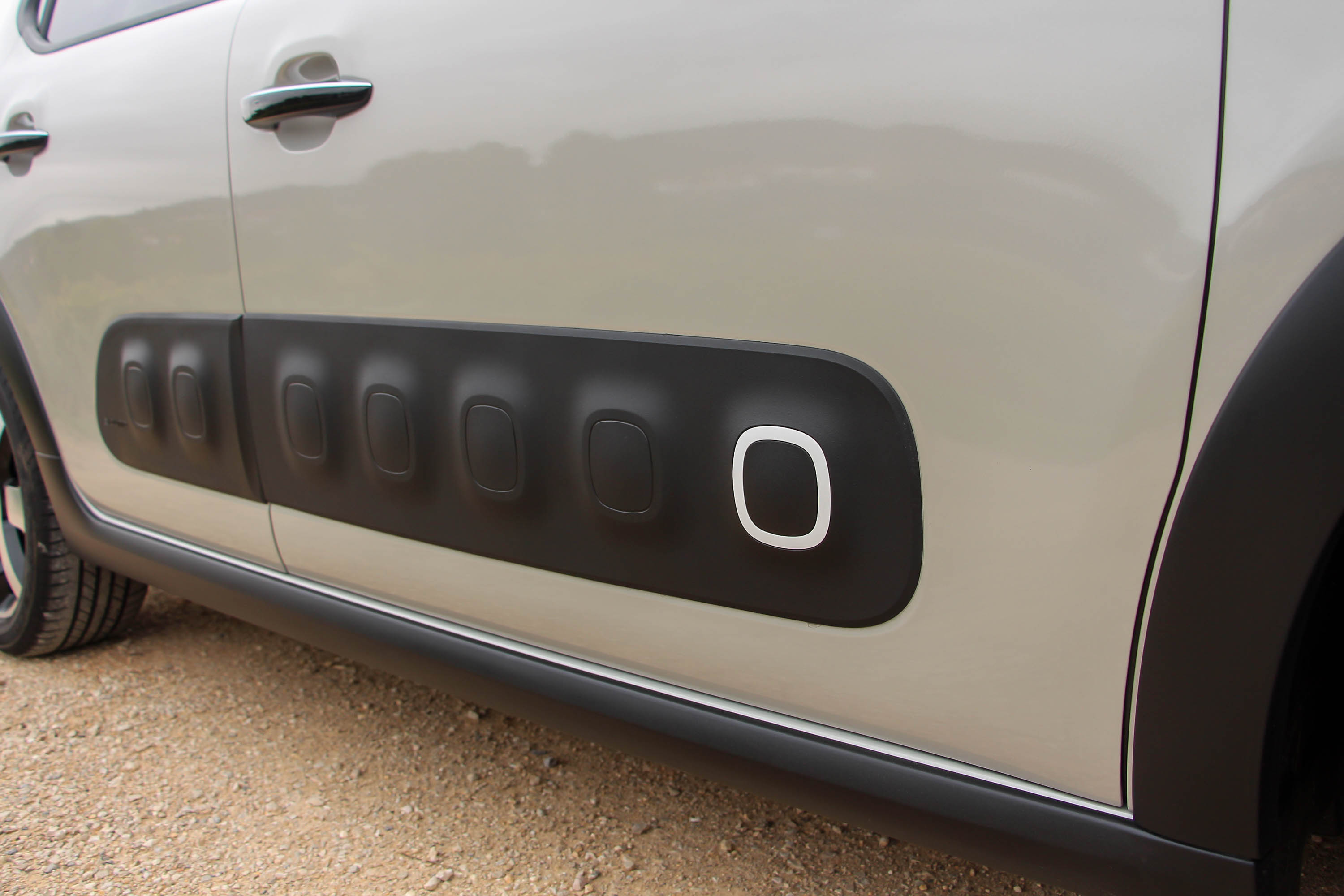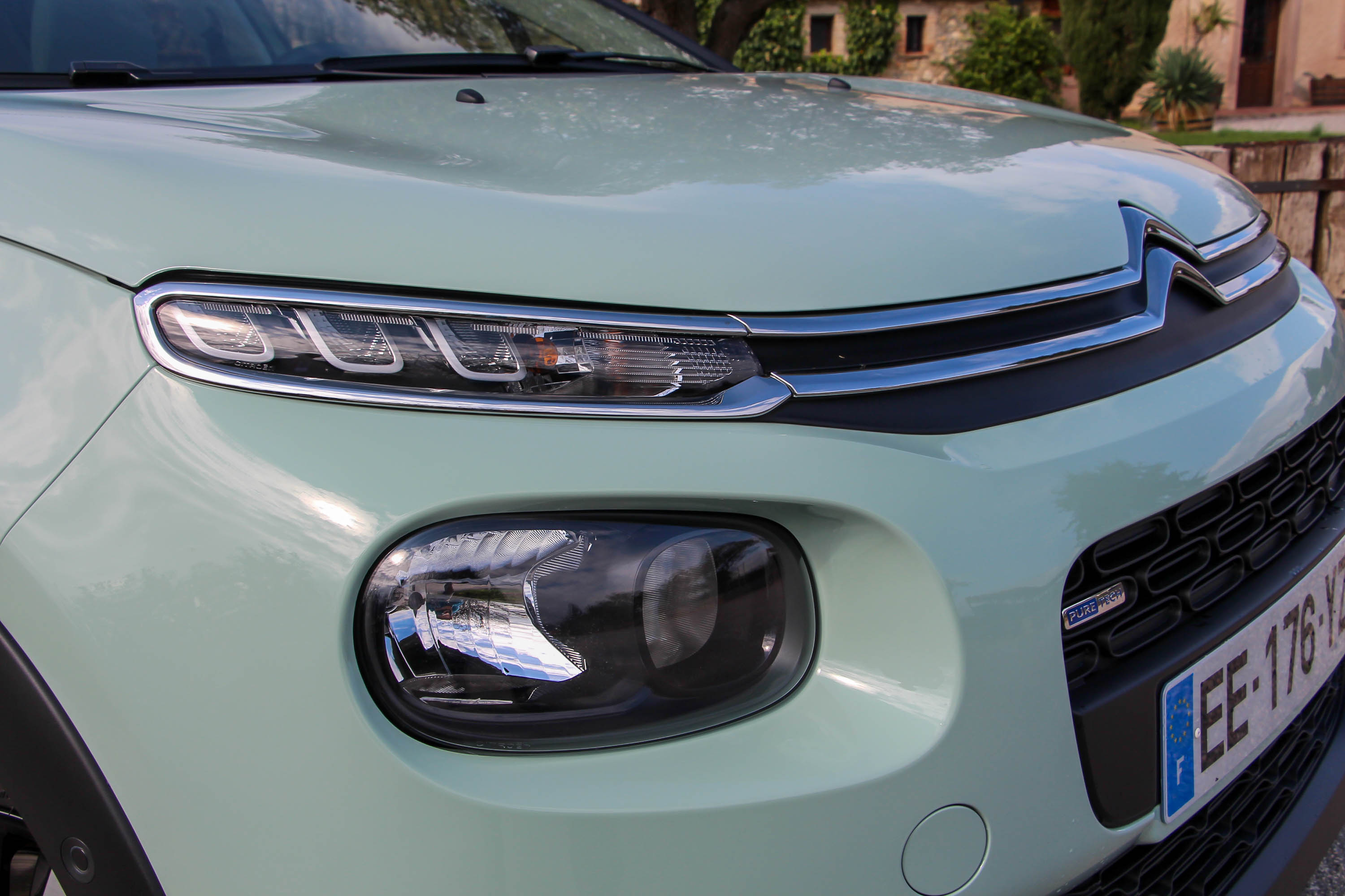 A lökhárítók, a küszöbök és a kerékjáratok fényezetlen műanyagburkolatával, na meg az opciós Airbump betétekkel kisautóból már-már crossoverré fejlődött a harmadik generációs C3, pedig magassága csökkent. Oldalanként három blokkra osztott fényszórókiosztása az idén szintén frissített C4 Picassóéra hasonlít