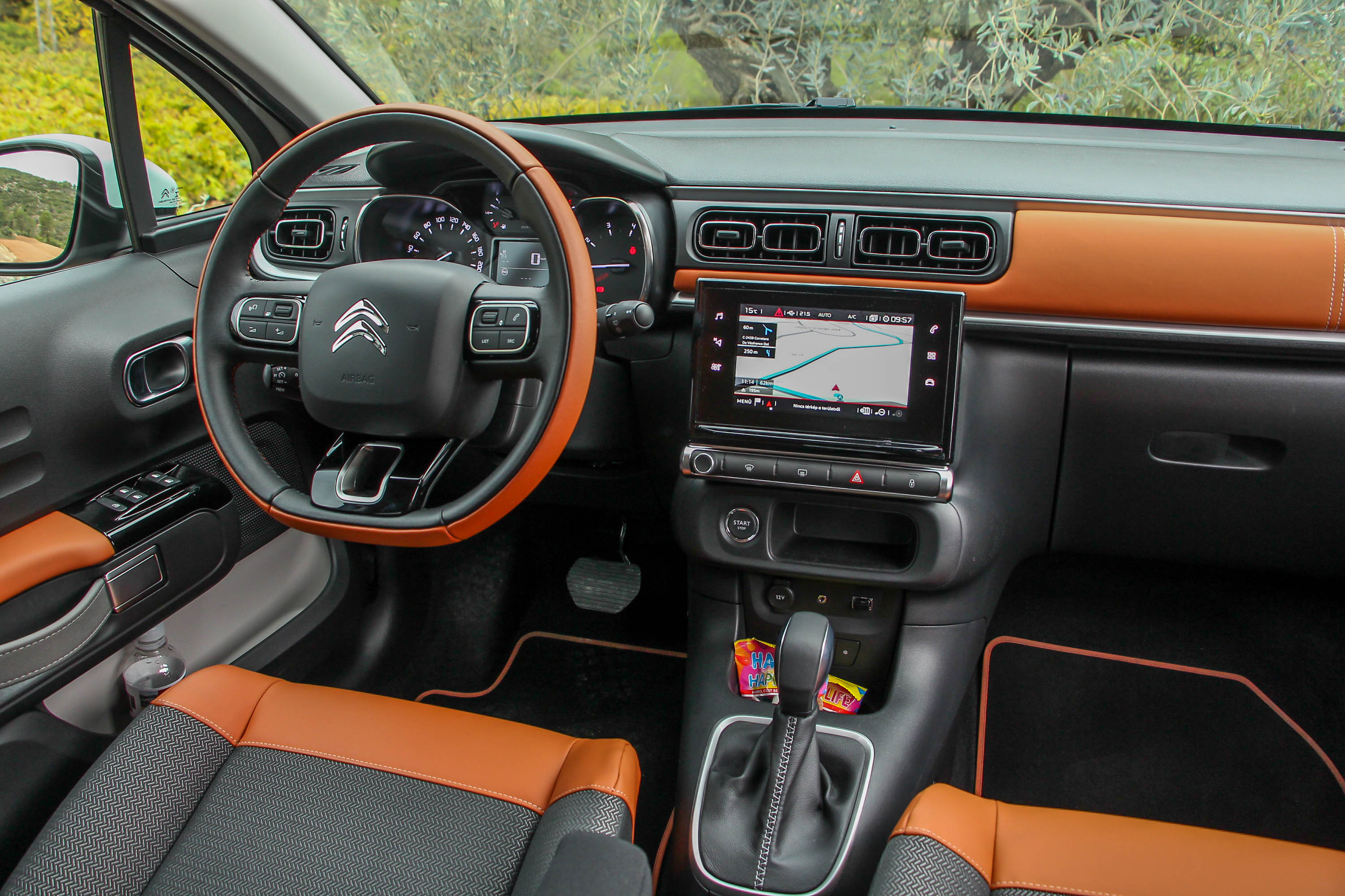 A 110 lóerős, turbós benzines már a dízelekhez hasonlóan alapáron stop-start elektronikás. Érthetetlen, hogy a kisebb teljesítményű, feltöltő nélküliekhez miért nem kapható az, legalább opcióként. A stop-start átlagos gyorsaságú, utána viszont a turbós benzinessel kifejezetten dinamikusnak bizonyult a C3. Ami pedig igazán meglepő: ezzel a motorral már egészen komoly utazóautó, még az autópályás 130 km/óra is 3300/perc alatti fordulattal, egészen csendesen futható vele. A hatfokozatú (japán, Aisin gyártmányú) automata gyorsan, de robotváltósan csúsztatásmentesen kapcsol. Lejtőn, illetve lassuláskor okosan visszakapcsolgat, szépen teszi a dolgát. A nagyobb teljesítmény kézi váltóval az NEDC norma szerint nem hoz többletfogyasztást, a valós körülmények közötti norma szerint viszont automataváltóval együtt már 0,8 literes többlet számolható, ezt a saját próba is igazolta, a 6,8 l/100 km automataváltós vegyes és valós érték azonban még mindig elég jó.