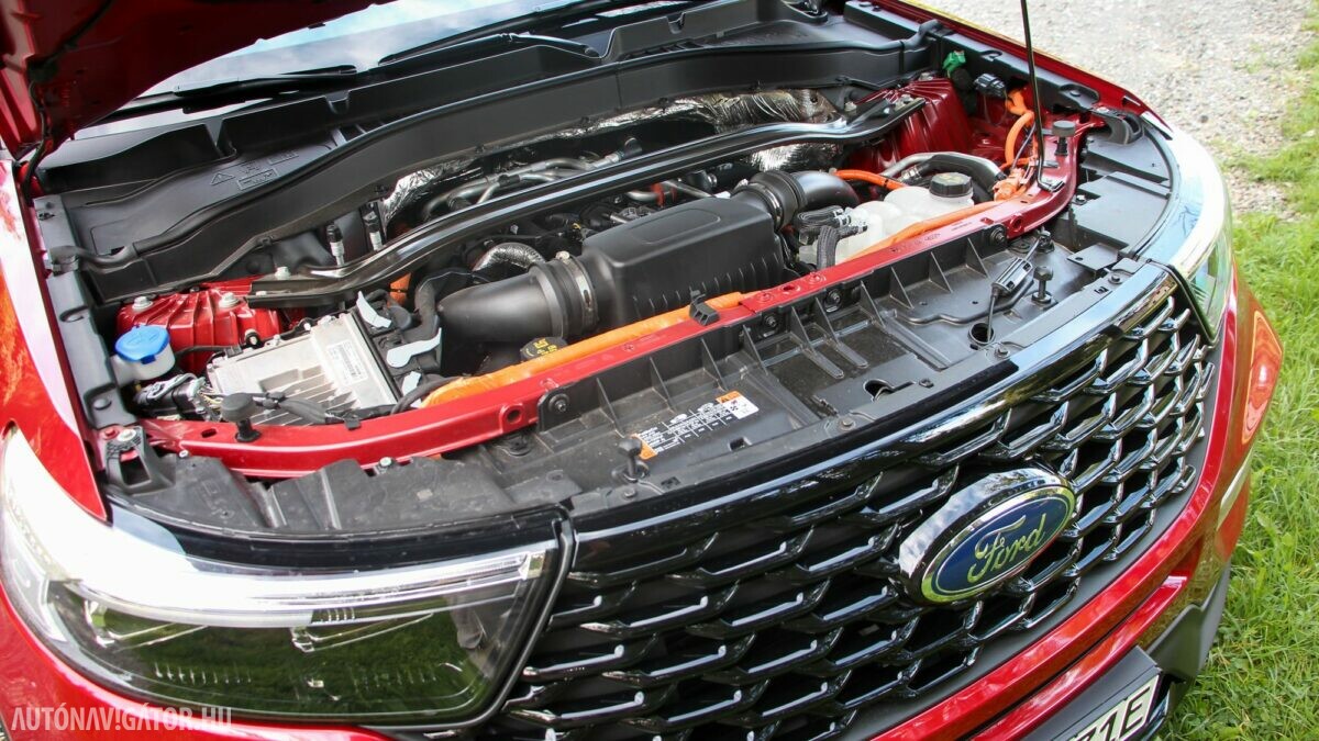 Kuga PHEV, a Ford legerősebb hibridjének számító Explorer is tud mindenféle üzemmódot: tisztán elektromosat, akkutöltés megtartást, automata energiamenedzsmentet, illetve akár fel is tölthetjük az akkumulátort a benzinmotor által. Bár ez is paralel hibrid, azaz a két motor, a 75 kW-os (102 lóerős) elektromos és a benzines képes egyszerre is hajtani (és így 457 lóerős rendszerteljesítményt adni!), a működési elv teljesen más, mint mondjuk a Kugában. Míg utóbbiban a Toyota iskoláját követte a Ford, itt teljesen mást: saját és hagyományosnak mondható, persze alumínium hengerfejes, nagynyomású és közvetlen befecskendezésű a kétturbós és 3,0 literes, V6-os benzinmotor, amihez a villanymotorral kiegészített 10 fokozatú (eredendően az egyebek mellett a Mustangban is megtalálhatóból származtatott) automata váltó csatlakozik.