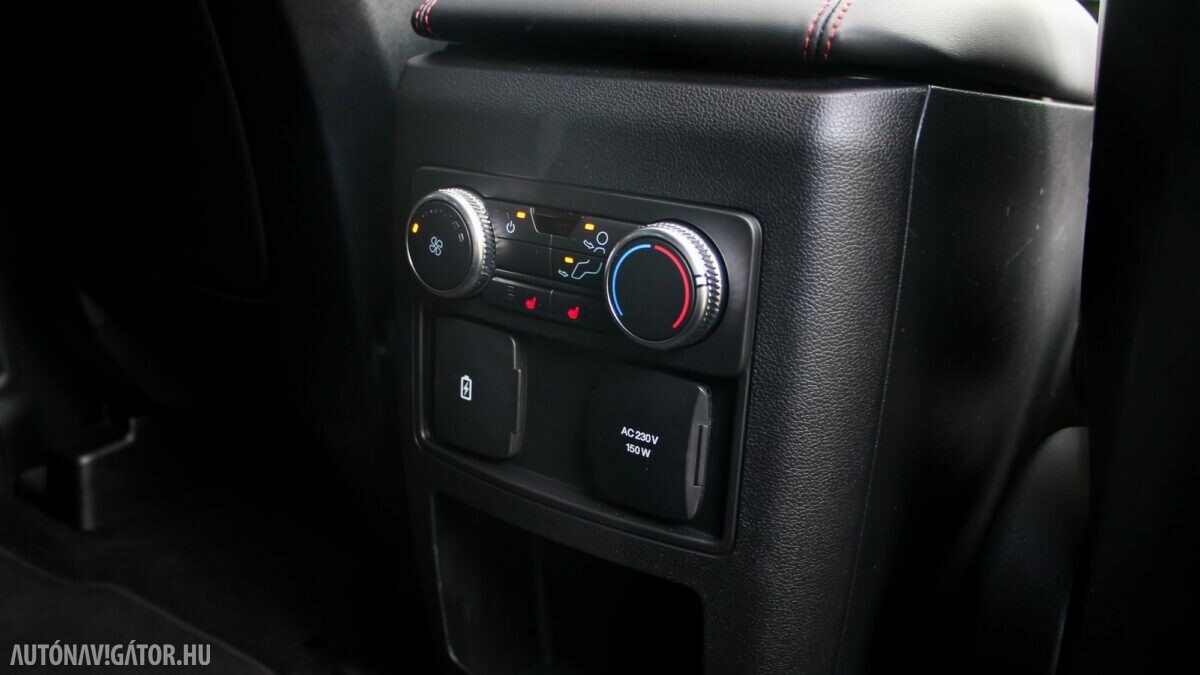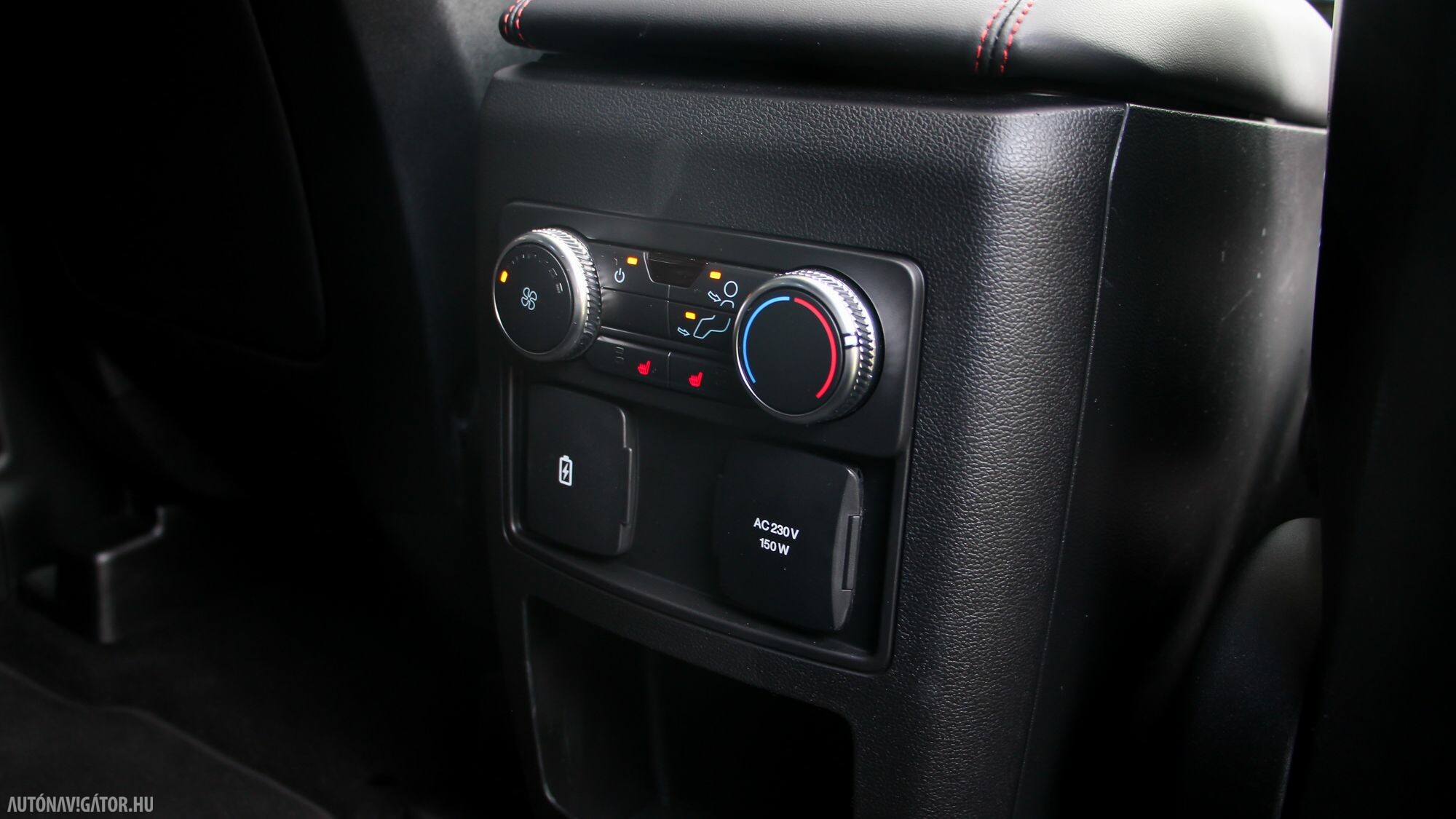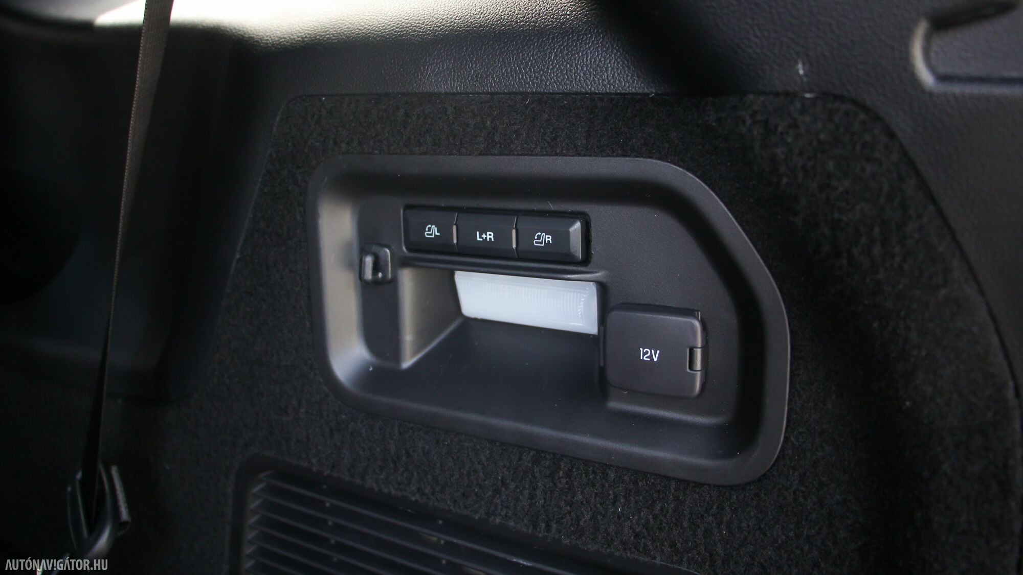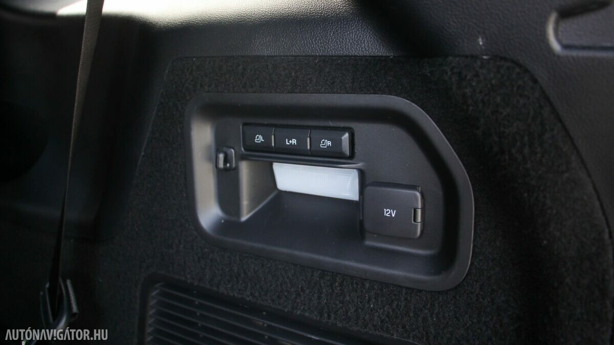 Dupla (hagyományos és USB-C) első és második üléssorába is jutott, 12V-os csatlakozókból is van bőven. A légkondi háromzónás: elöl oldalanként digitális (dedikált gombos) vezérléssel, hátul tekerőkkel. Ülésfűtés és hagyományos 230V-os konnektor is van hátul, ahogyan napfényvédő roló is. A két hátsó oldalajtóra kézzel húzhatjuk fel az árnyékolót, a nagyméretű és nyitható (alapáras) napfénytető sötétítője azonban üveglapjához hasonlóan elektromos mozgatású.